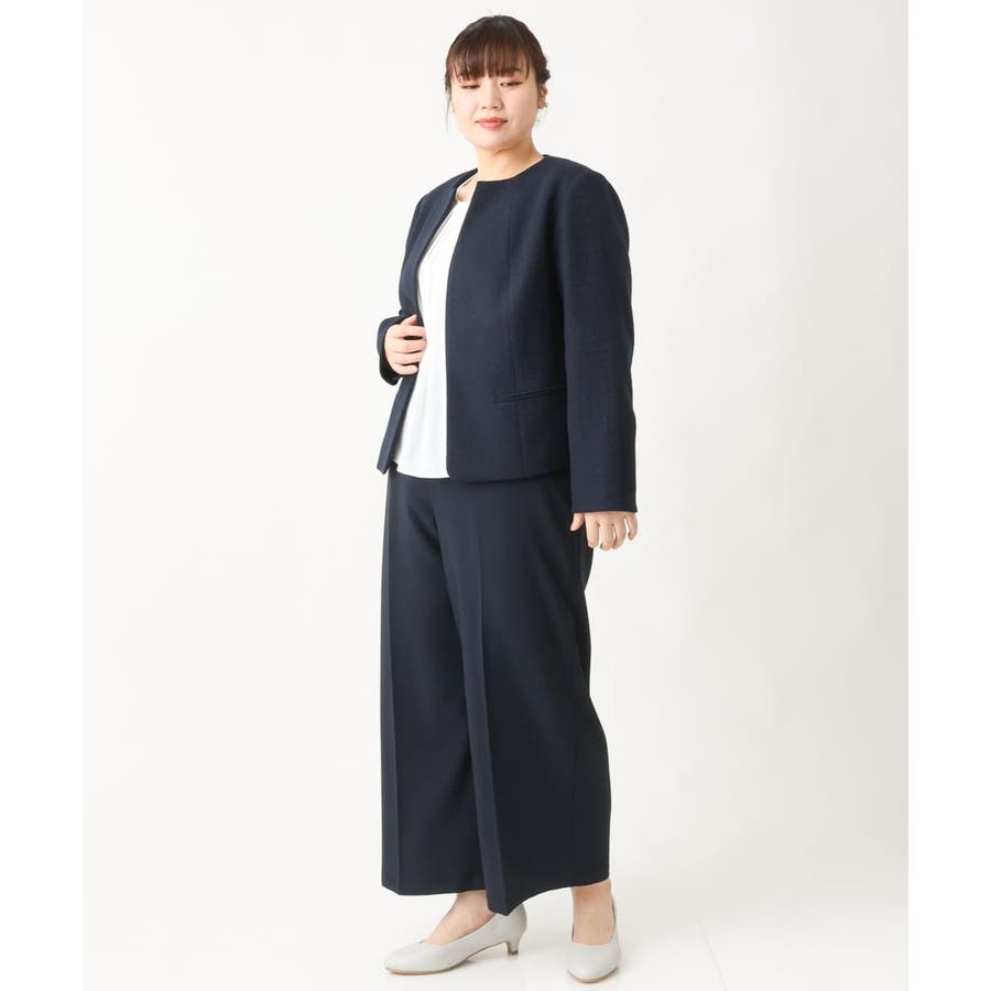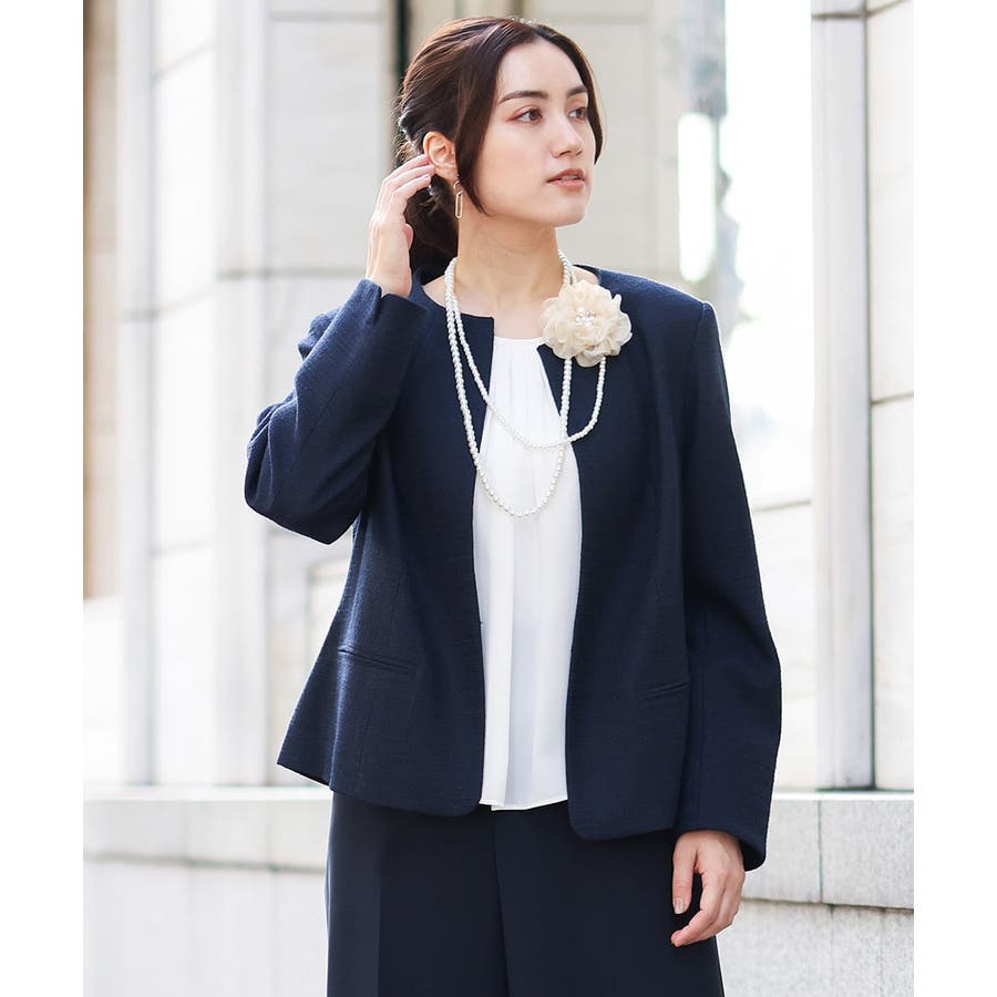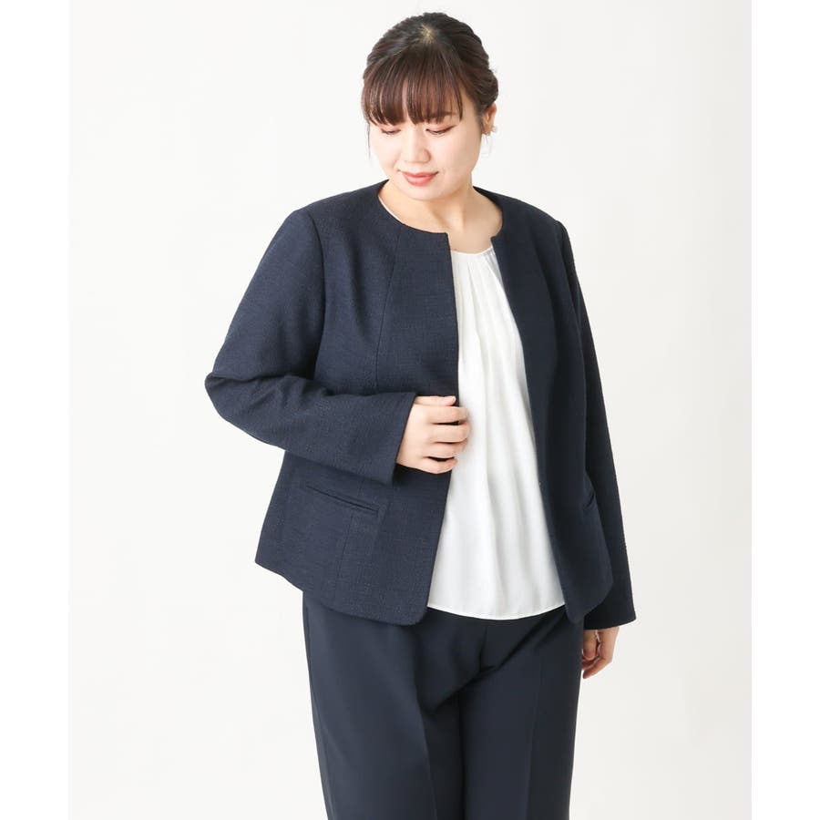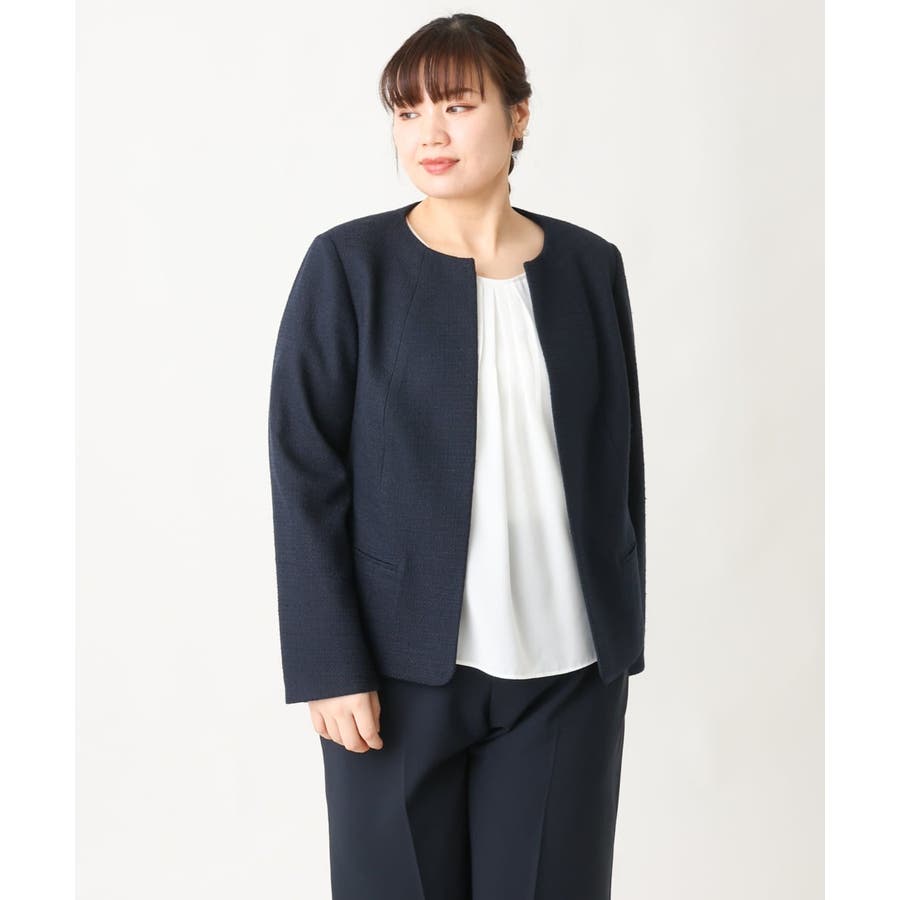 細見えなすっきりシルエットを追求した美シルエットなジャケットは前をあけてご着用いただいてもすっきり綺麗なシルエット。