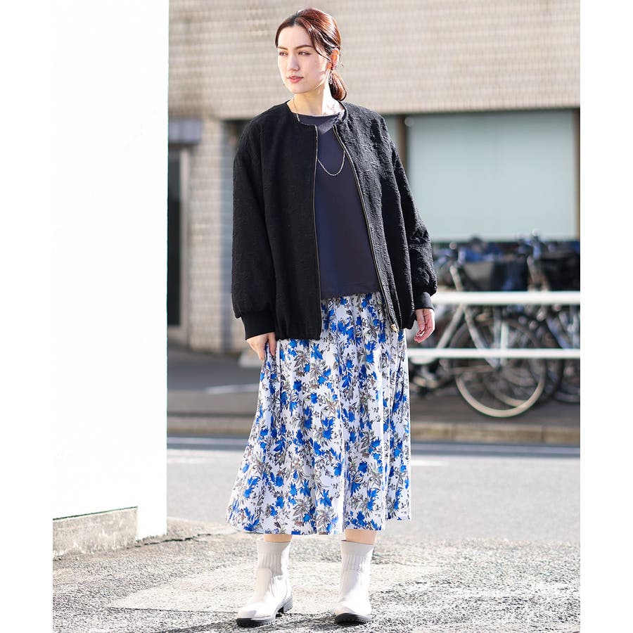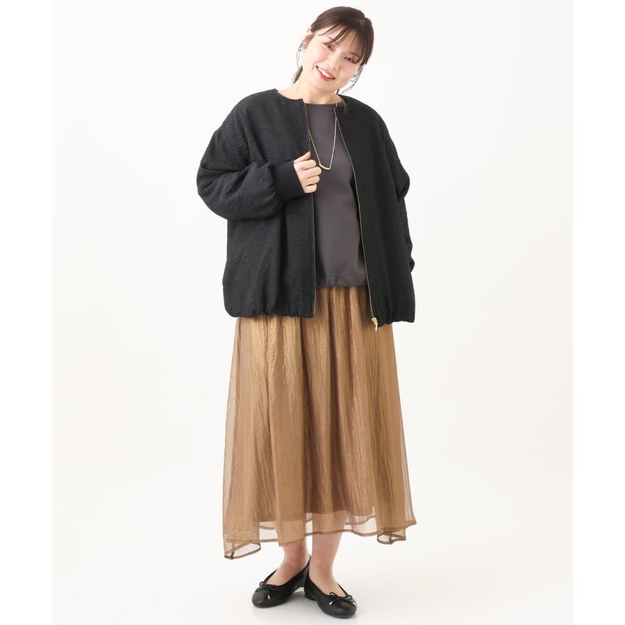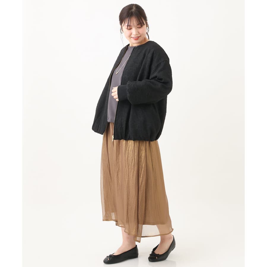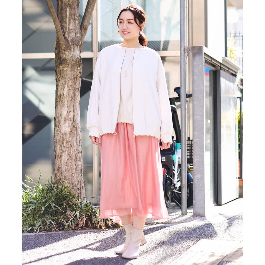 微光沢の生地が女性らしい雰囲気なのでスカートで華やかに合わせるのがおすすめスタイルです。