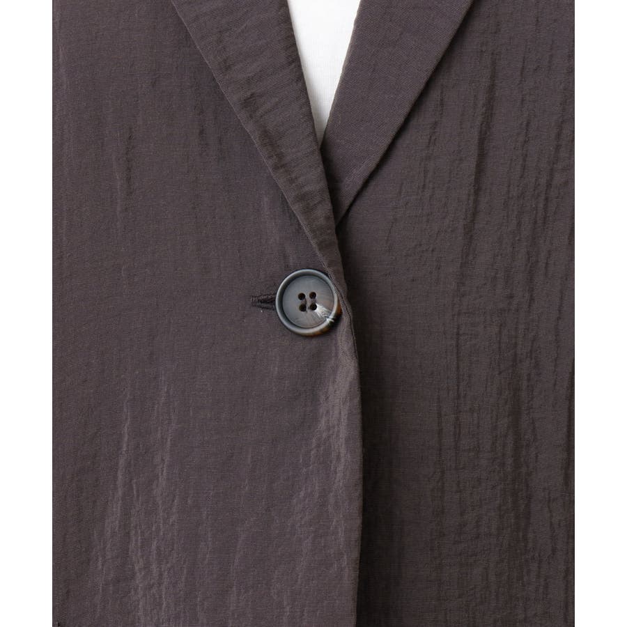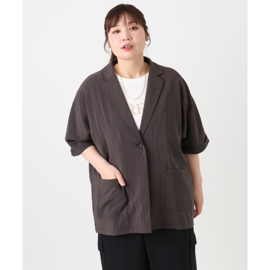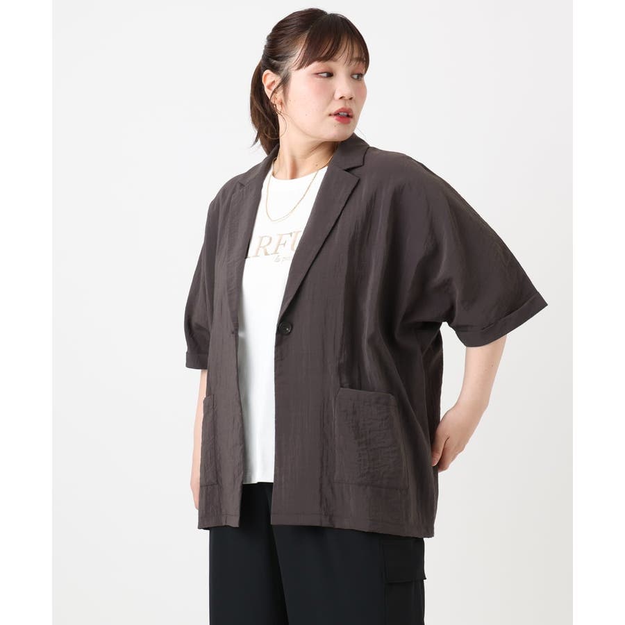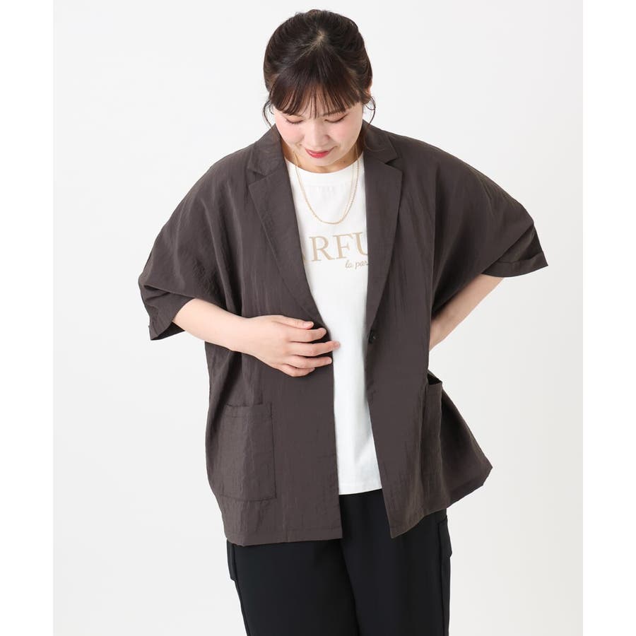 トレンドの微光沢&少しシアーな素材がライトでかわいいハーフスリーブテーラージャケット。