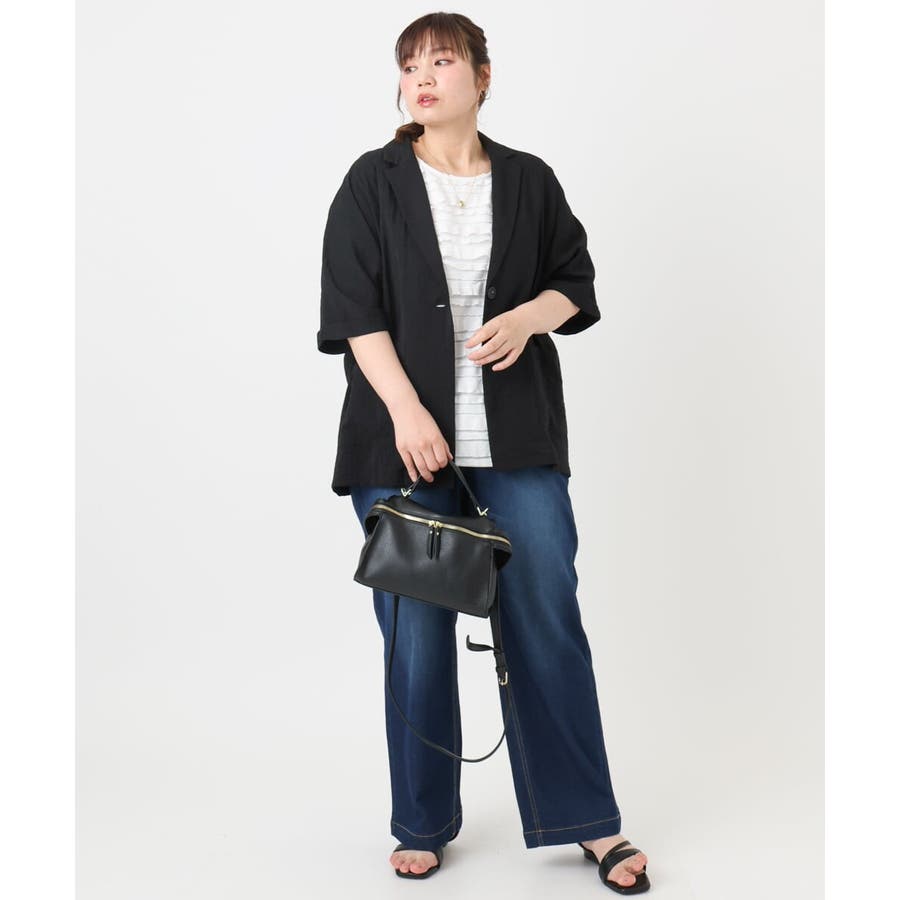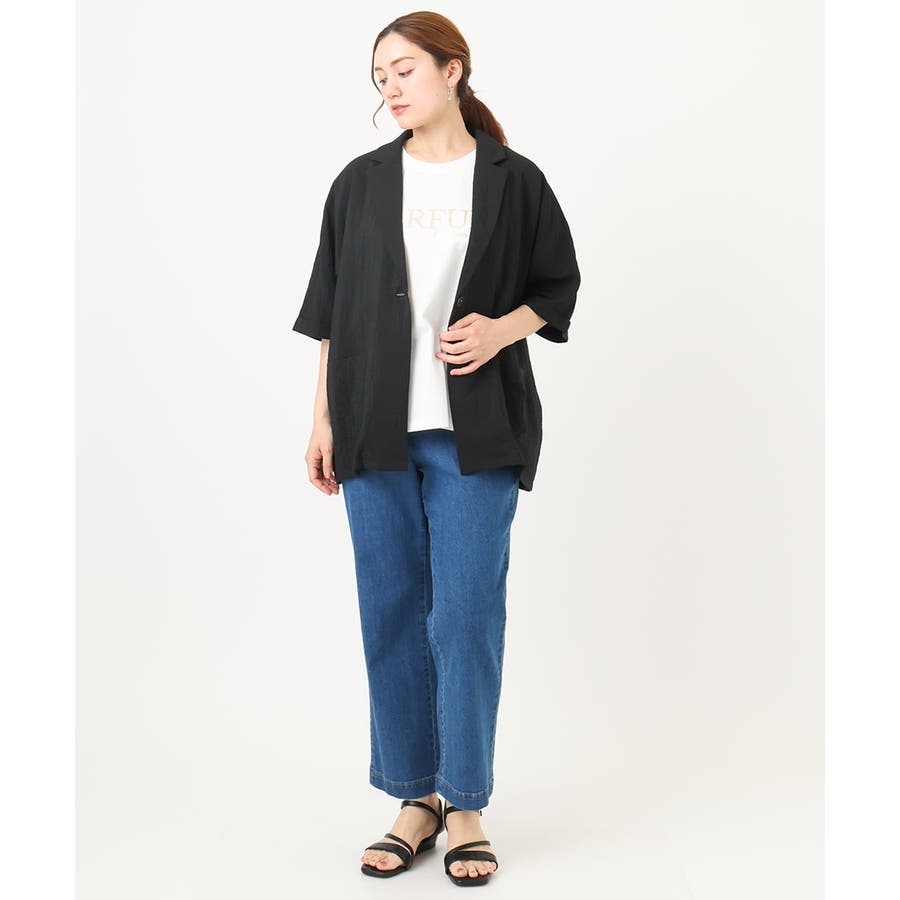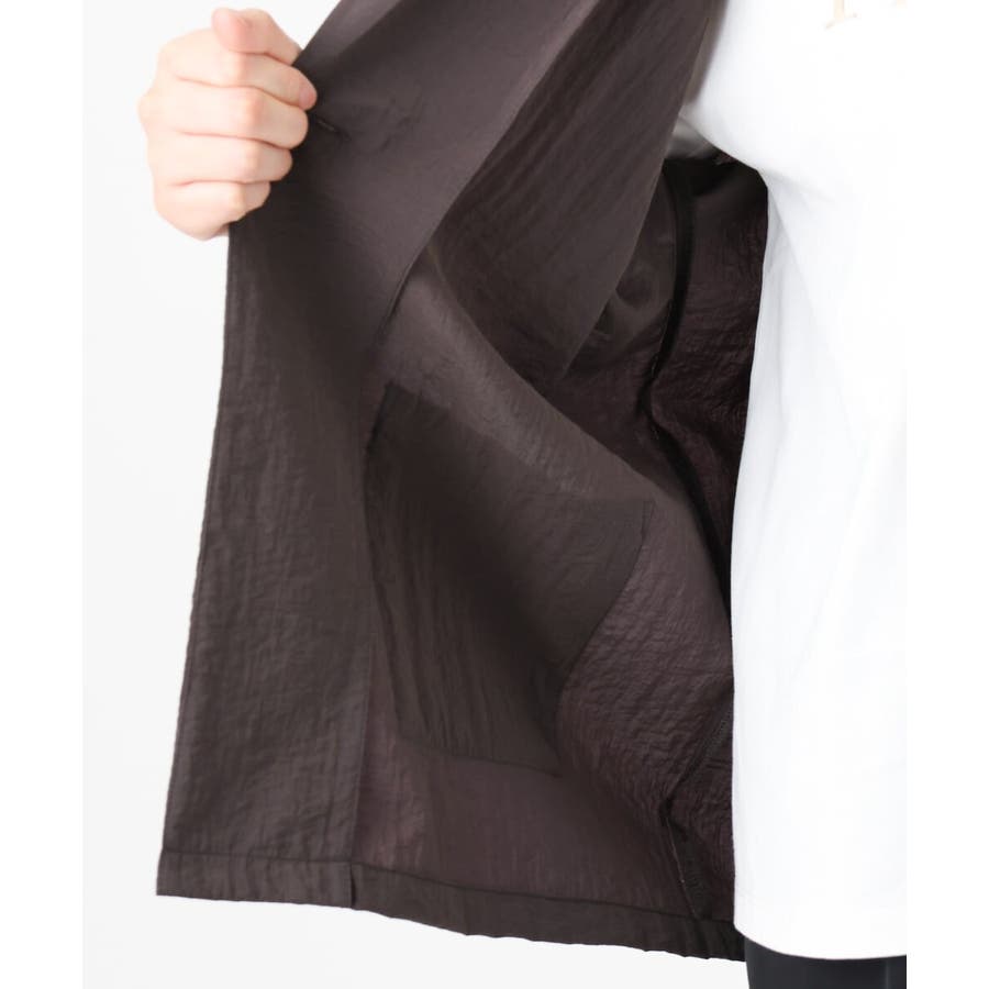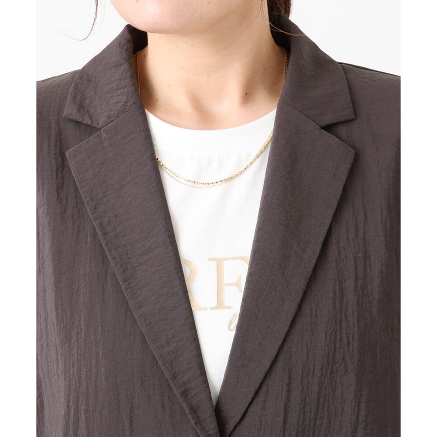トレンドの微光沢&少しシアーな素材がライトでかわいいハーフスリーブテーラージャケット。