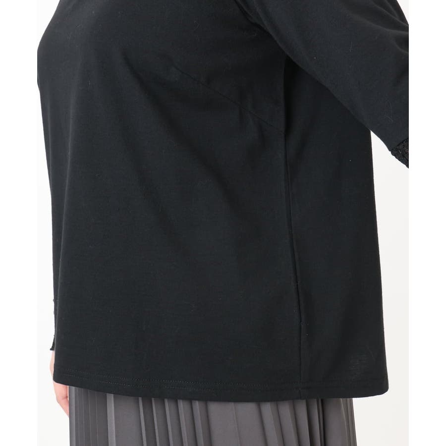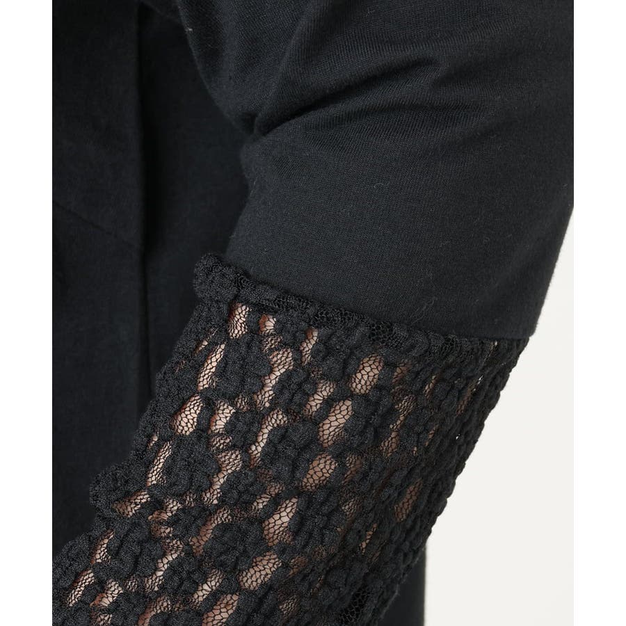 襟ぐりと袖口をレースで接いだレイヤード映えするジャージートップス。