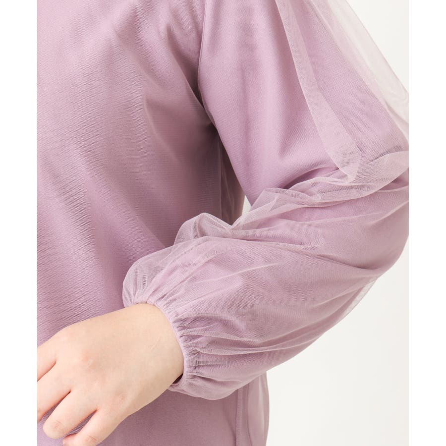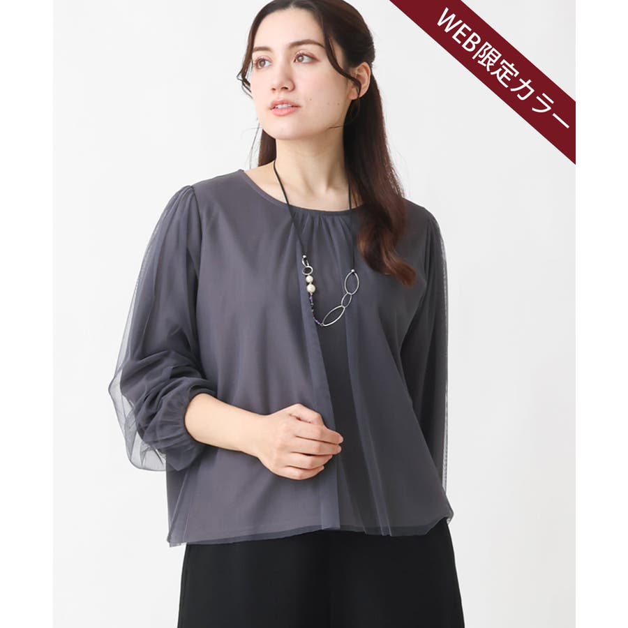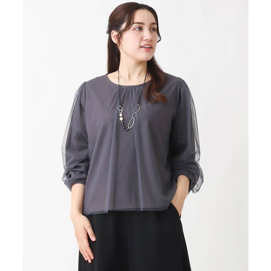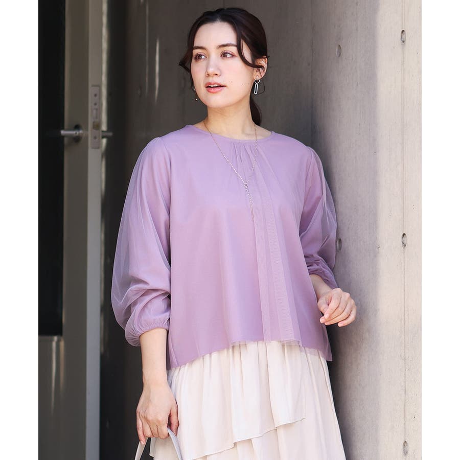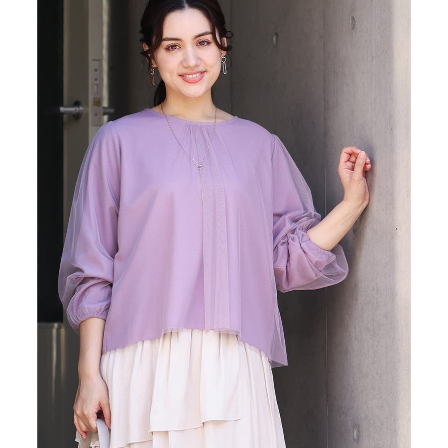 トレンドのチュール使いのプルオーバー! きれいめ見えカットソー素材に、柔らかでシアーなストレッチチュールを重ねています。
