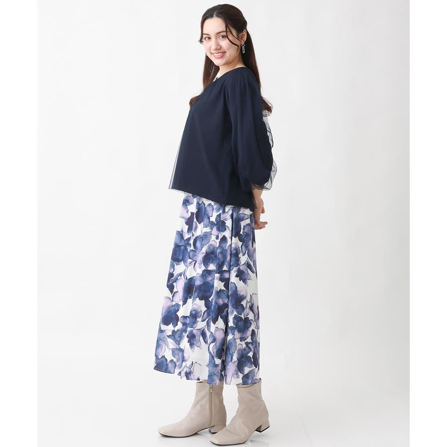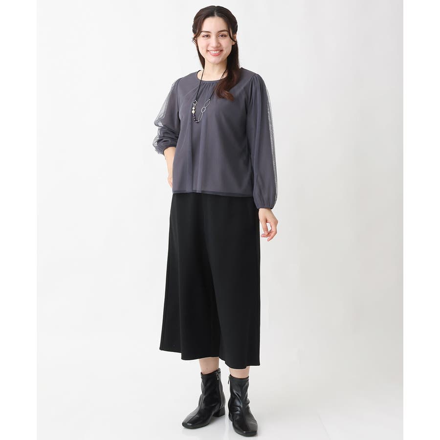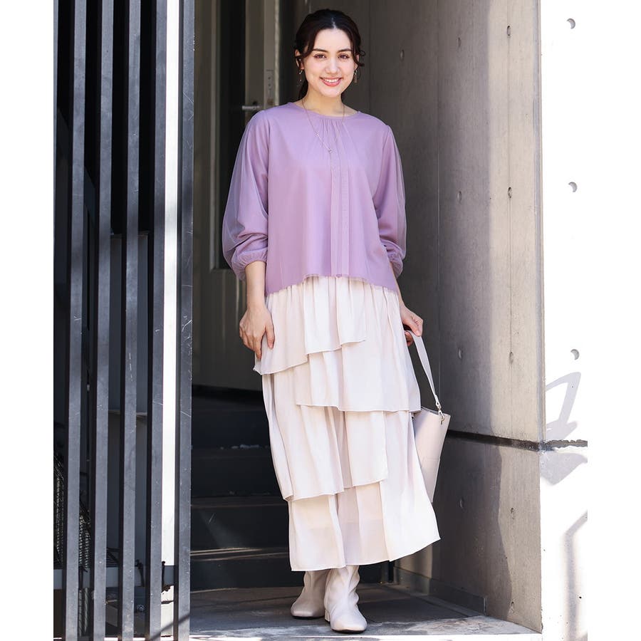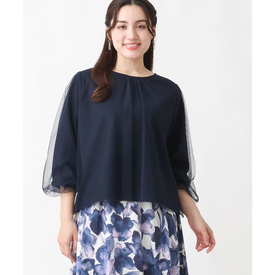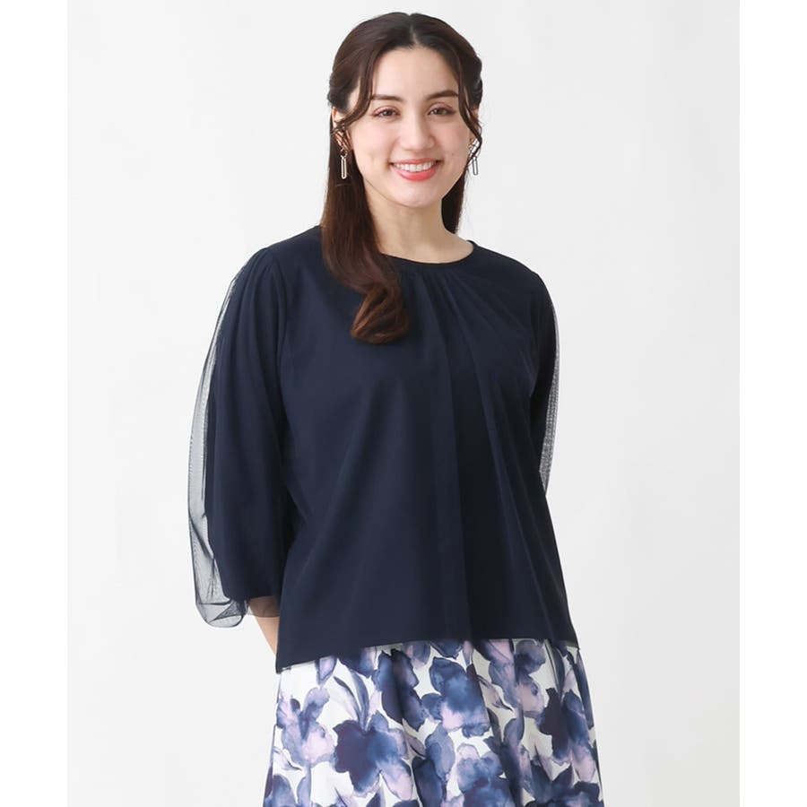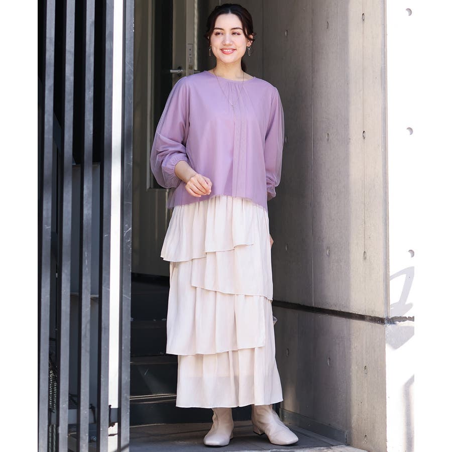 トレンドのチュール使いのプルオーバー! きれいめ見えカットソー素材に、柔らかでシアーなストレッチチュールを重ねています。