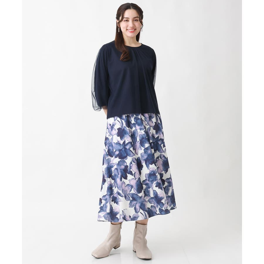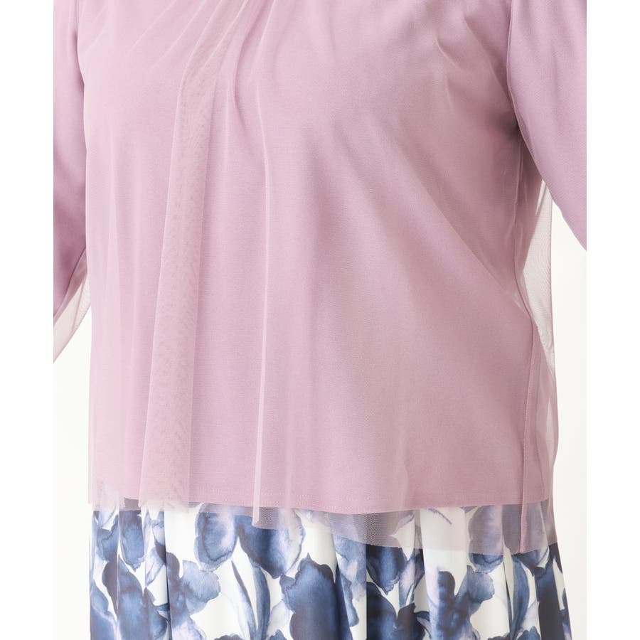 柔らかな中肉のジョーゼット見えジャージ素材にソフトでシアーなストレッチチュールを使用。