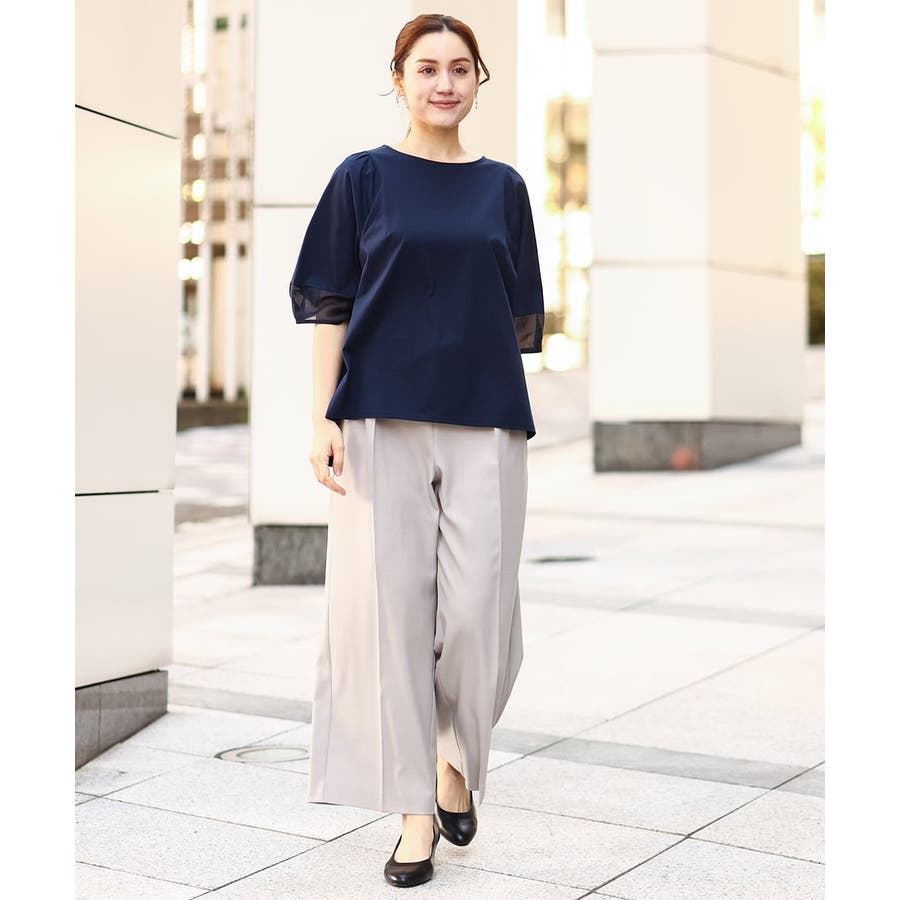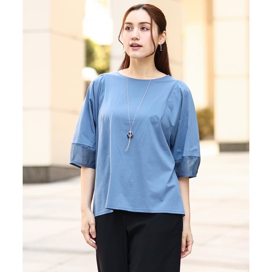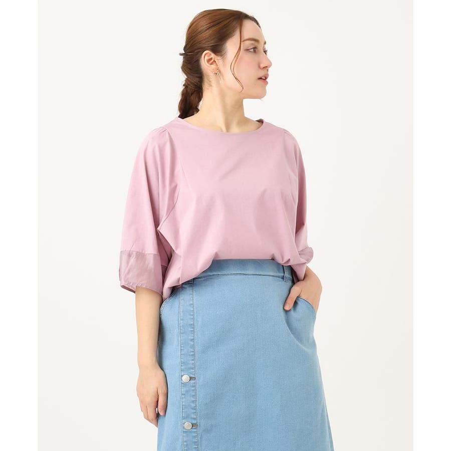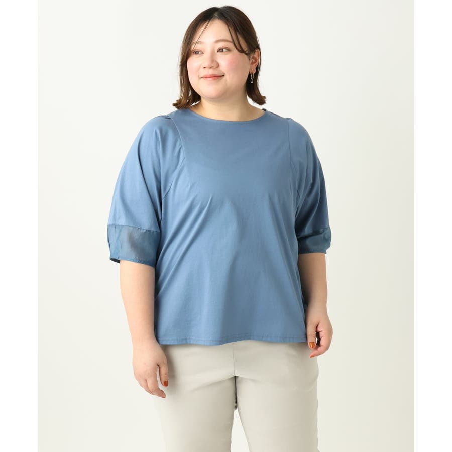 ランタン風スリーブにシアー素材を切り替えたデザインがポイントの1枚着カットソートップス。