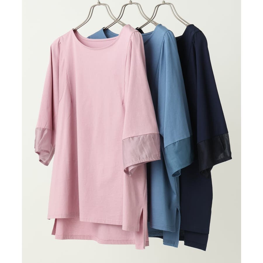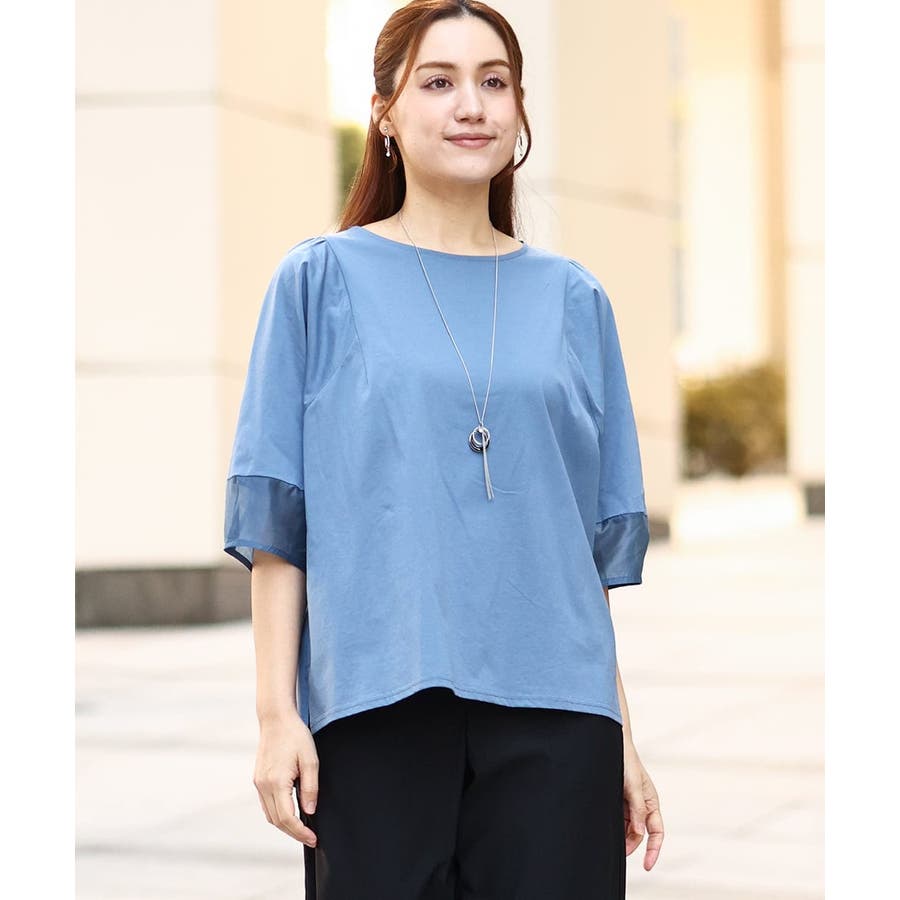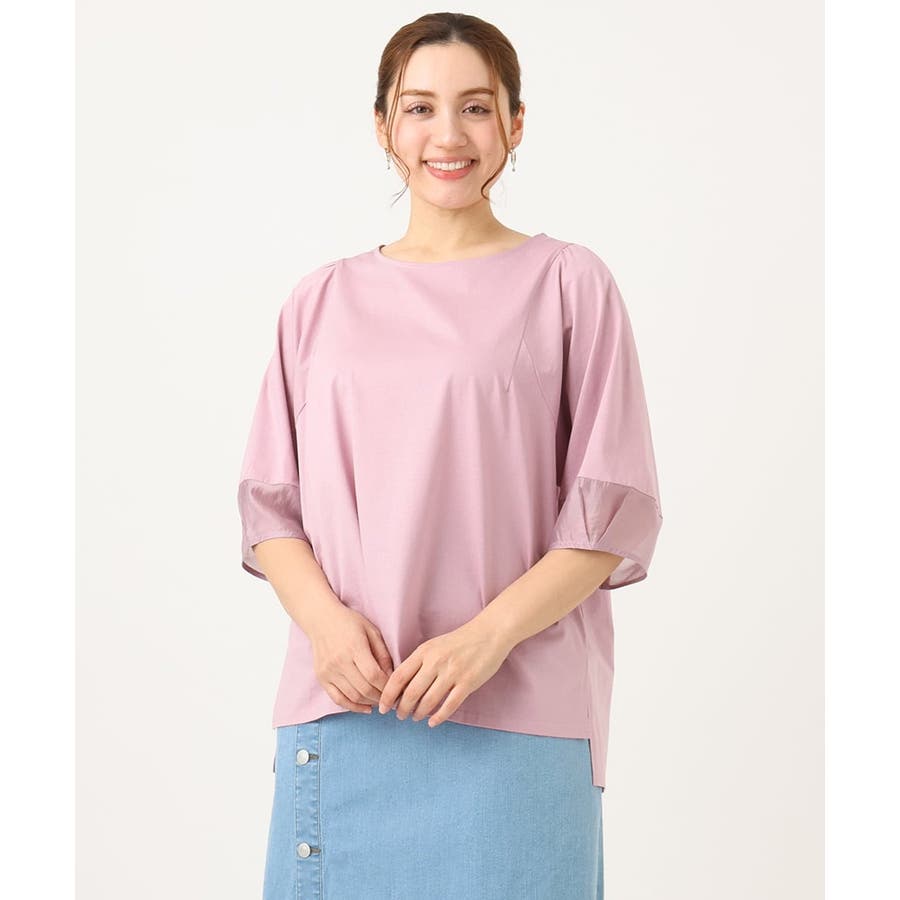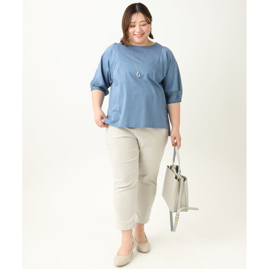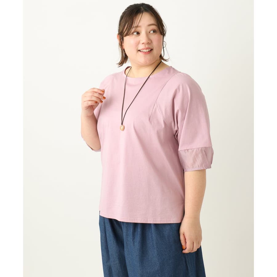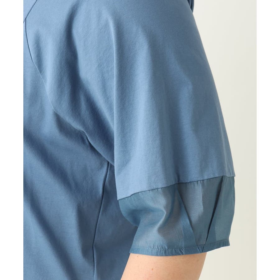 肌触りサラッとしたきれい見えするコットン100%の天竺編みジャージ素材に、シアーな合繊布帛生地を使用しています。