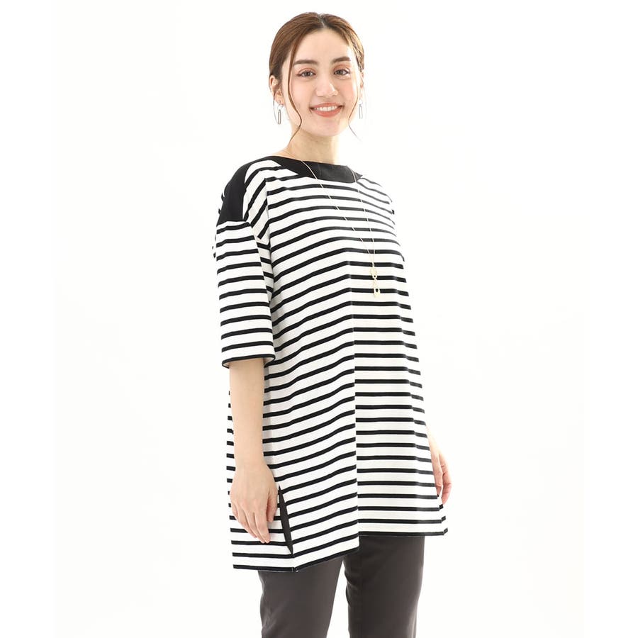バイカラーのネック切り替えがポイントのボーダープルオーバー。