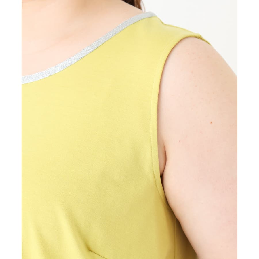 襟ぐりのラメ糸がポイントのタンクトップ。