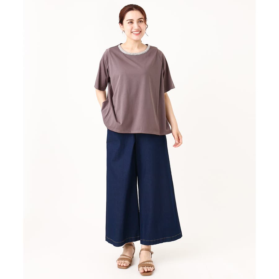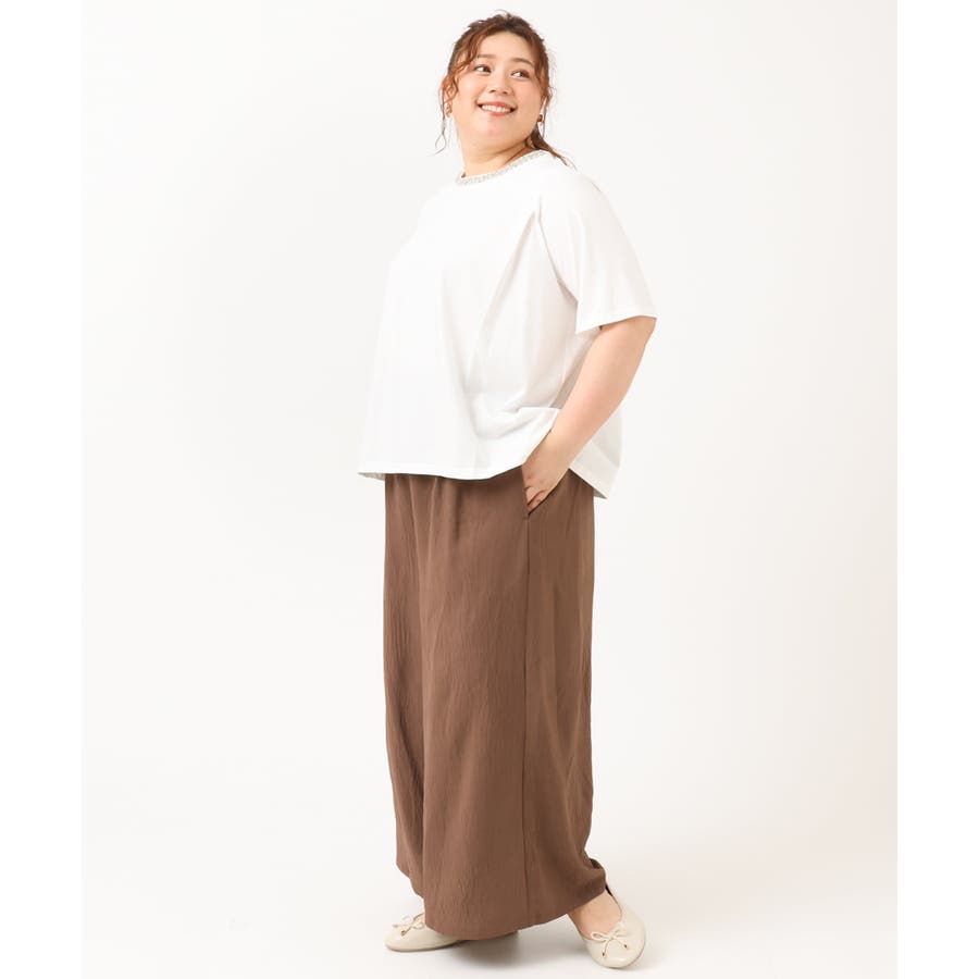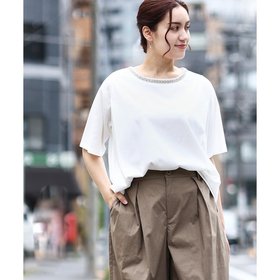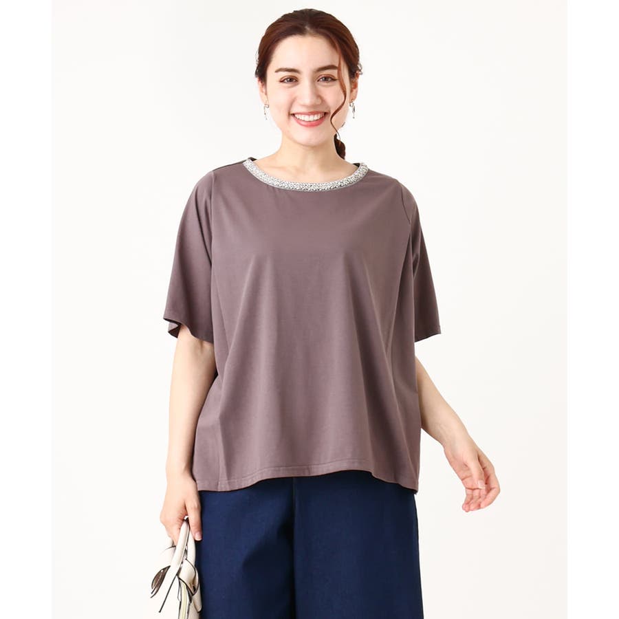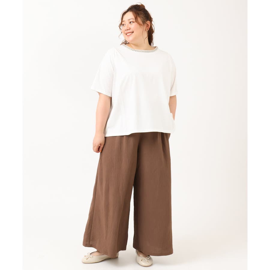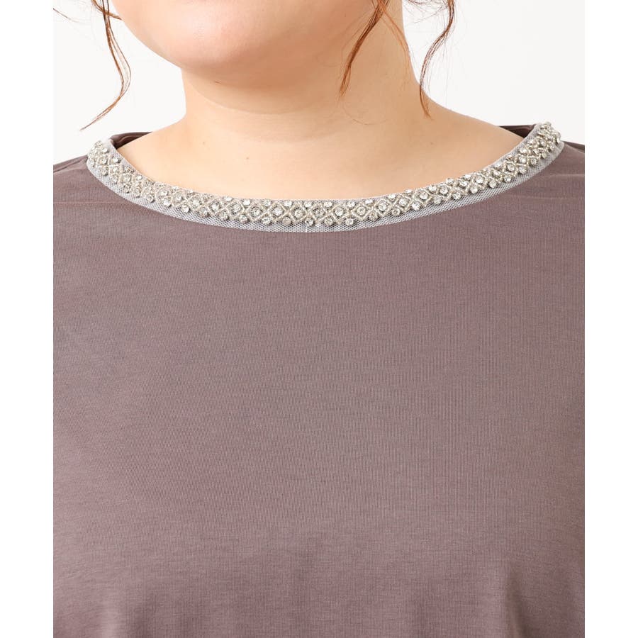 【大きいサイズ】ビジューネックTシャツ