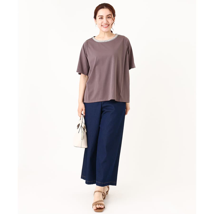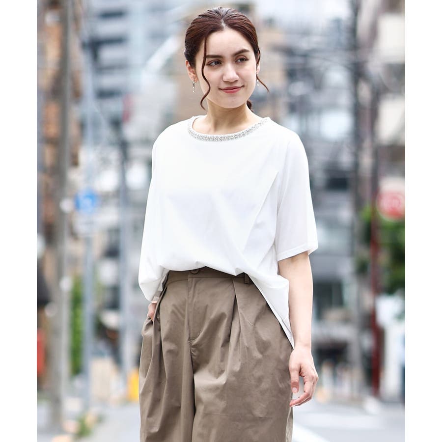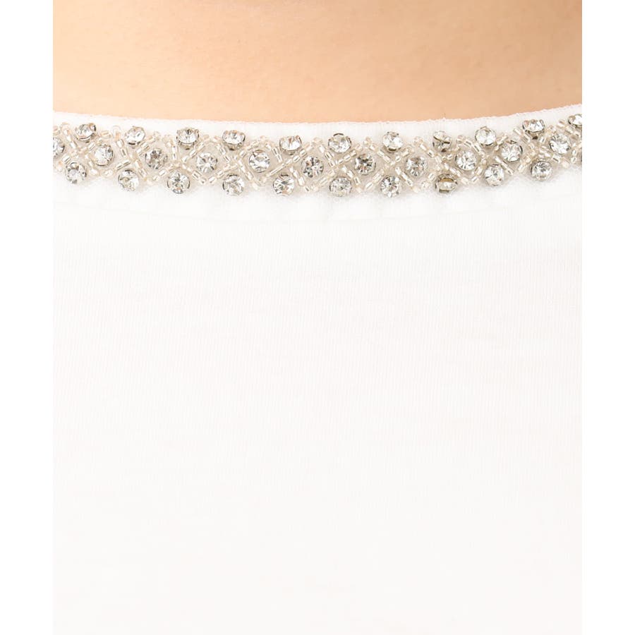前襟ぐりにラインストーンなどのキラキラしたビジューテープをつけたトレンド感あるTシャツ。