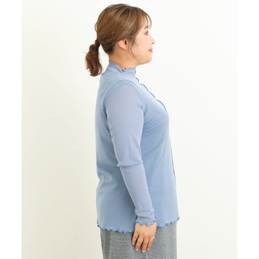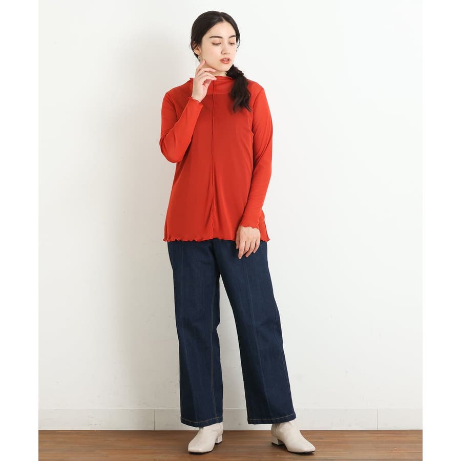 エウルキューブではボトルネックにし、衿、袖口、裾、フロント切り替えにメローロックでフリル調に仕上げ1枚着でもレイヤードインナーとしても使えるアイテムに仕上げました。