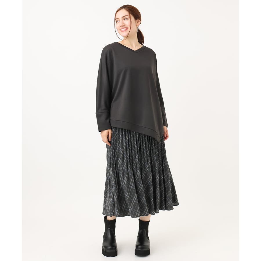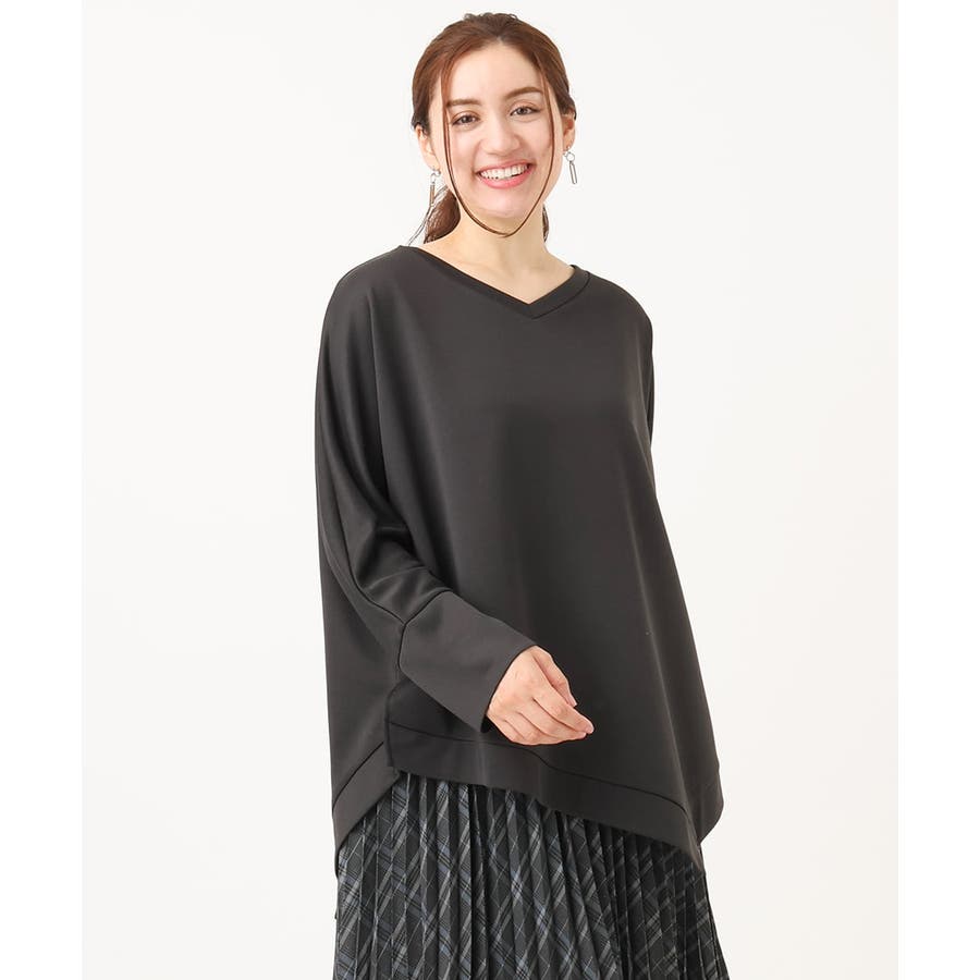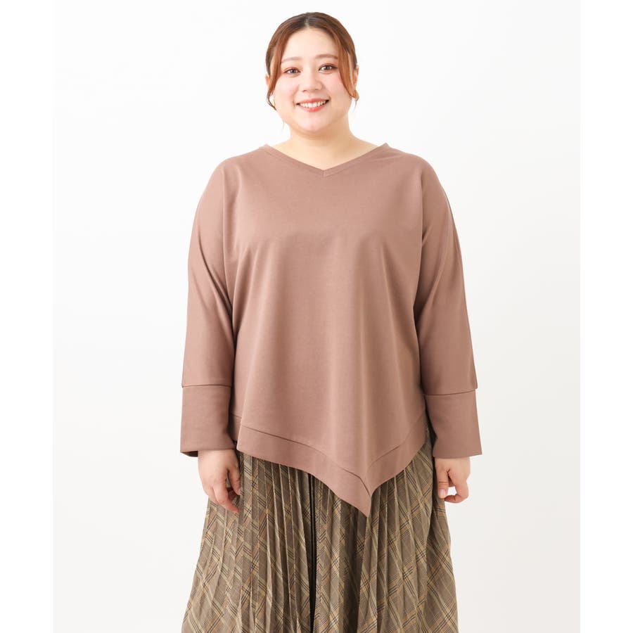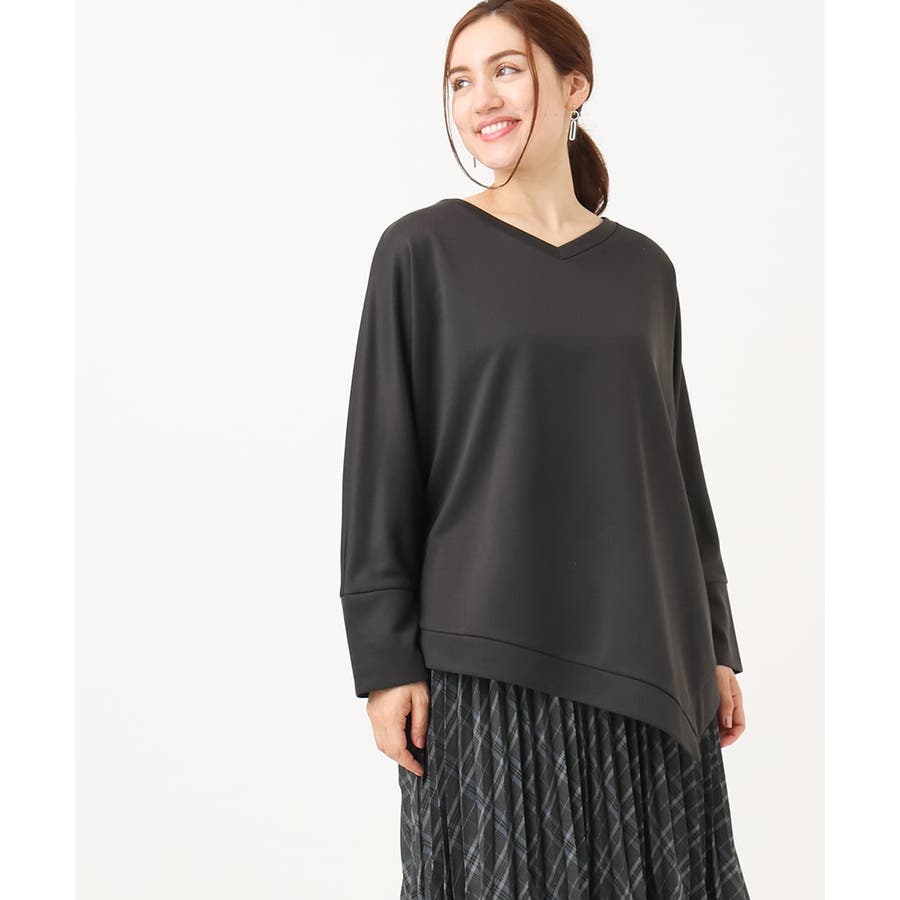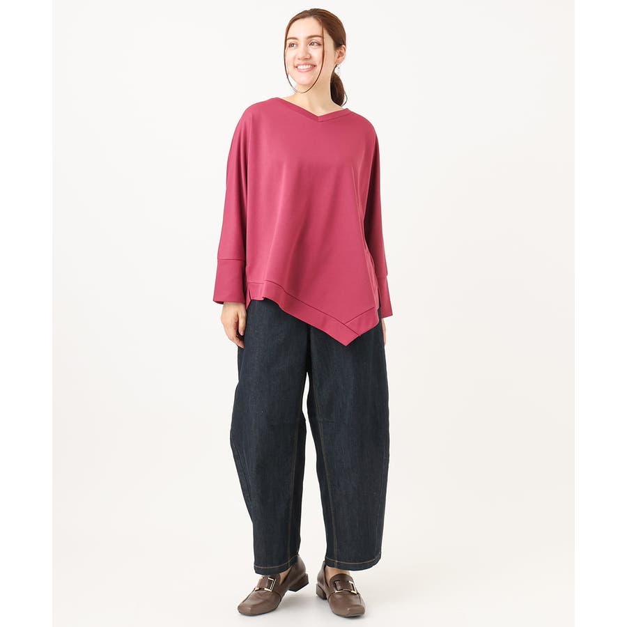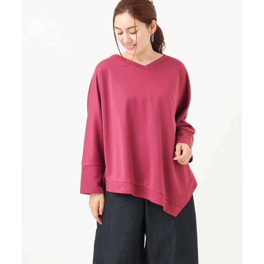 ネックラインをすっきり見せするVネックに、腰回りもカバーしてくれるアシメヘムディテールをいれたデザイントップス。