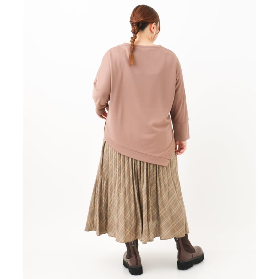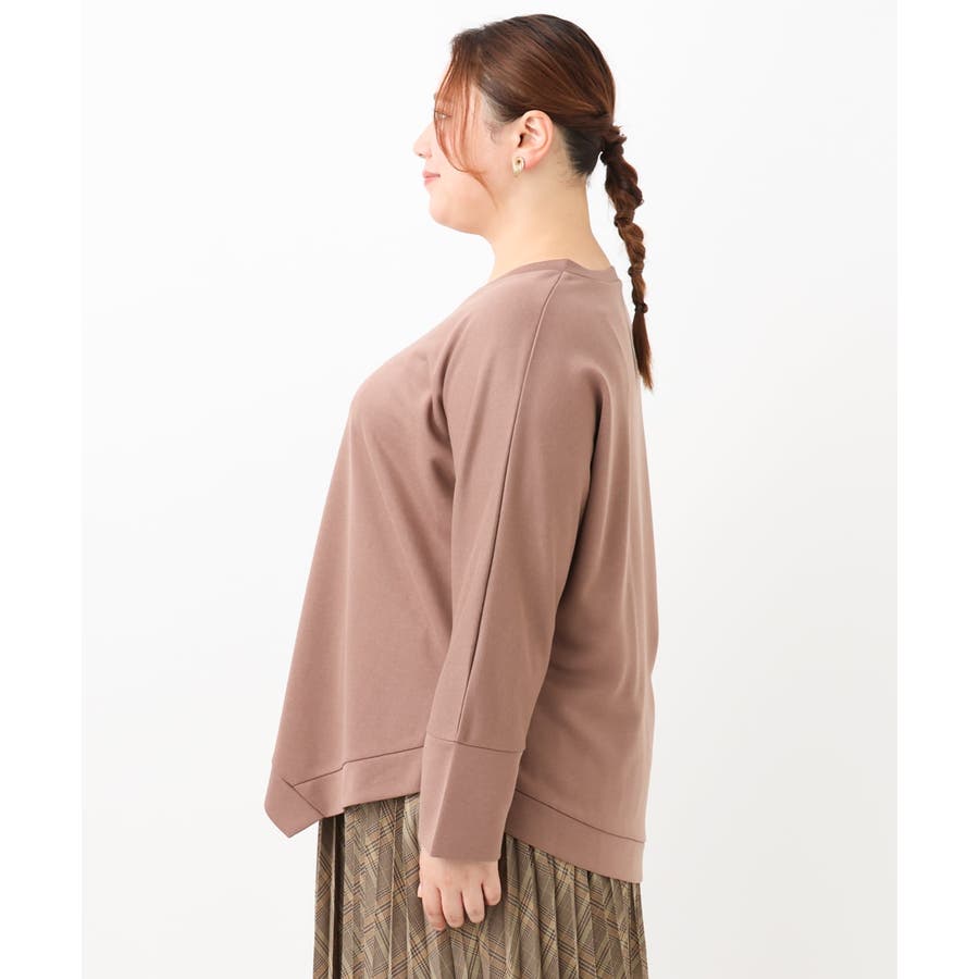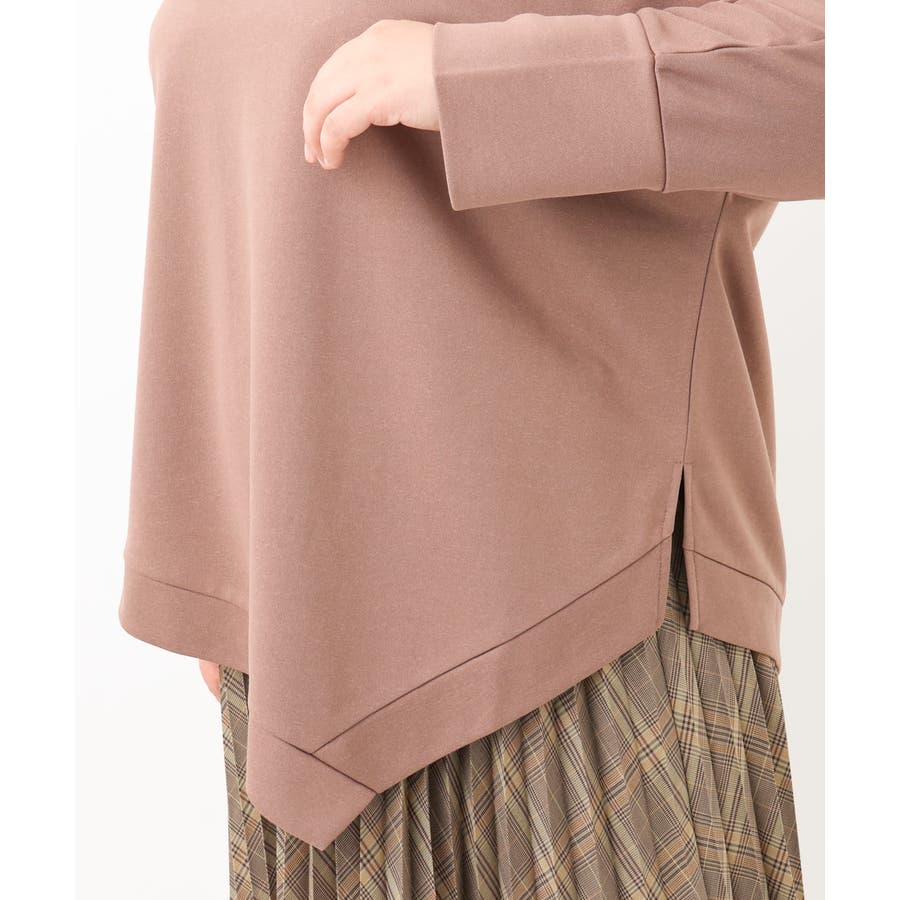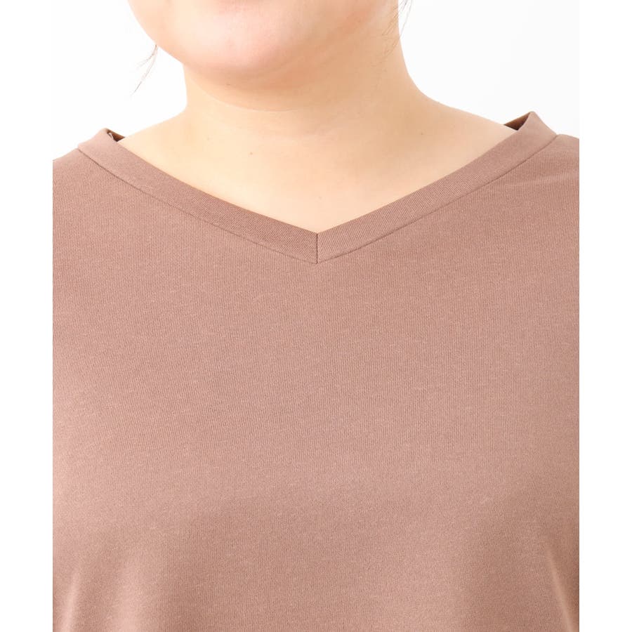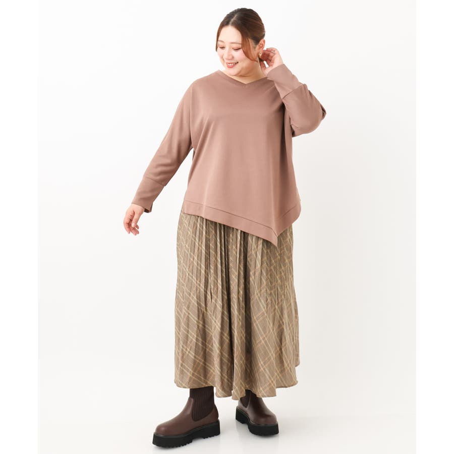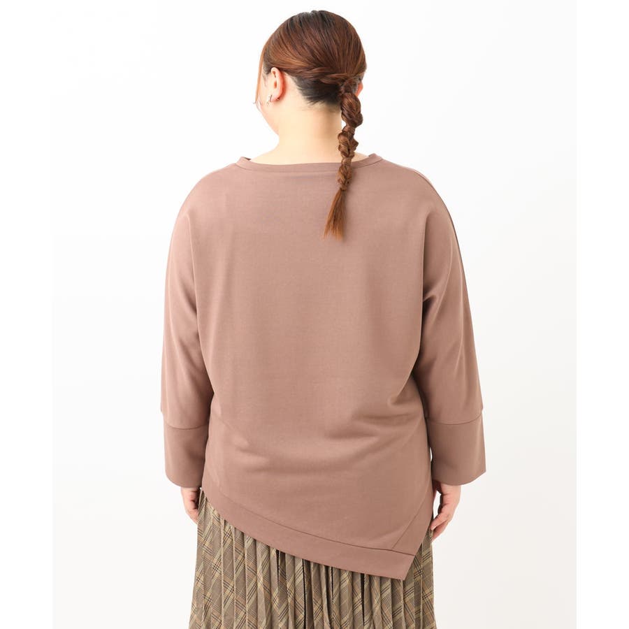 ネックラインをすっきり見せするVネックに、腰回りもカバーしてくれるアシメヘムディテールをいれたデザイントップス。