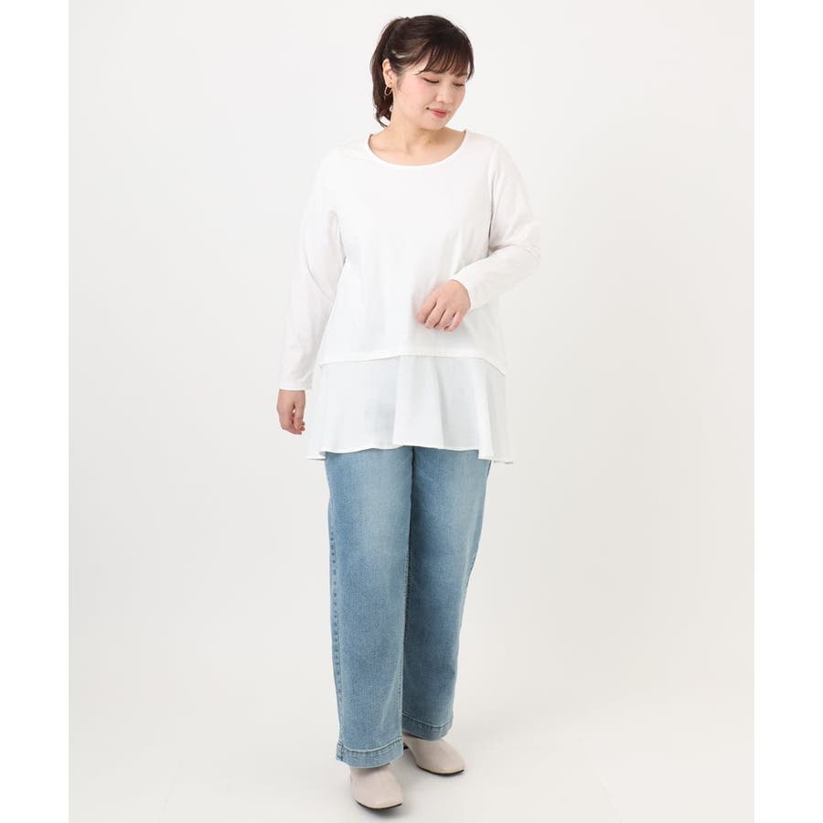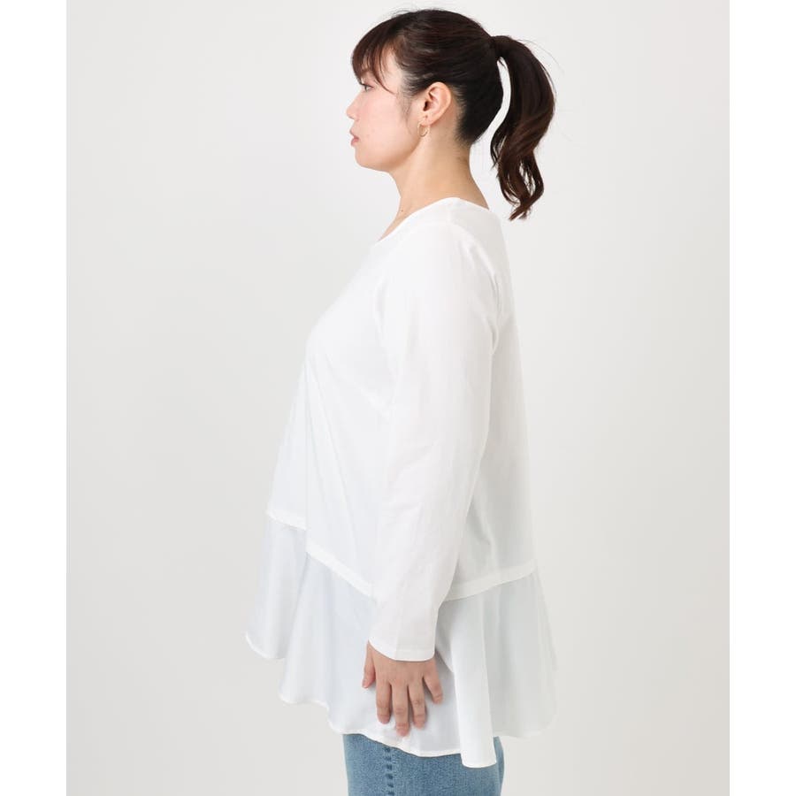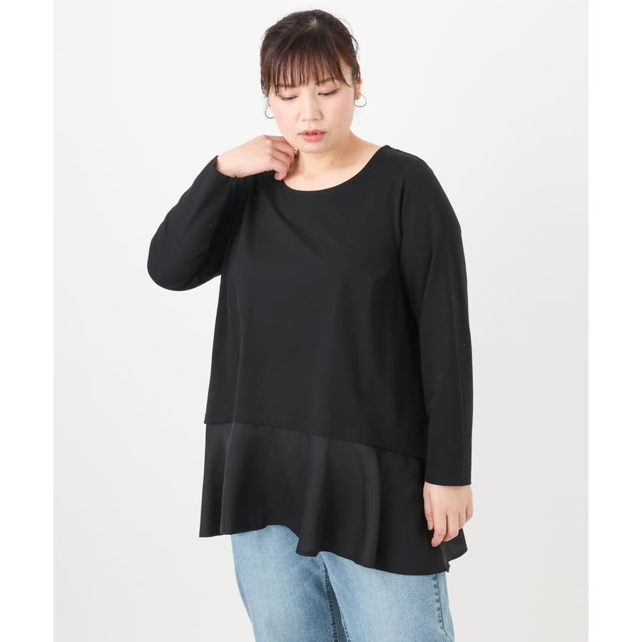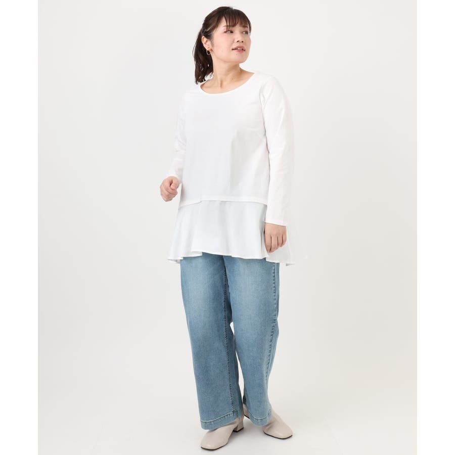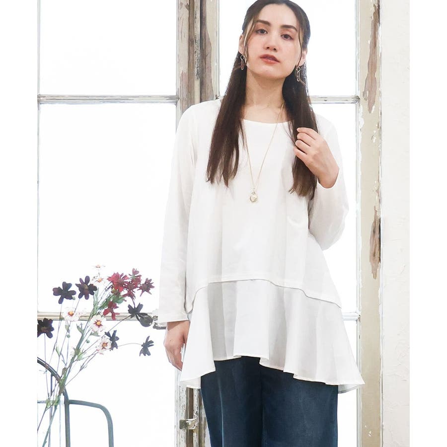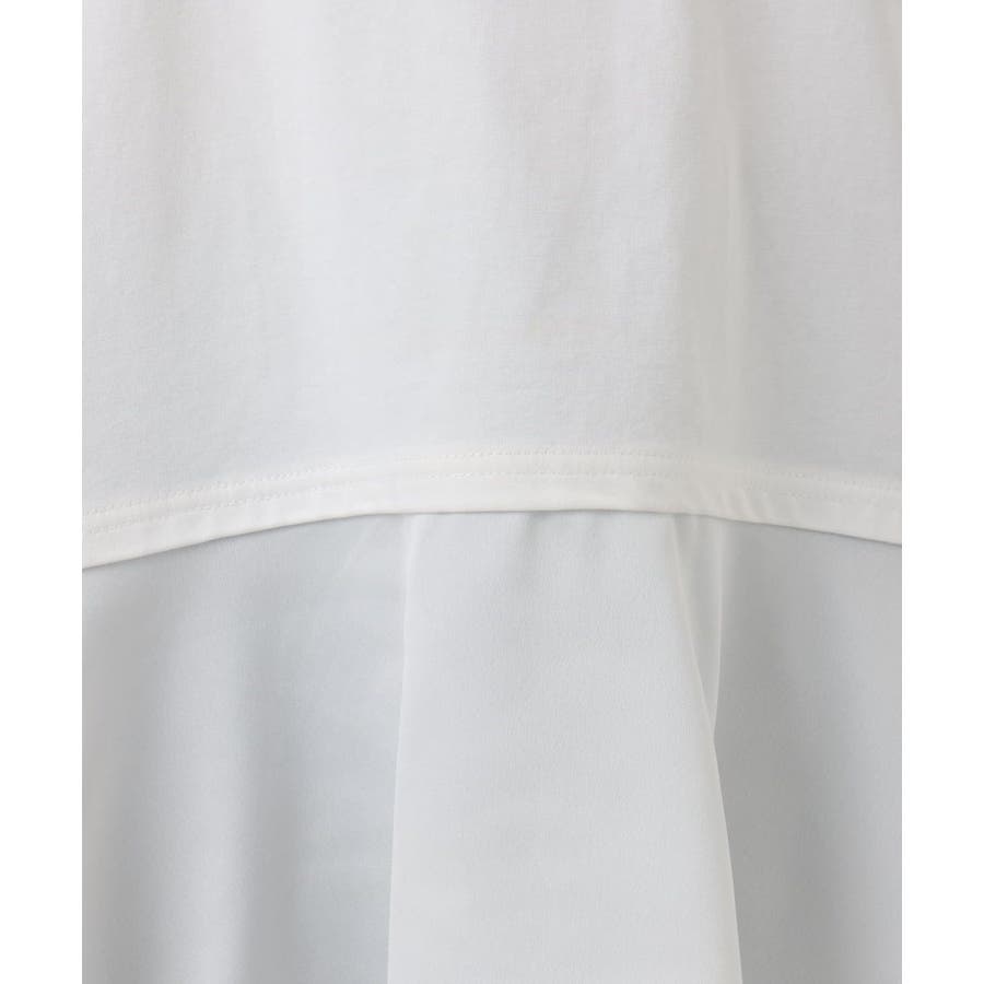 身頃は透けにくい柔らかなTC天竺生地と、裾には薄手のサテン布帛生地を使用しています。