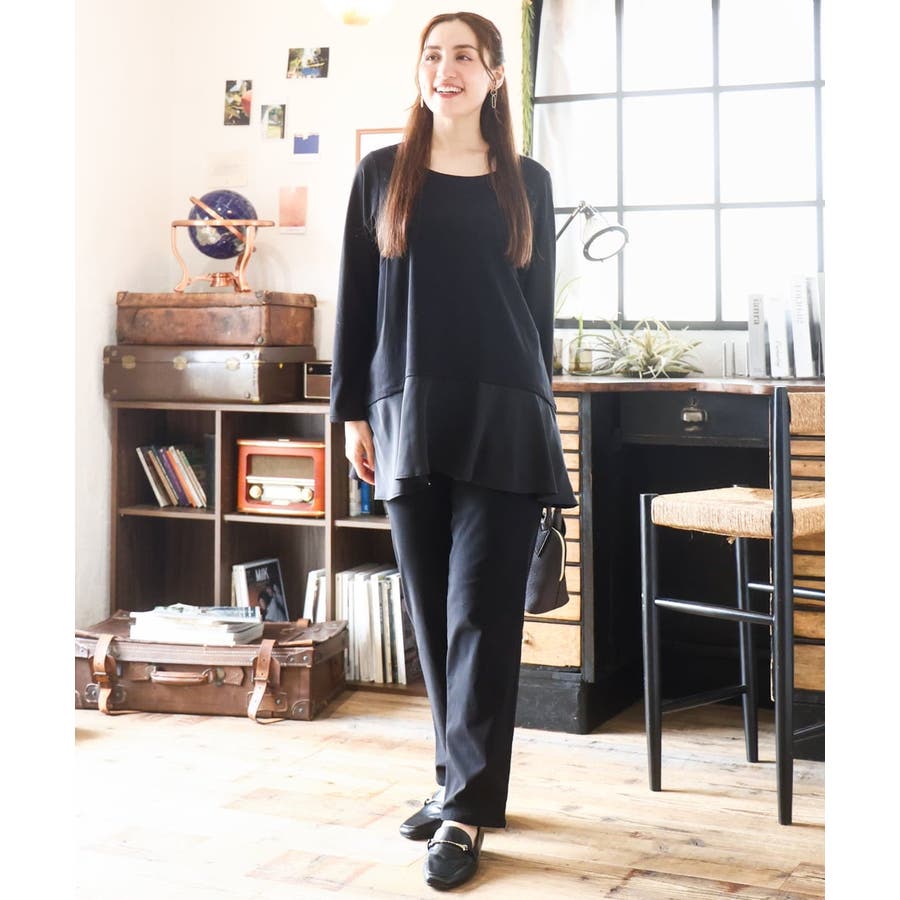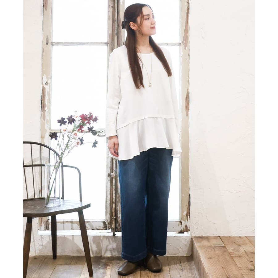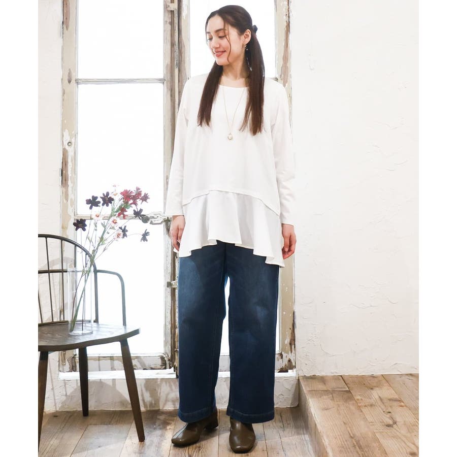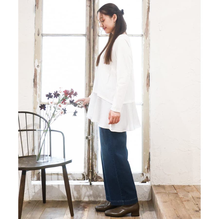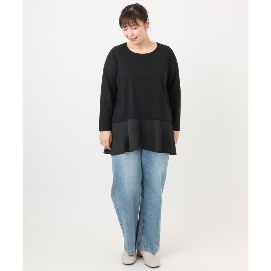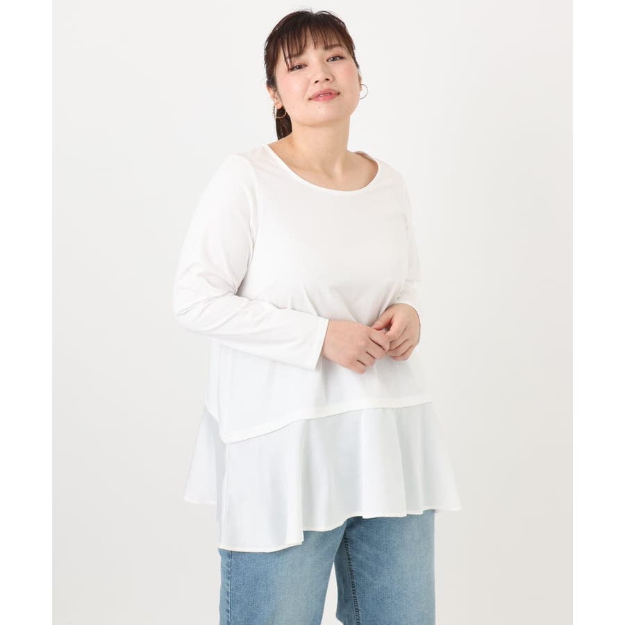 身頃は透けにくい柔らかなTC天竺生地と、裾には薄手のサテン布帛生地を使用しています。