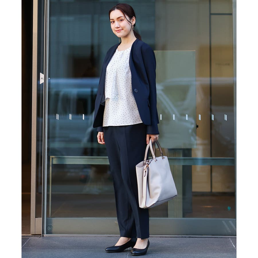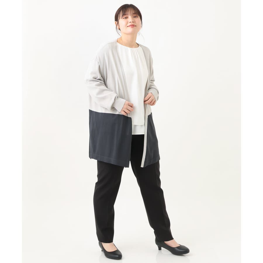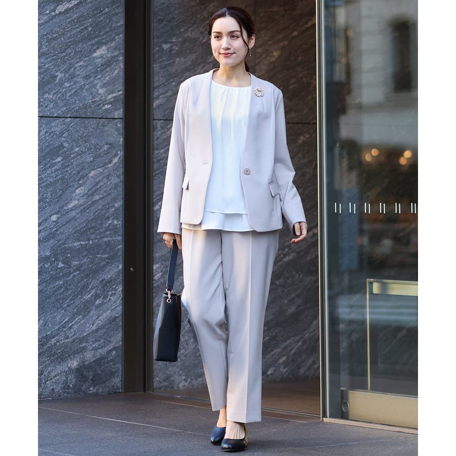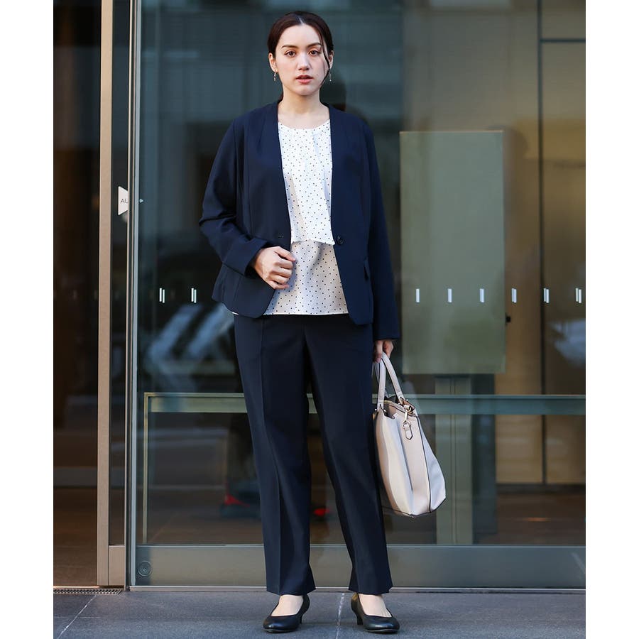 同素材のWクロスストレッチノーカラージャケット(品番OLDDV01189)、Wクロスストレッチテーラードジャケット(品番OLDDV02189)とセットアップで着用できます。