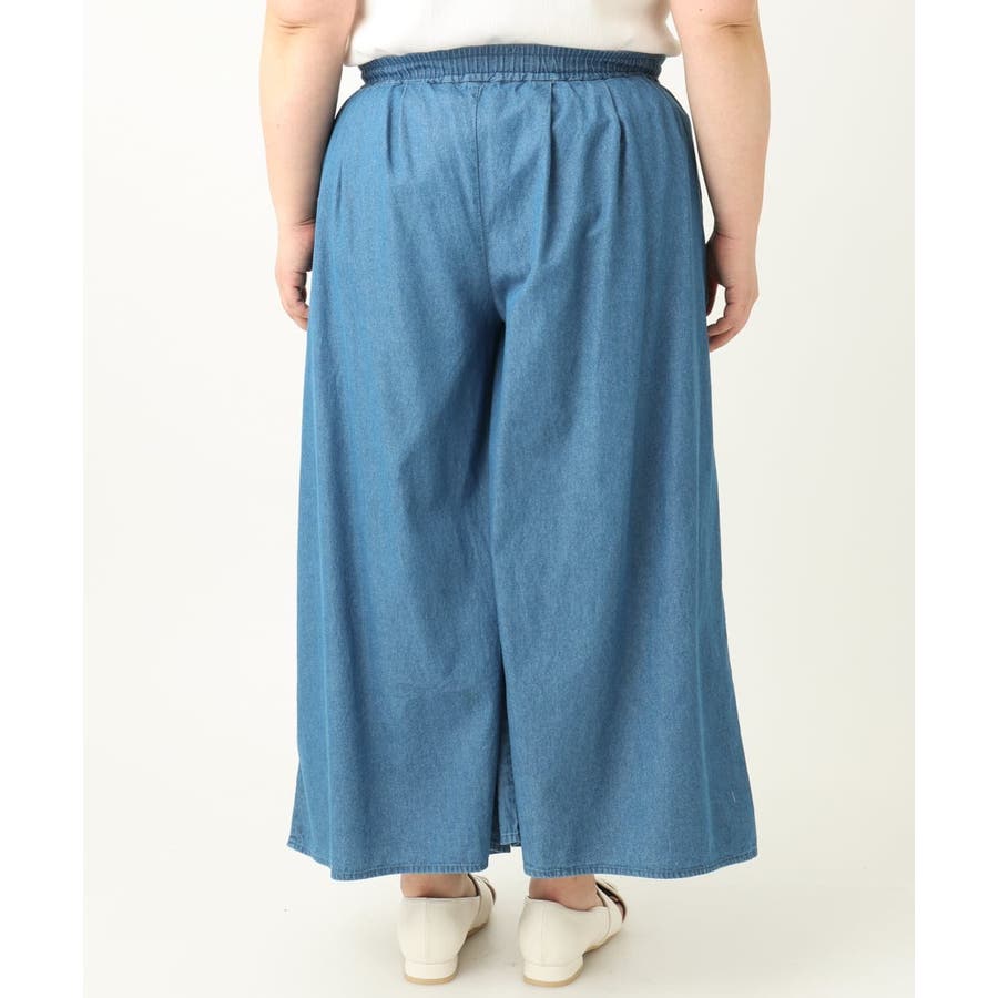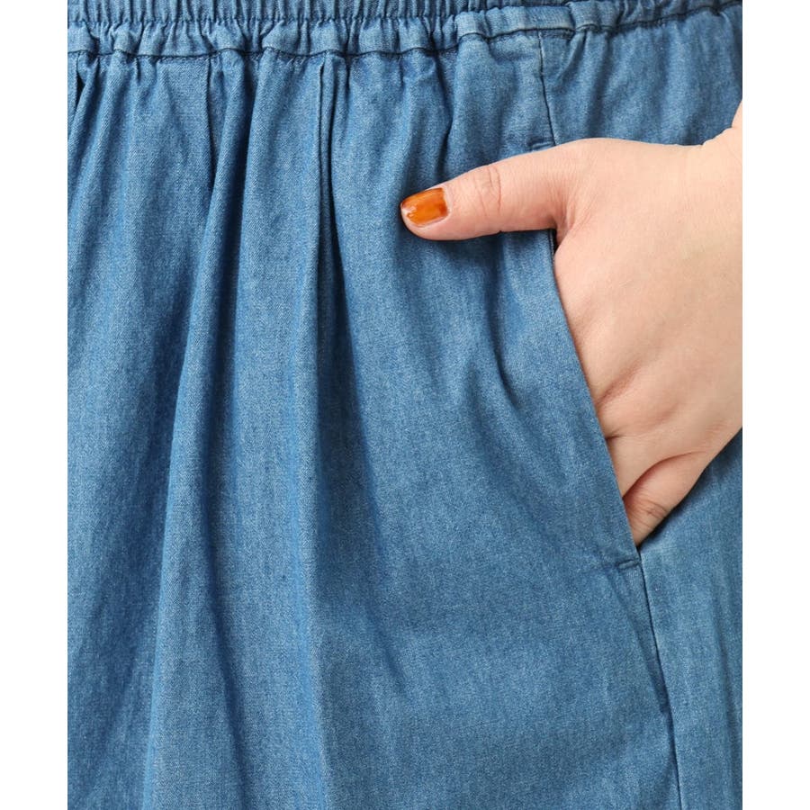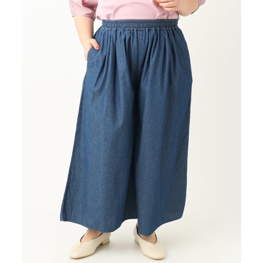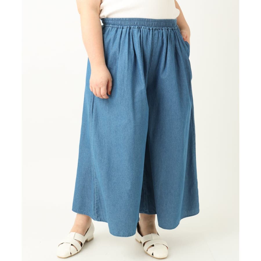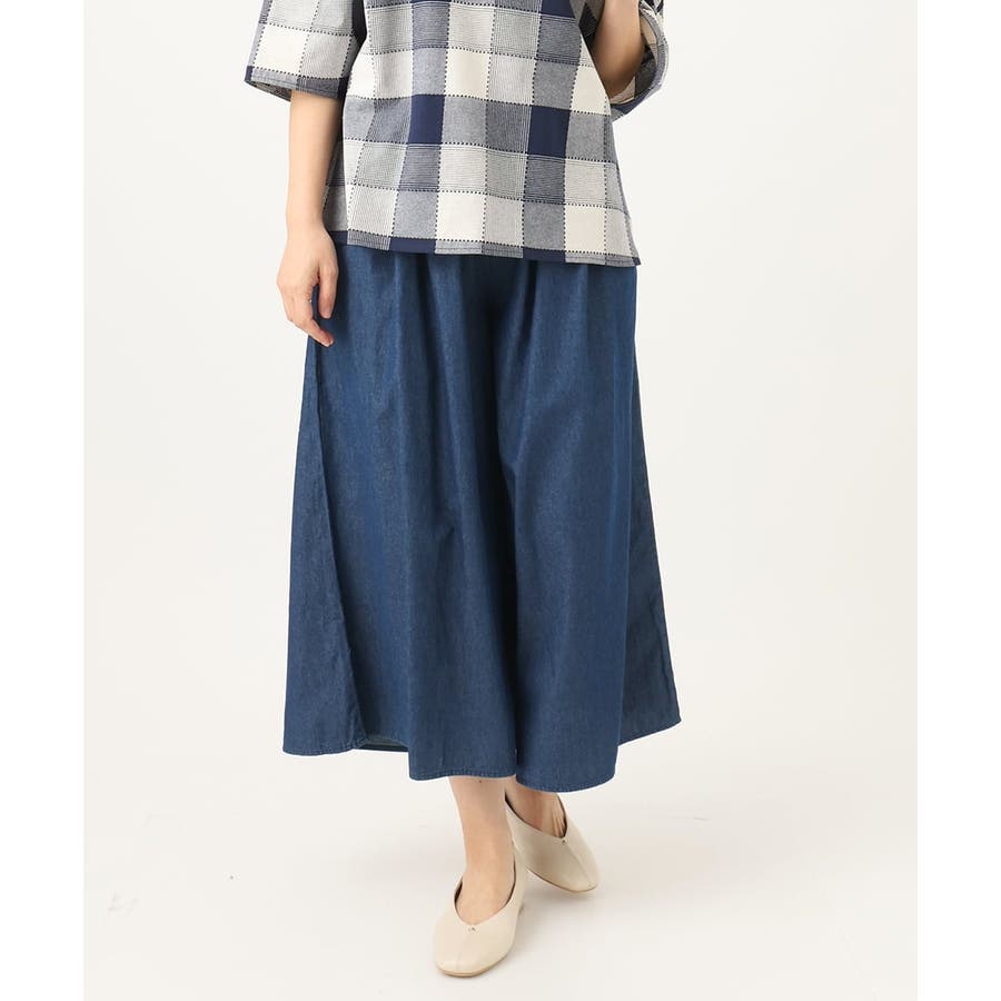 ウエストぐるりゴム入りのリラクシーなデニムのスカート見えパンツ。