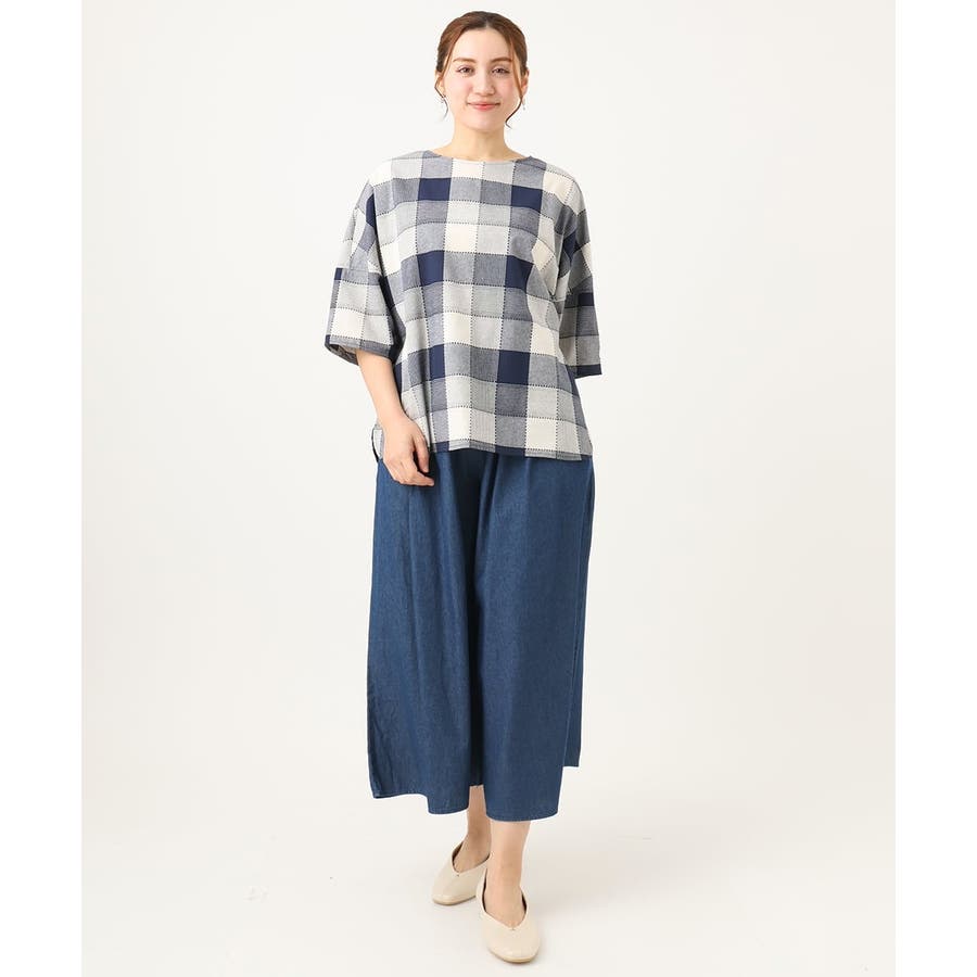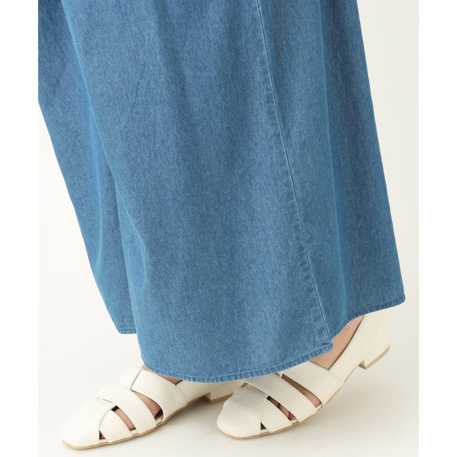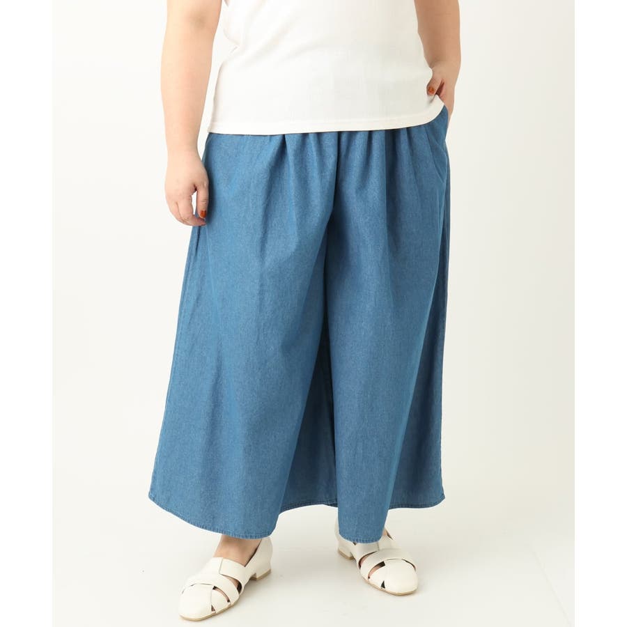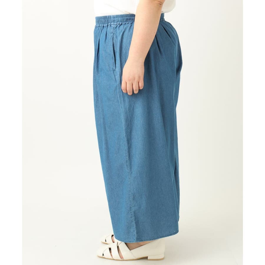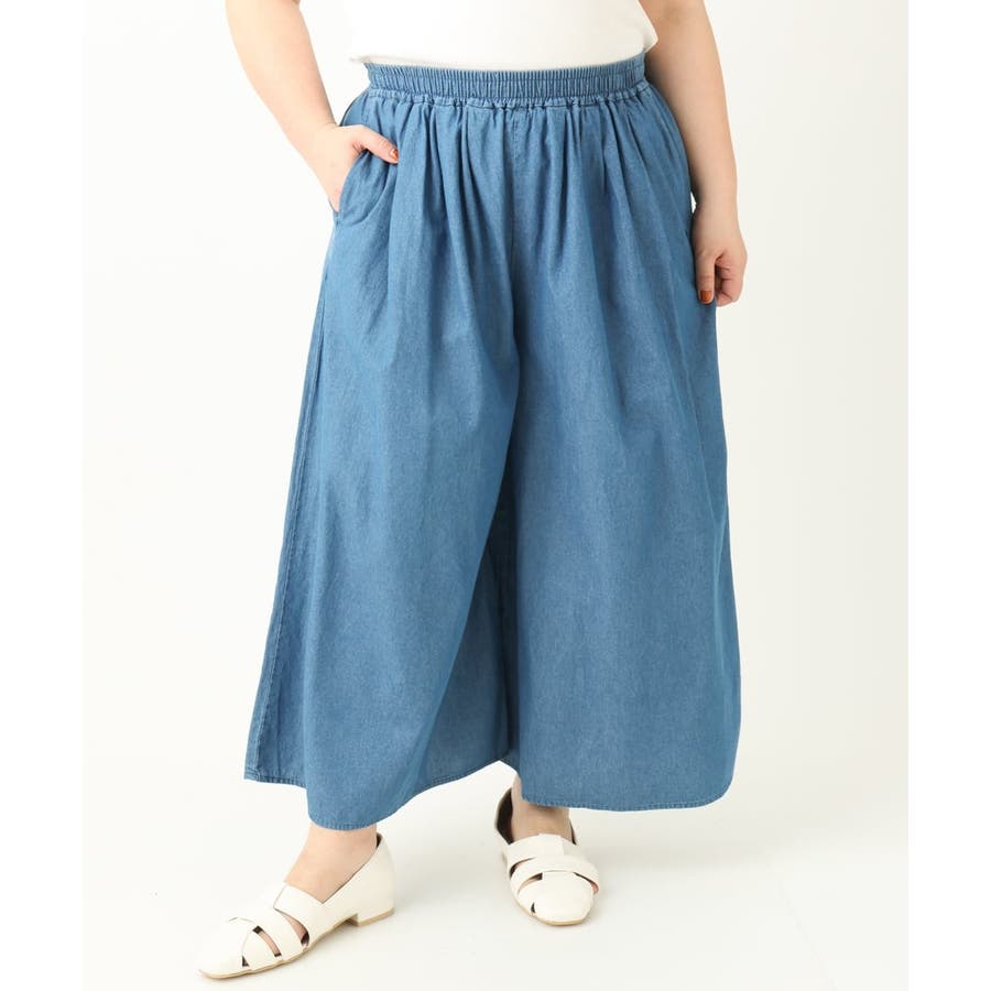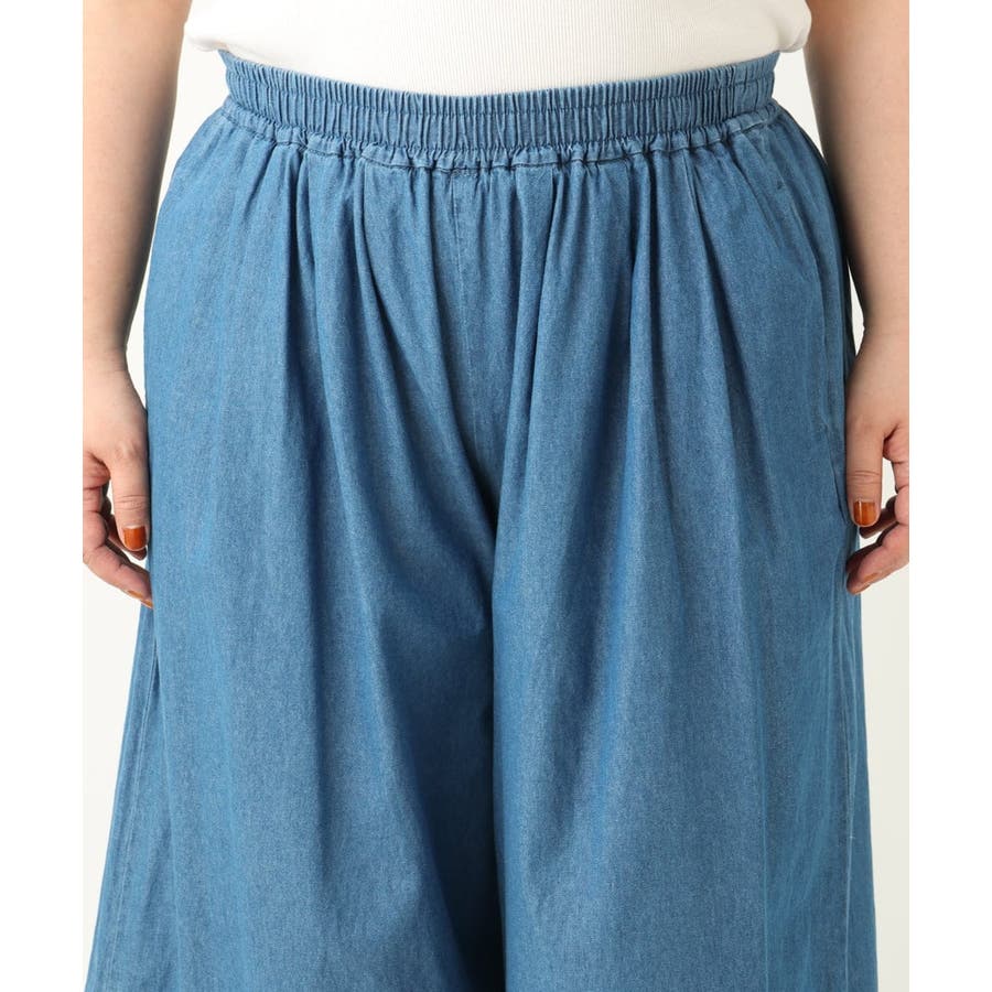 ウエストぐるりゴム入りのリラクシーなデニムのスカート見えパンツ。