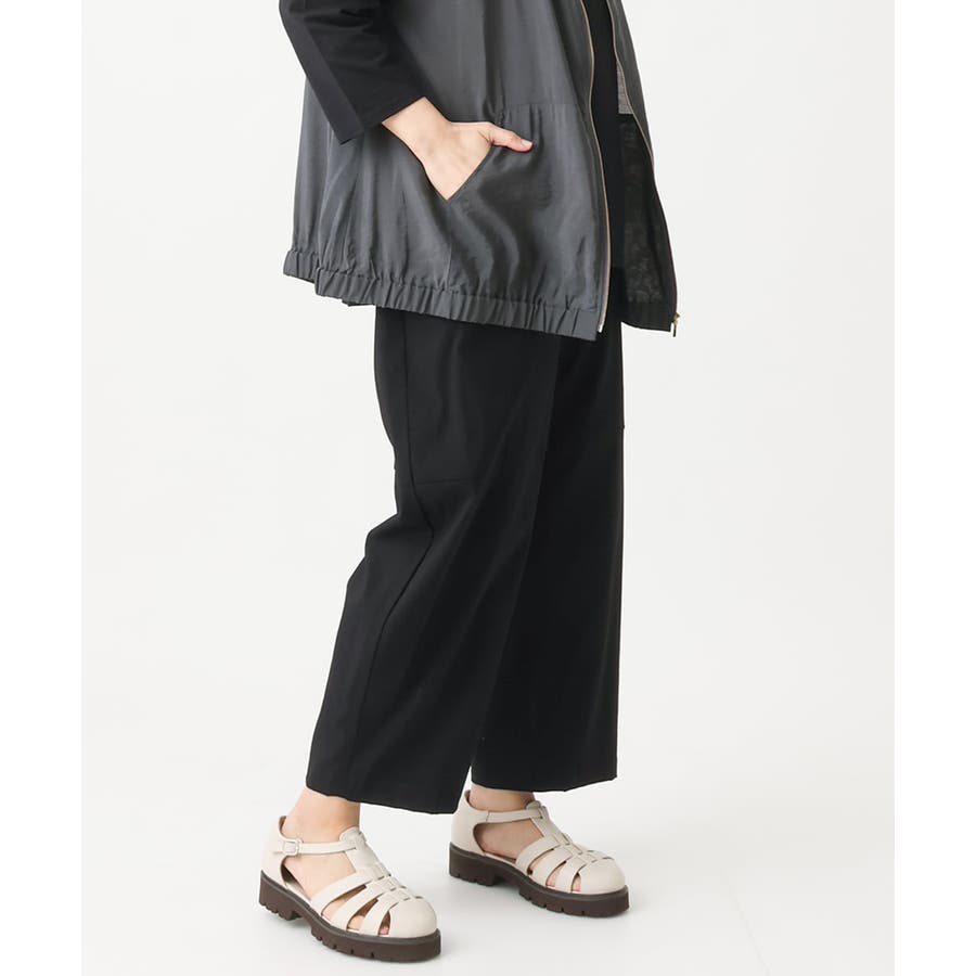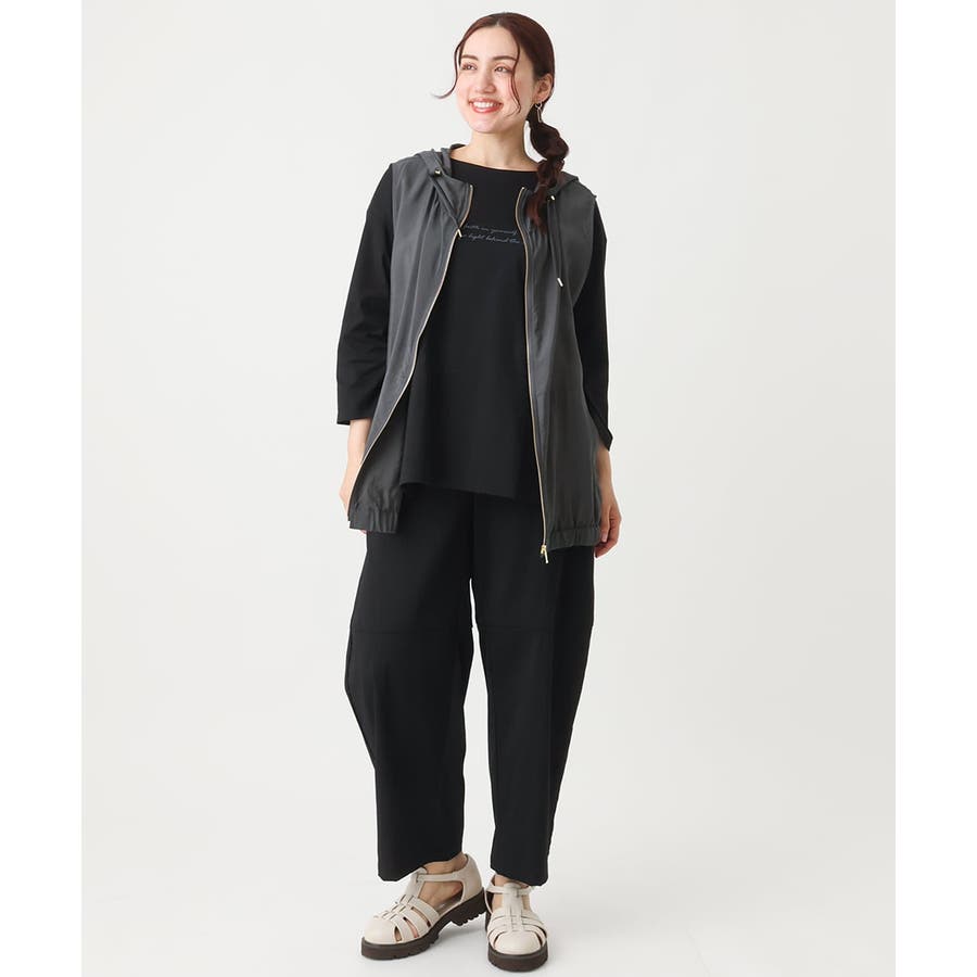 落ち感のある生地を、ゆるやかなカーブシルエットで取っているので、縦ラインも入りきれいなシルエット。