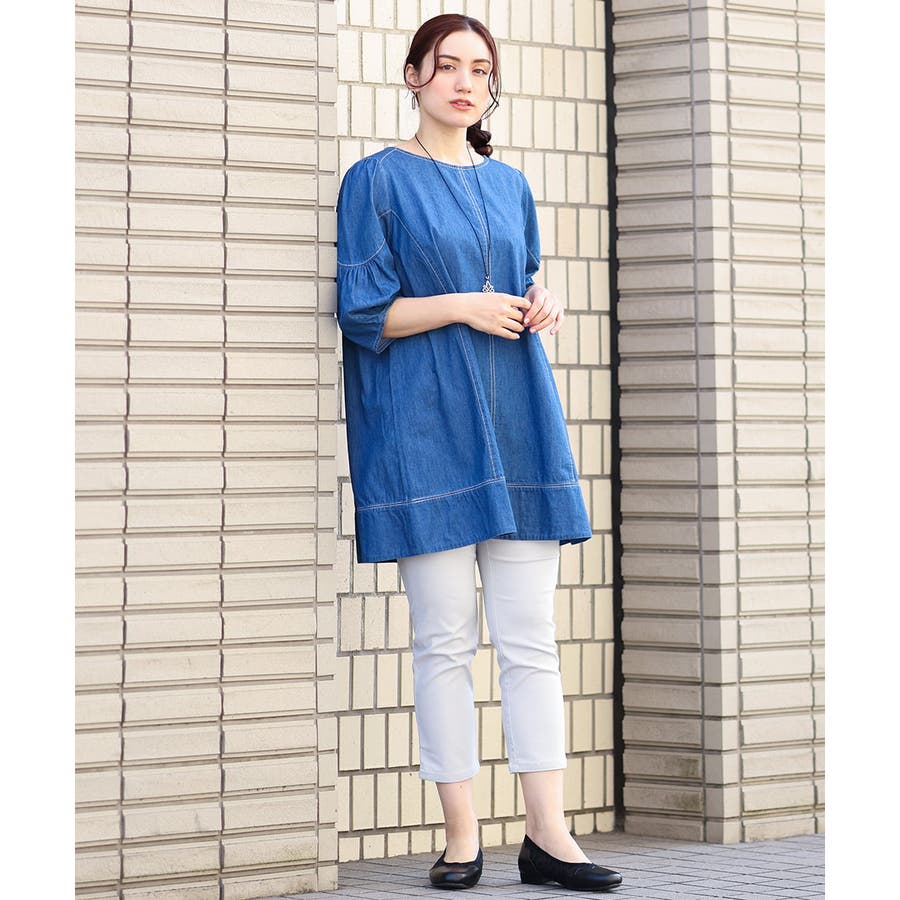 チュニックなど着丈長めのアイテムと合わせてもすっきり着られます。