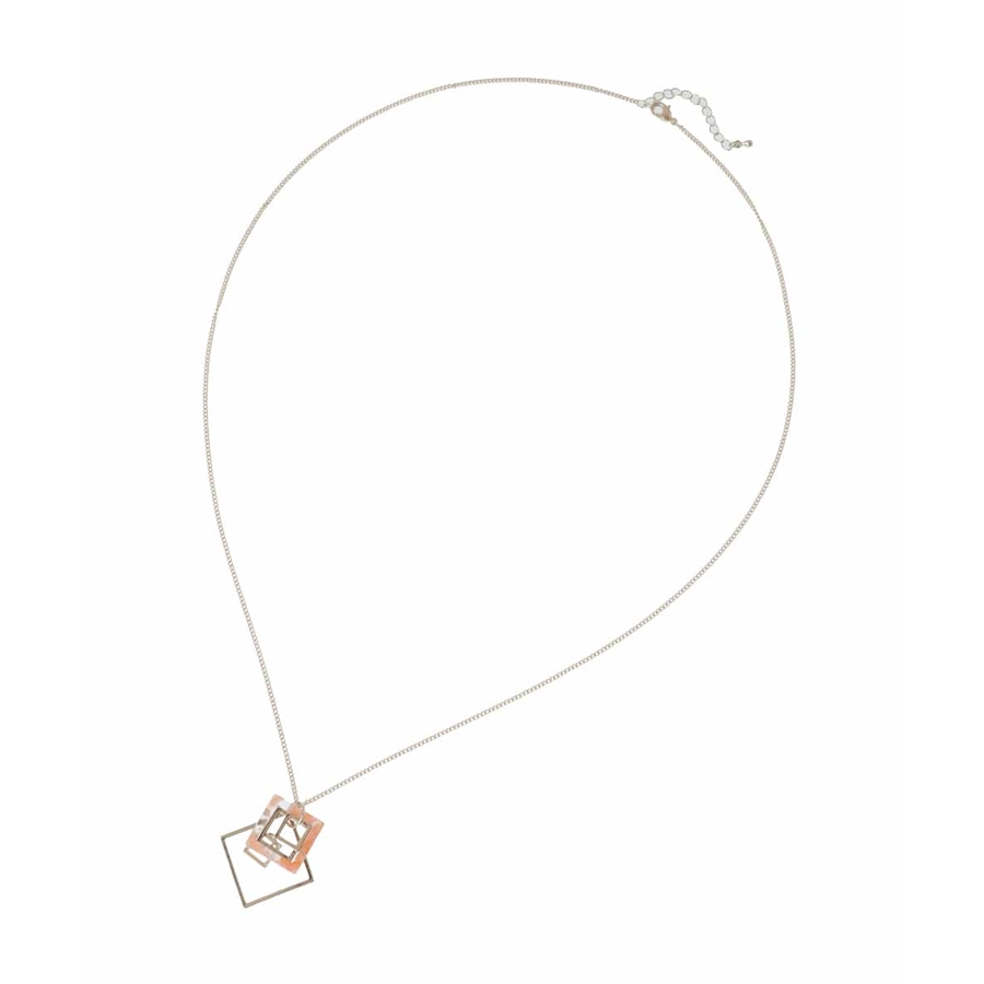 胸元で揺れるニュアンスがスタイリングにアクセントを加えるデザインネックレス。大小のメタルスクエアにストーン調のアクリルパーツを合わせ、立体感のあるトップに仕立てました。華奢なロングチェーンで縦ラインを強調し、スタイルアップも後押し。大人かっこいいコーディネートにも最適な汎用性の高いアイテムです。