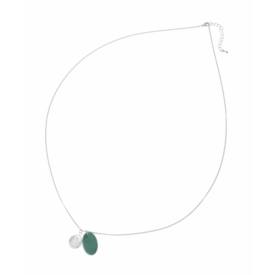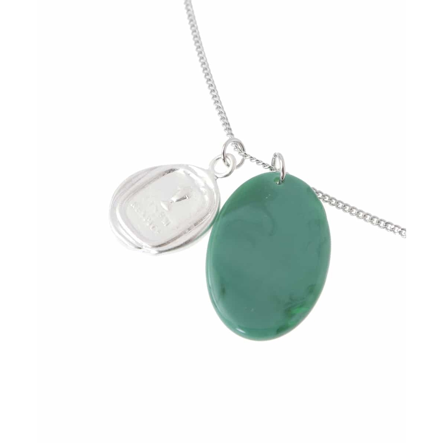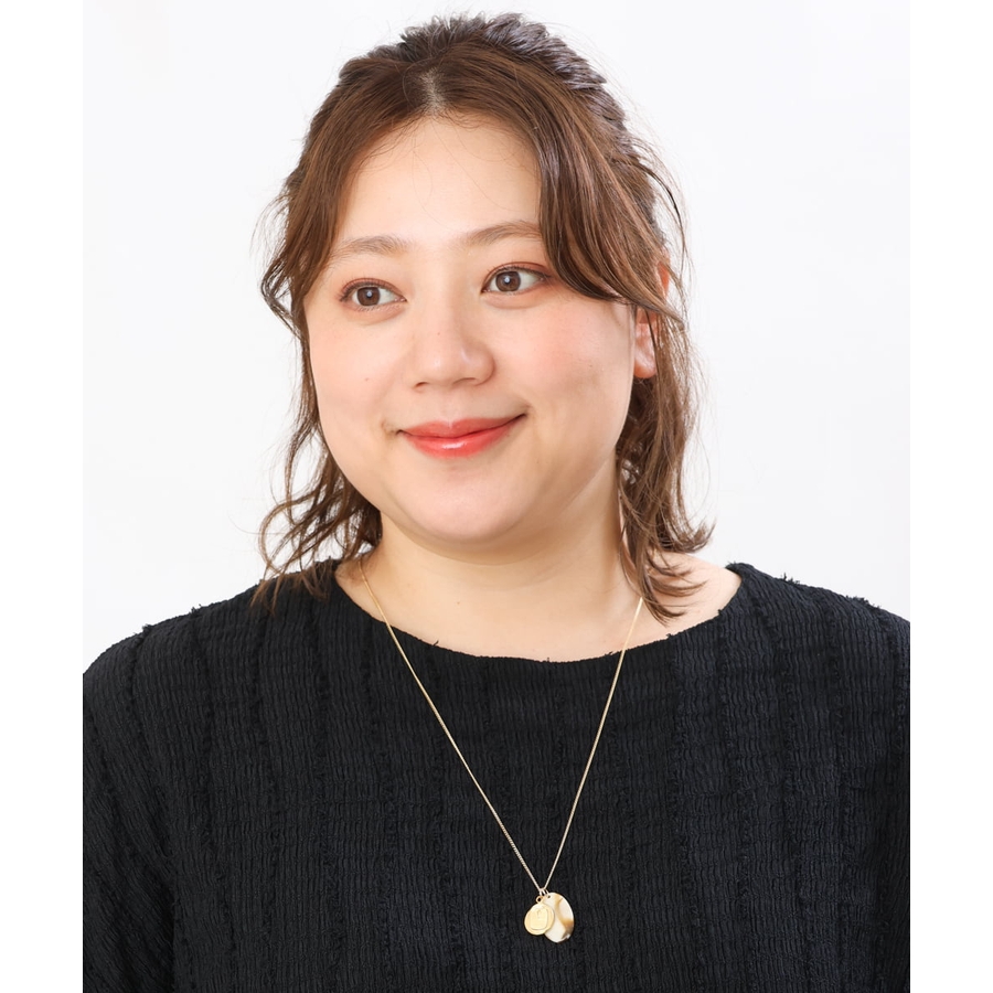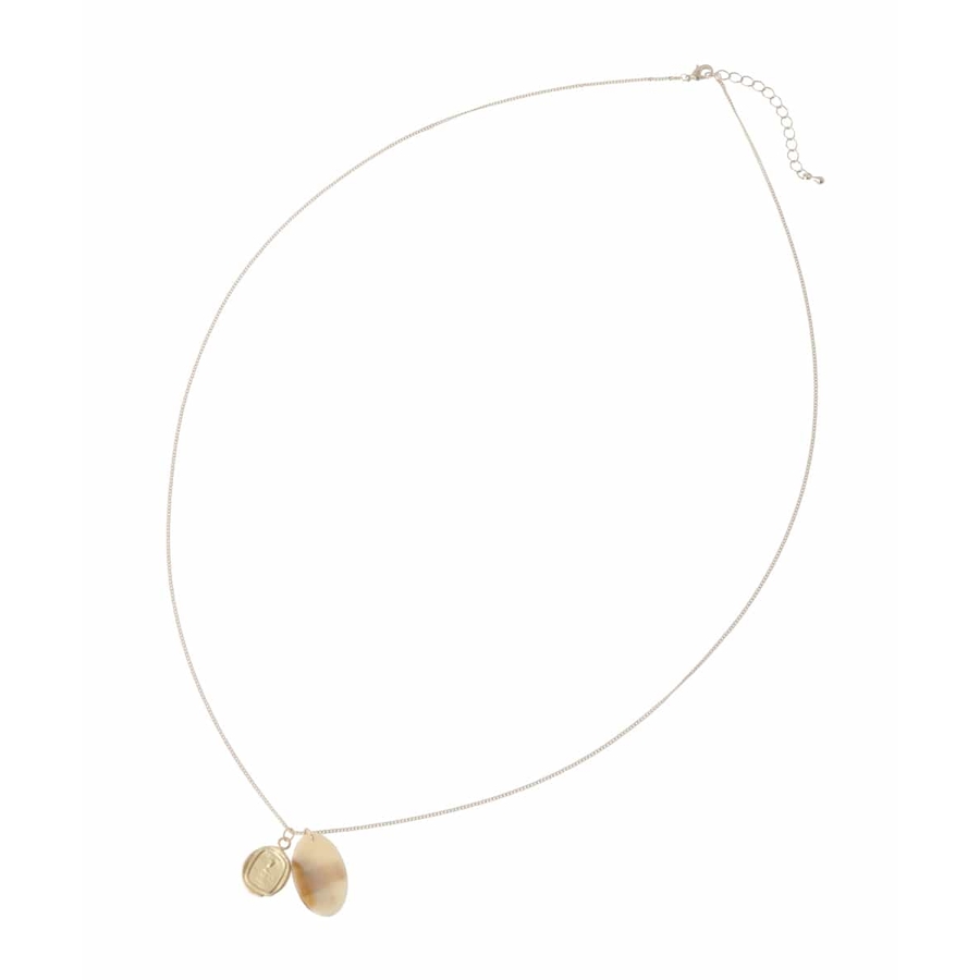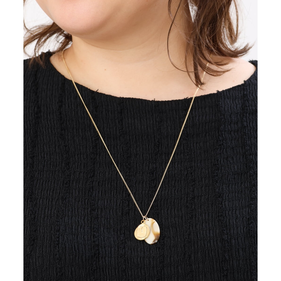 マーブルストーン調のカラーモチーフとコイン風のメタルチップがアクセントのネックレス。細めの華奢なシンプルチェーンに揺れるコントラストの効いたニュアンスがエレガントで上品な印象です。ロングタイプなので縦ラインを強調し、すっきり見えするデザイン。カジュアルにもきれい目にも合わせられる汎用性の高いおすすめアイテムです。