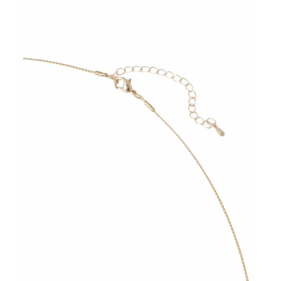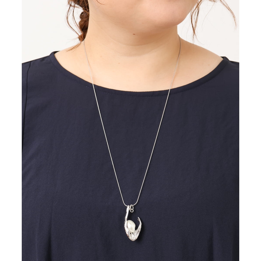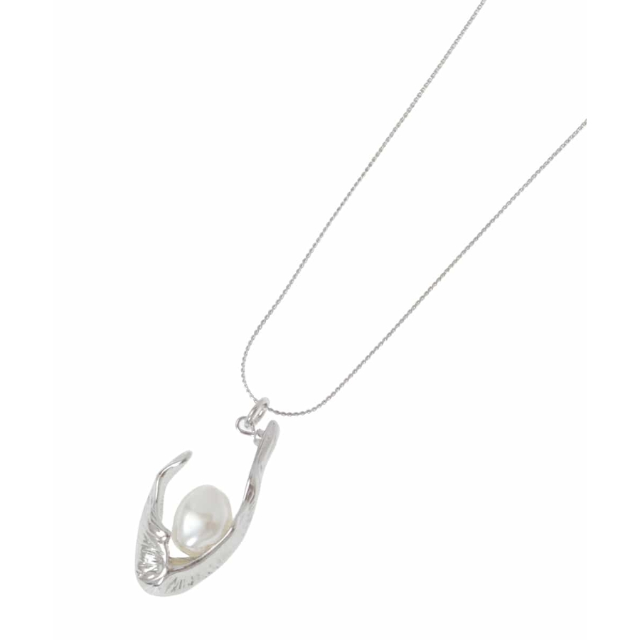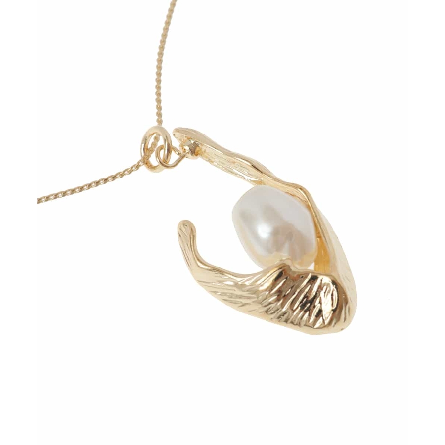 メタルパーツの中で輝くパール風モチーフが女性らいしい印象のネックレス。