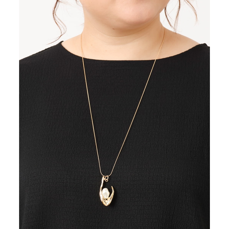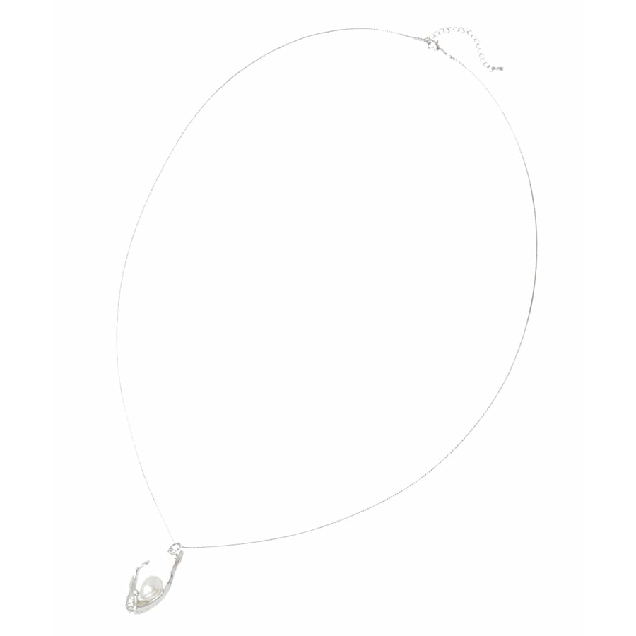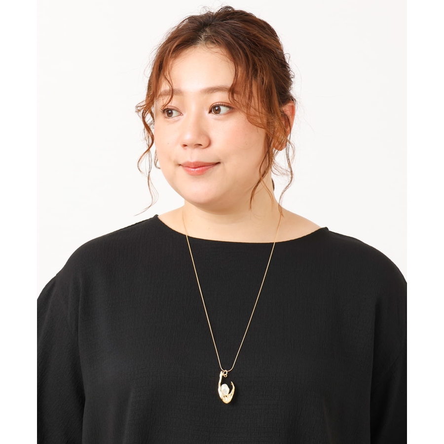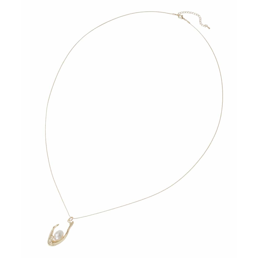 メタルパーツの中で輝くパール風モチーフが女性らいしい印象のネックレス。