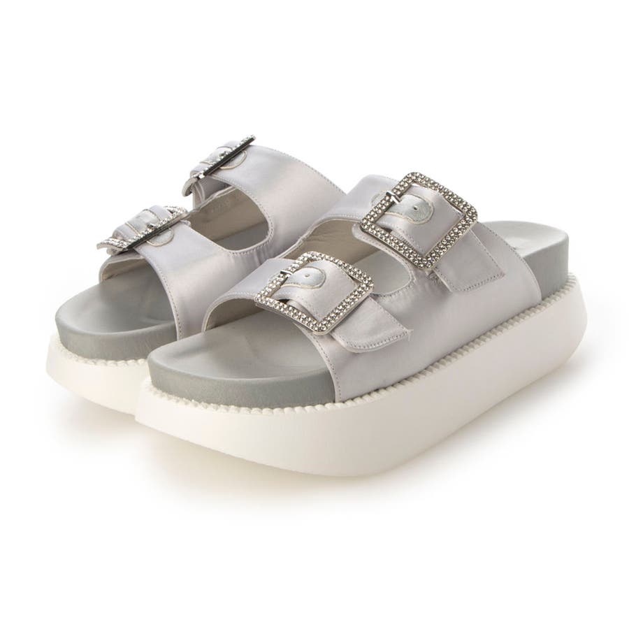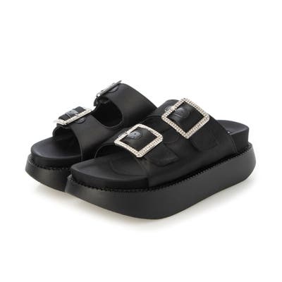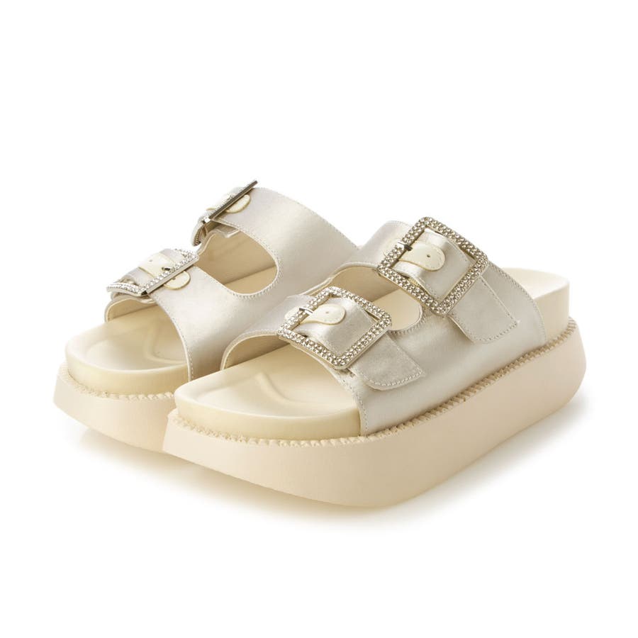 ボリューム感が今年らしい厚底サンダル。アッパーには目を惹く大きめのビジューバックルを使用し、足元に華やかさをプラスしてくれます。カジュアル感のあるソールにあえてビジューバックルを組み合わせることで、スポーティーになりすぎず幅広いスタイリングにマッチ。高低差を感じにくい厚底ソールで、簡単にスタイルアップが叶うのも嬉しいポイント!