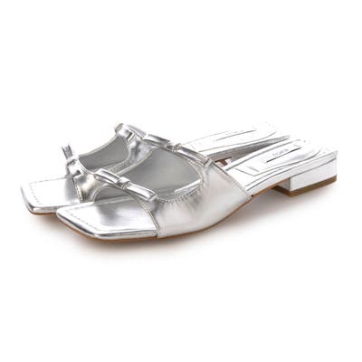 レディース サンダル リボン ダブルリボン スクエアトゥ ローヒール 歩きやすい シルバー フラット メタリック リゾート 旅行 安定感 スッと履ける 甲高 幅広 レディ ガーリー カジュアルコーデ シンプルコーデ 華奢見え デイリーユース ふかふか 疲れにくい 大きいサイズ LLサイズ