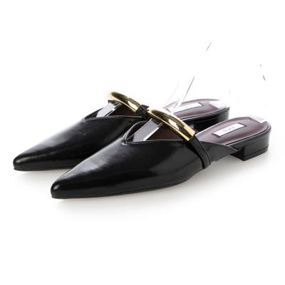 コメント:私は足長が23.2cmなのでMサイズだといつも少し余裕がありますが、ゆったりした履き心地が好きなので普段23.5cmもしくはMサイズを着用します。こちらも普段通りMサイズでピッタリです。ポインテッドトゥでシャープなシルエットですが、材料がとても柔らかく、見た目以上に履きやすいです。私はやや甲が薄めなので、ミュールタイプは物によっては脱げやすくなってしまいますが、甲部分にベルトがついていることでホールド感が出てしっかり足にフィットしてくれます。ゴールドパーツがアクセントになり、カジュアルにも綺麗めにも合わせやすいです!私は緩めのパンツスタイルと合わせて履きたいです。