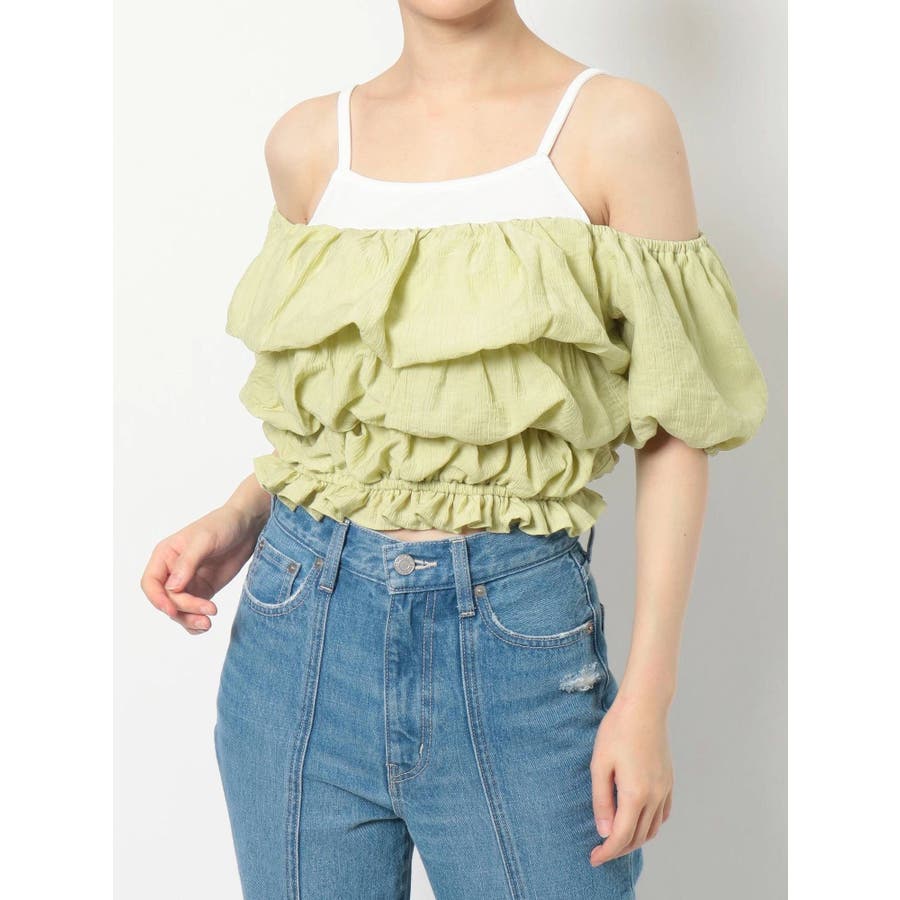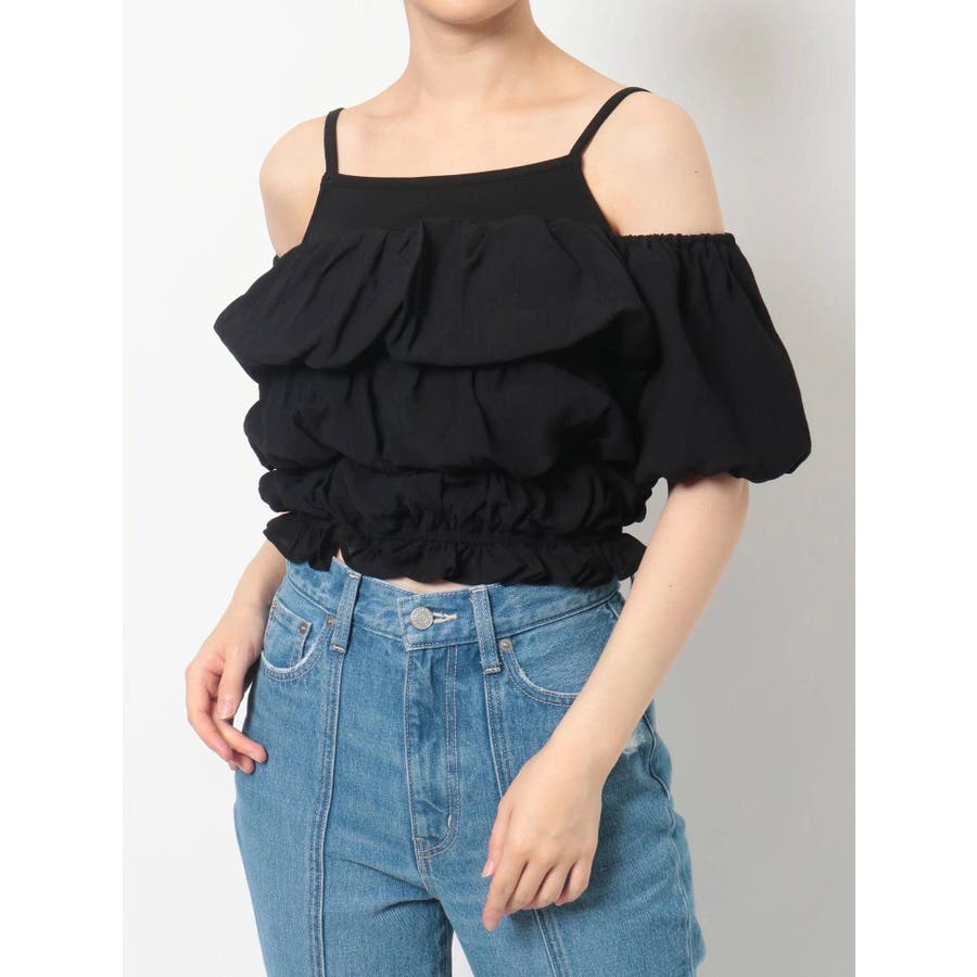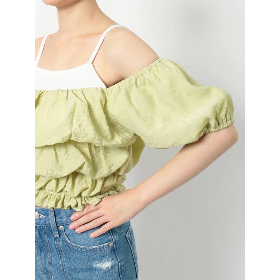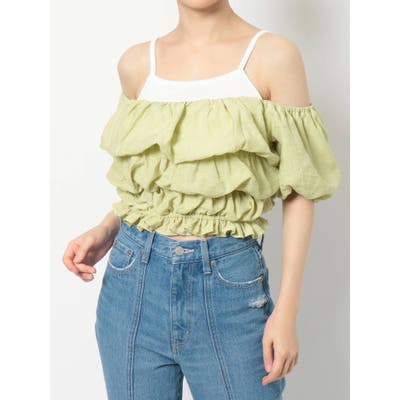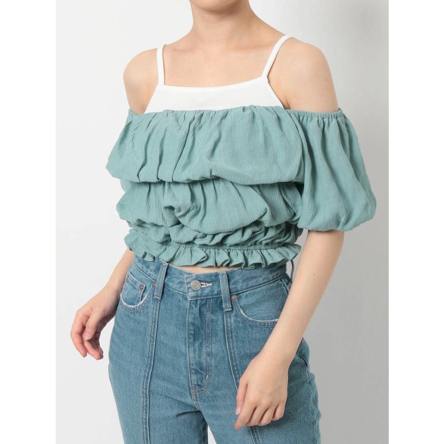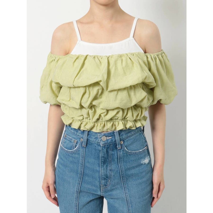 キャミソールとギャザートップスをドッキングしたデザインのショートトップスです。パッド付きで1枚でも着用可能です。オフショルですがストラップが付いているので安定感があり着用しやすいです。ギャザーはたっぷり入っているので女性らしい仕上がりです。可愛らしい印象なのでデニムと合わせてカジュアルダウンさせるコーディネートがおすすめ◎ハイウエストボトムスと合わせればメリハリもついてスタイルアップになります。