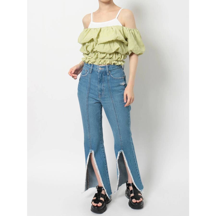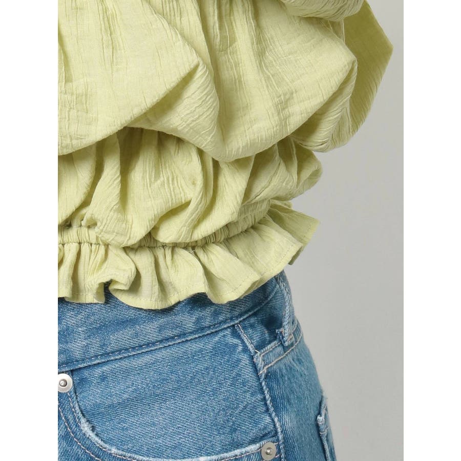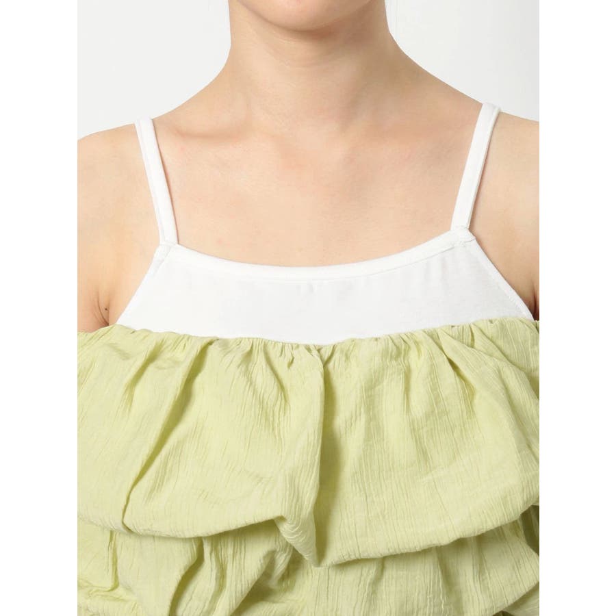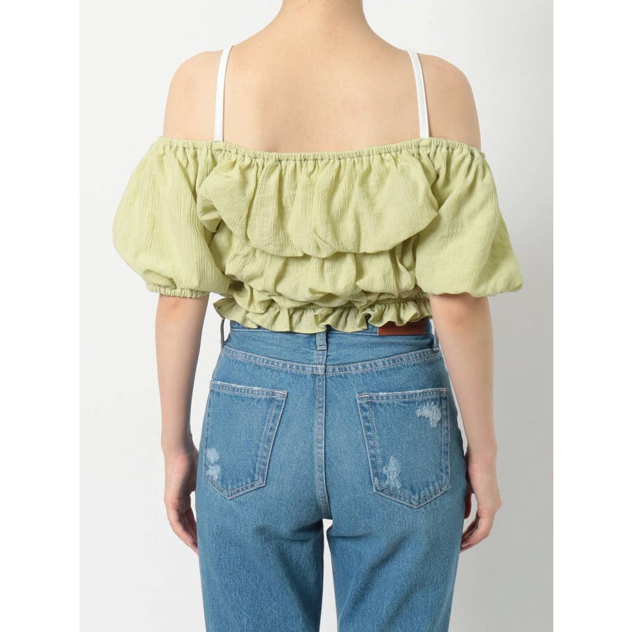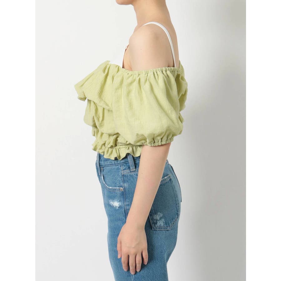 キャミソールとギャザートップスをドッキングしたデザインのショートトップスです。パッド付きで1枚でも着用可能です。オフショルですがストラップが付いているので安定感があり着用しやすいです。ギャザーはたっぷり入っているので女性らしい仕上がりです。可愛らしい印象なのでデニムと合わせてカジュアルダウンさせるコーディネートがおすすめ◎ハイウエストボトムスと合わせればメリハリもついてスタイルアップになります。