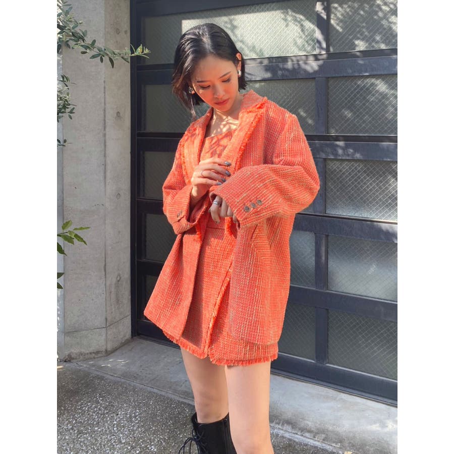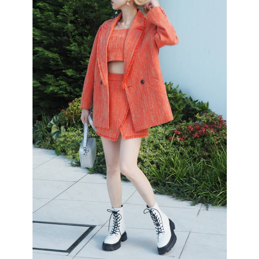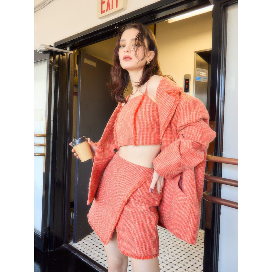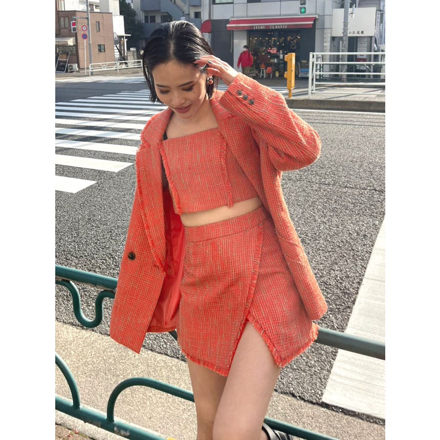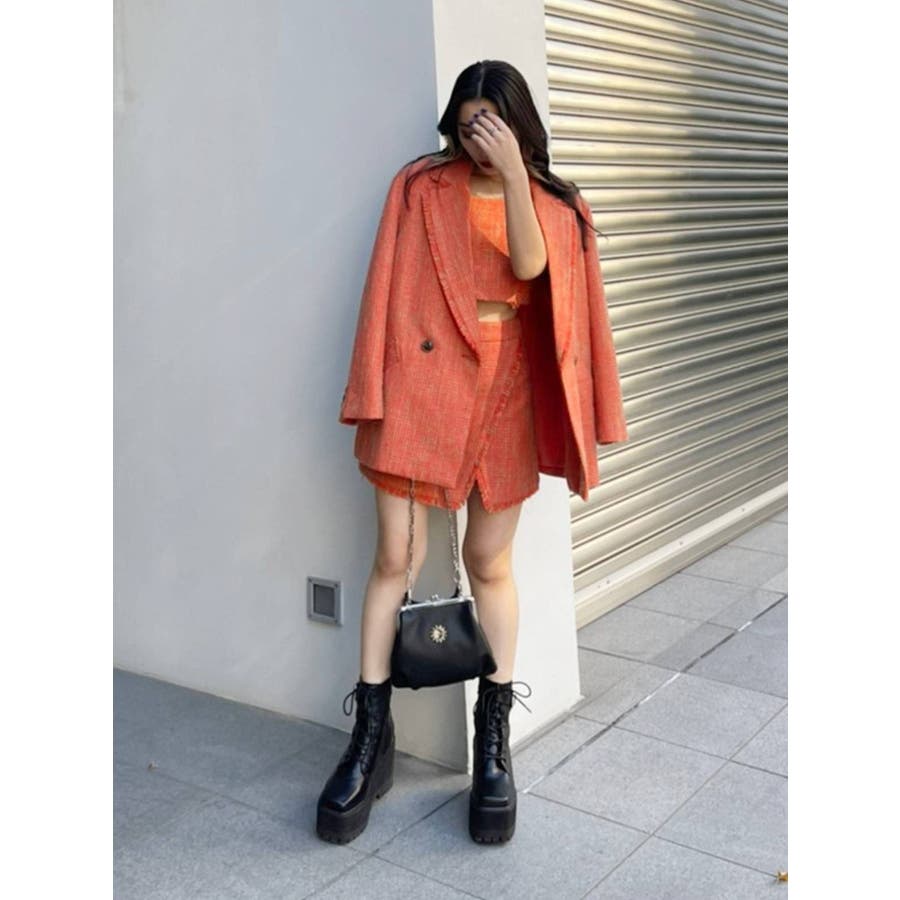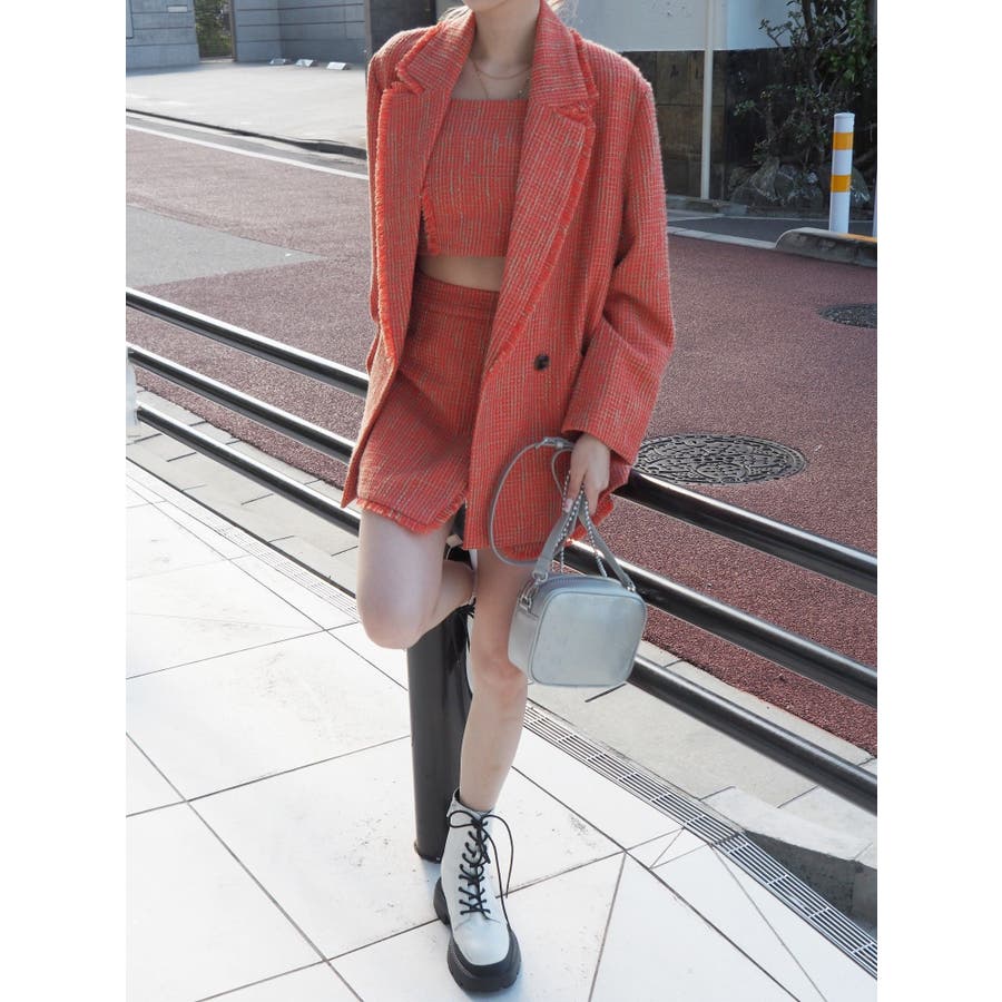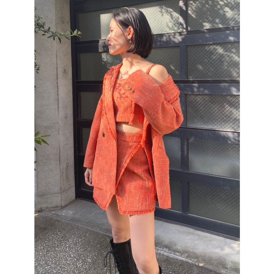同素材のジャケットとビスチェと合わせたセットアップでの着用がおすすめ。