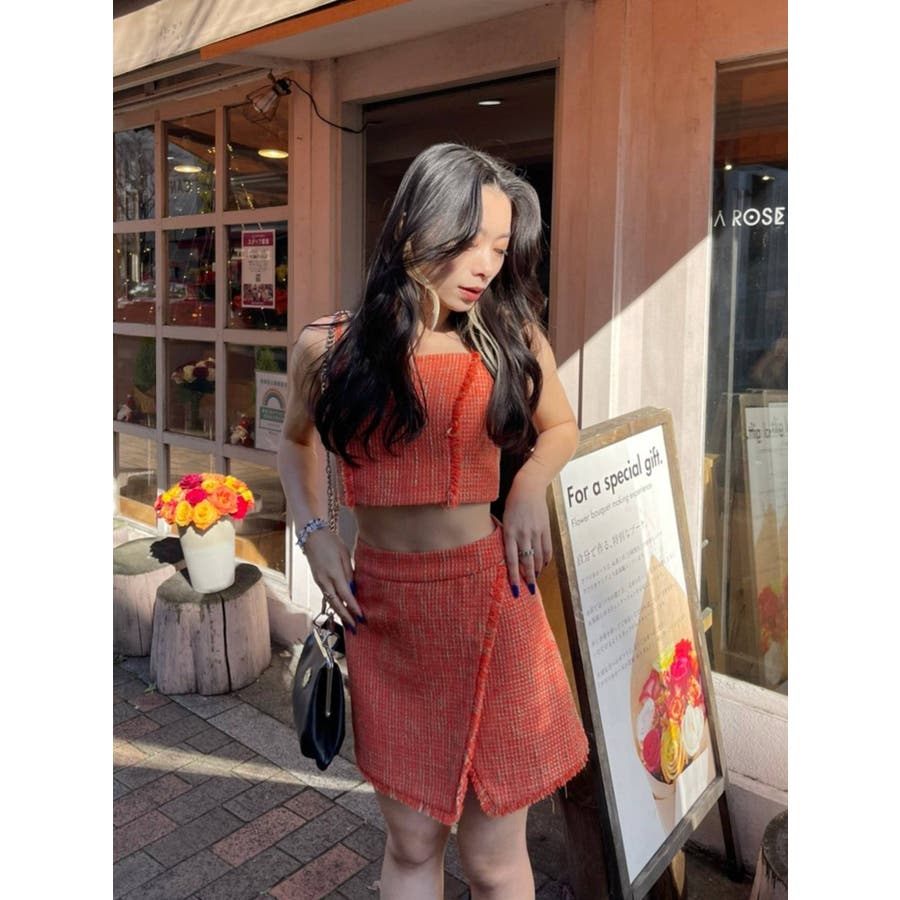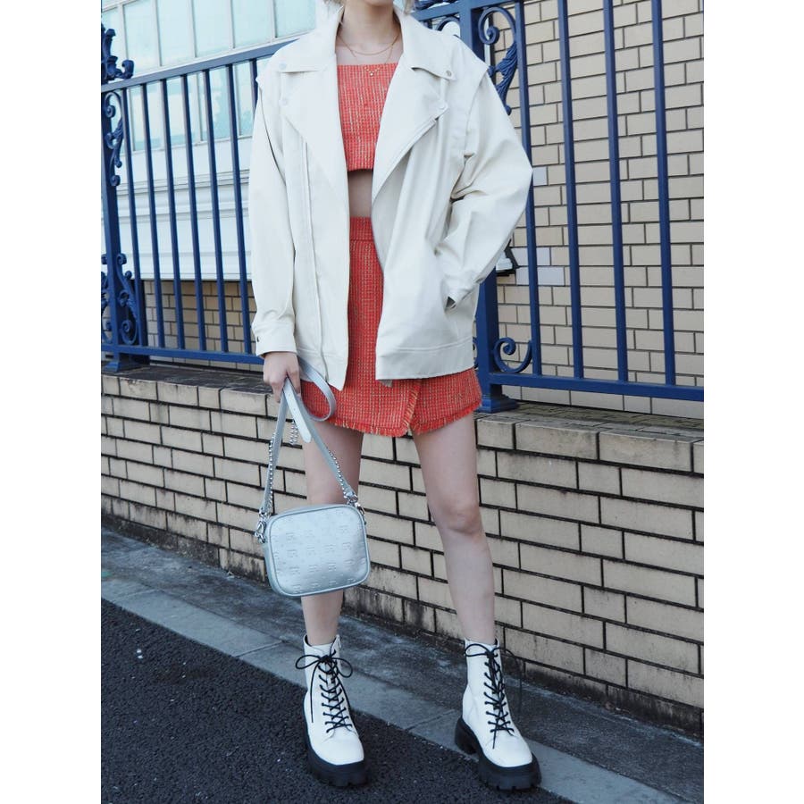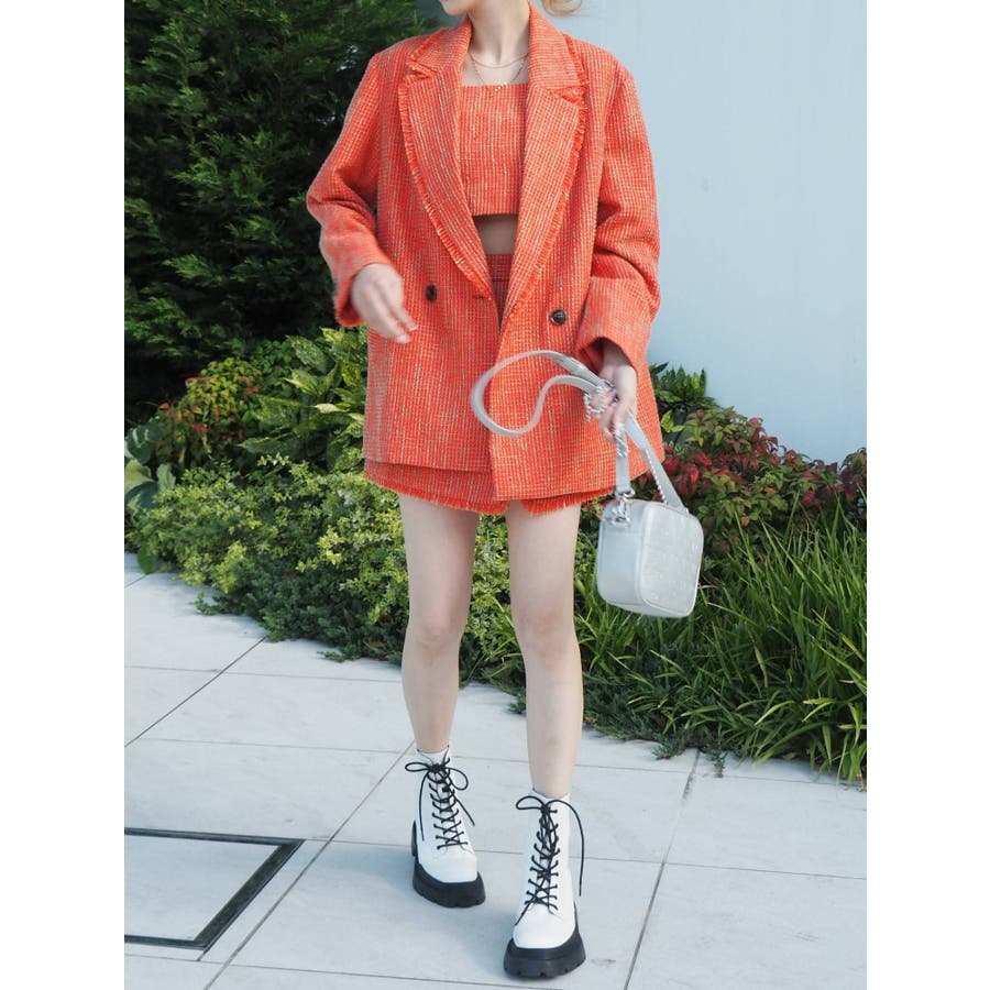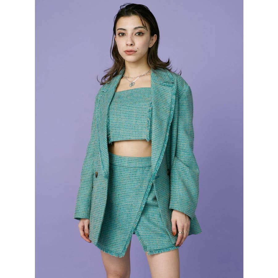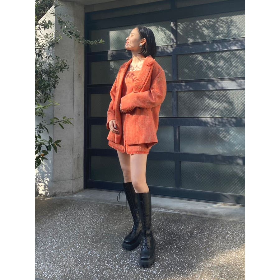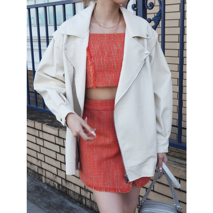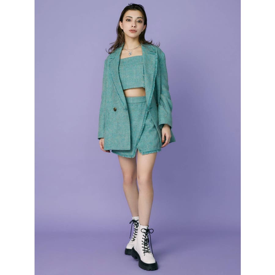 同素材のジャケットとビスチェと合わせたセットアップでの着用がおすすめ。