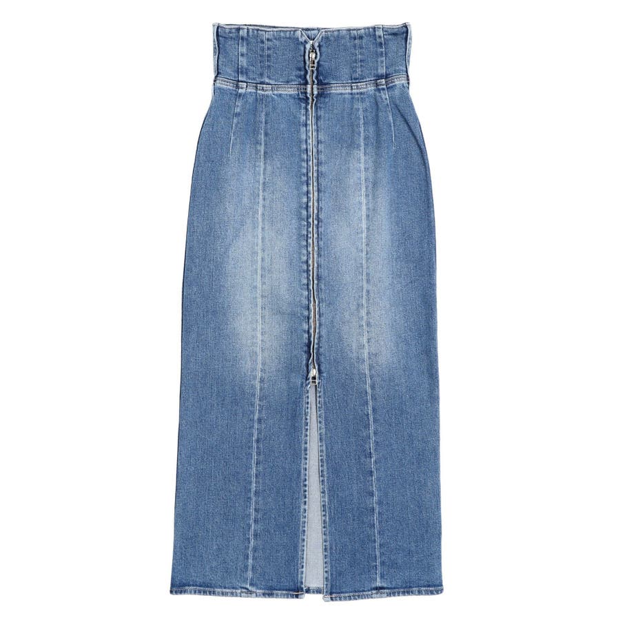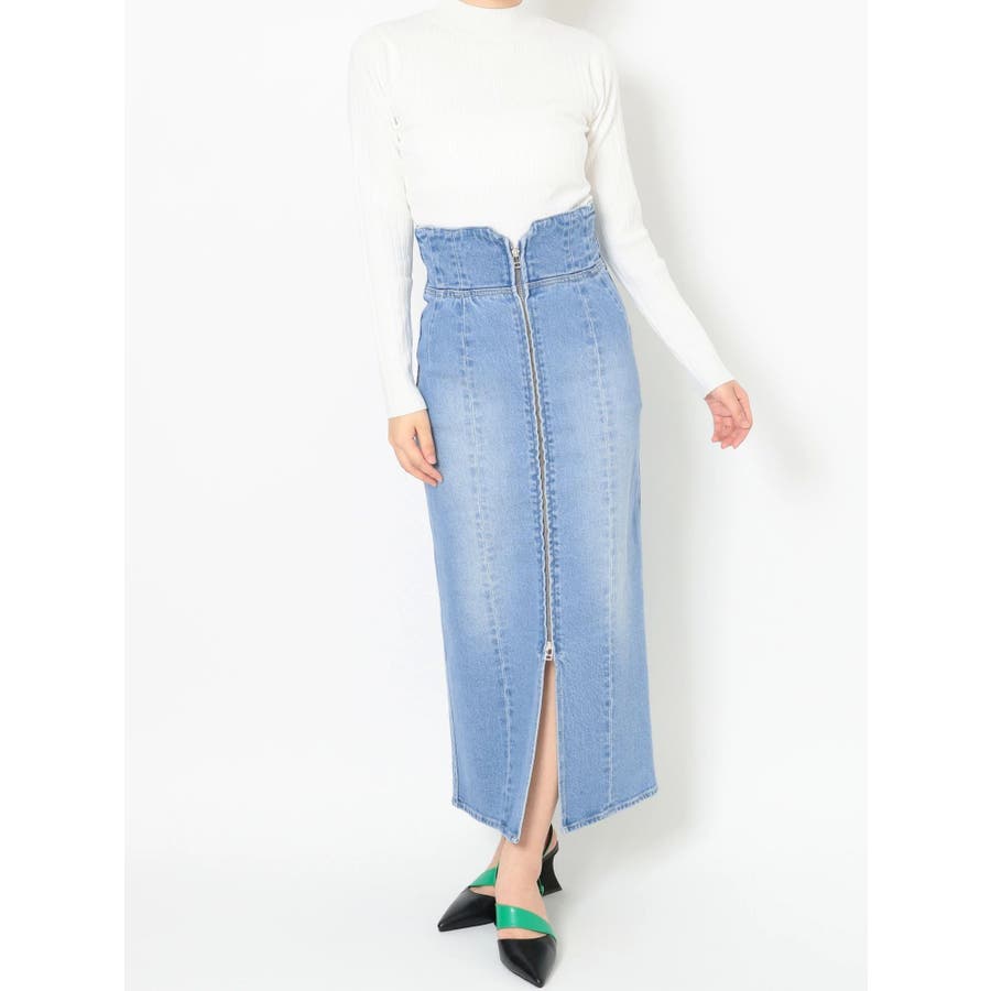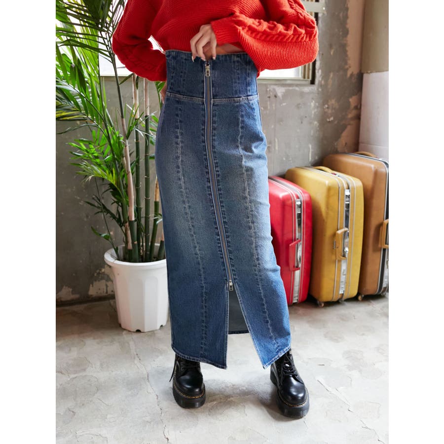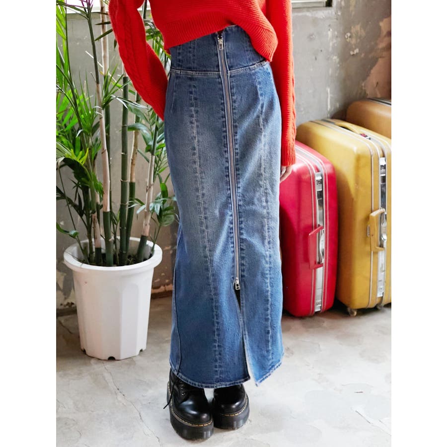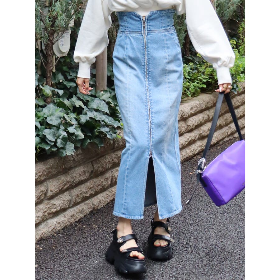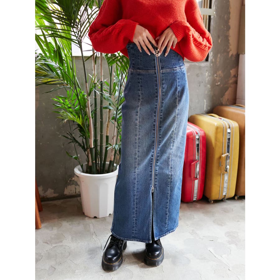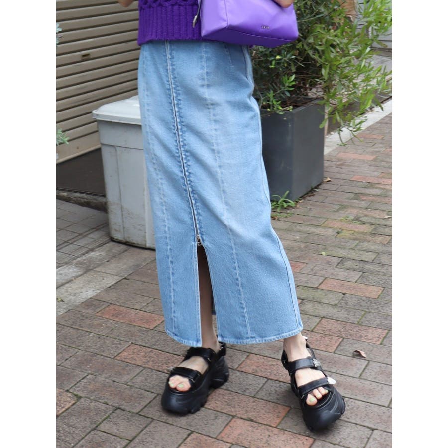 ■デザイントレンド感あるジップとスリットが印象的なデニムスカート。ダブルジップを使用しているのでスリットの深さはお好みで調節していただけます。タイトなシルエットながら、ストレッチが入った生地を使用しているのでごわつかず、ノンストレスで着用していただけます。■スタイリングハイウエストなのでコンパクトなトップスとの相性抜群。スリットにはボリュームのあるブーツ合わせがテッパン。-------------- 透け感:なし 裏地:あり生地の厚み:普通伸縮性:あり--------------フロントのファスナーとハイウエストなデザインがポイントのデニムスカートです。ストレッチ入りの生地を使用してるため、履き心地が良いです。ダブルジップを仕様しているため、スリットを深く調整できる仕様になっています。