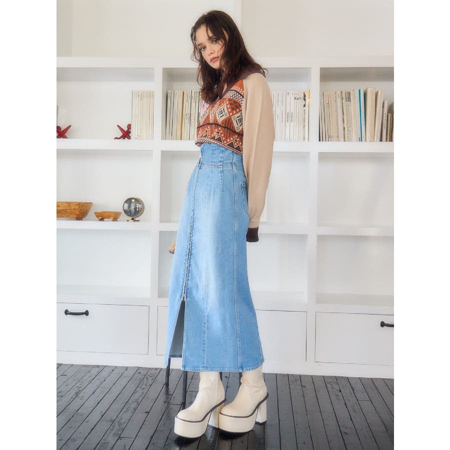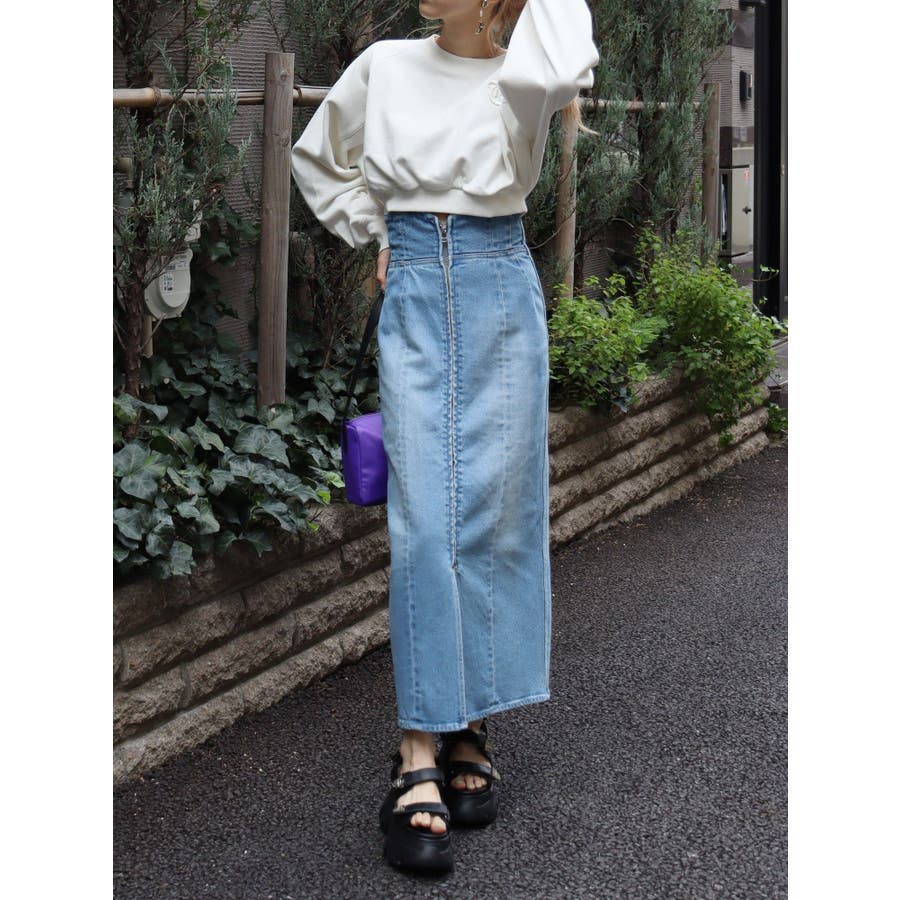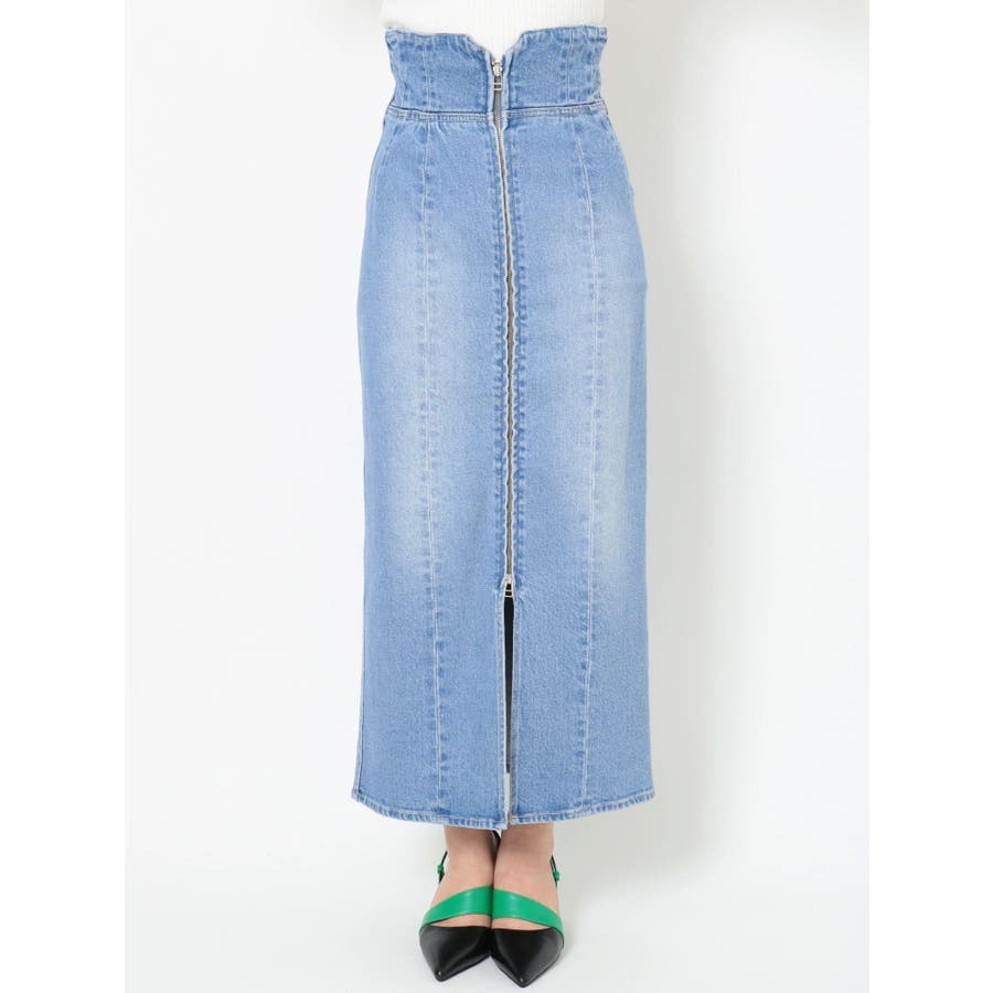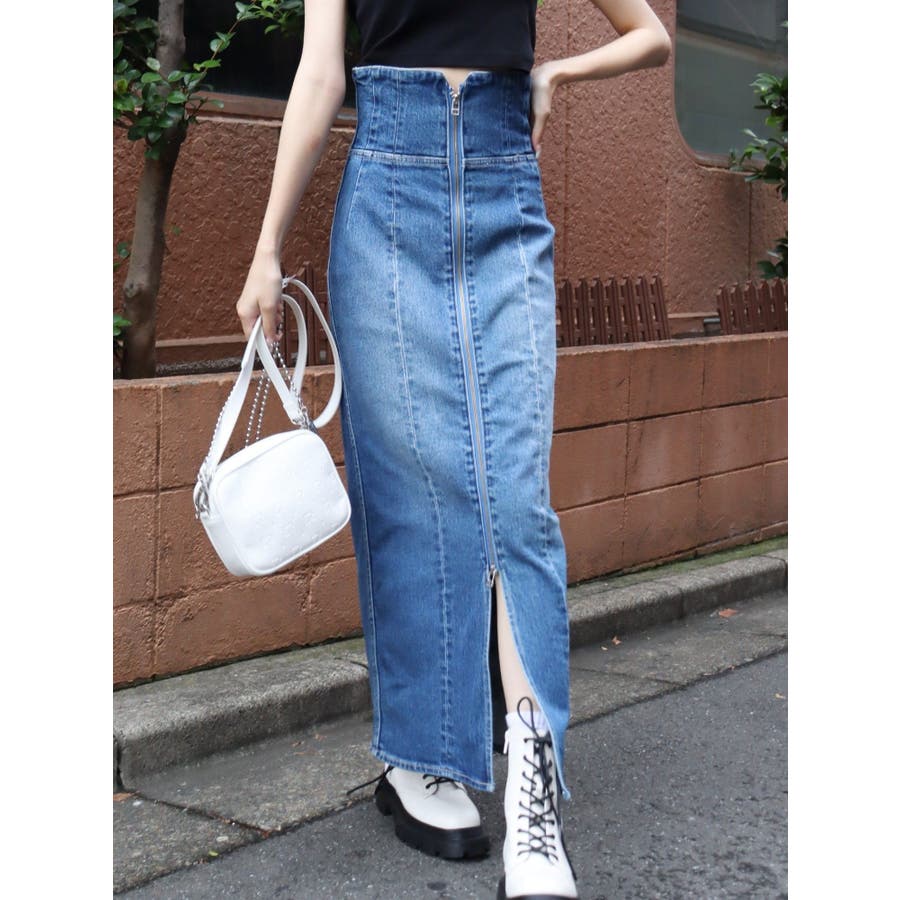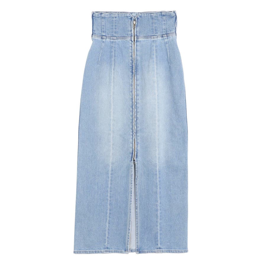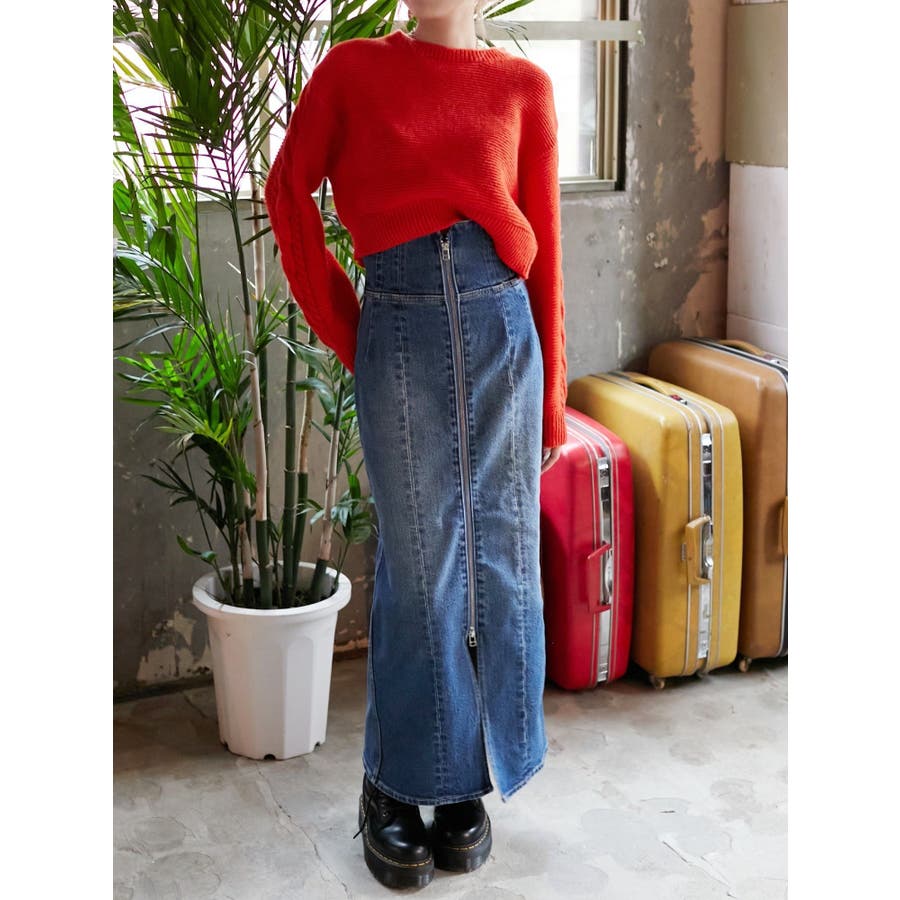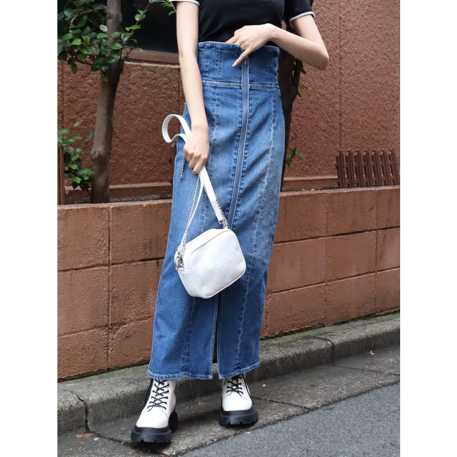 ■デザイントレンド感あるジップとスリットが印象的なデニムスカート。ダブルジップを使用しているのでスリットの深さはお好みで調節していただけます。タイトなシルエットながら、ストレッチが入った生地を使用しているのでごわつかず、ノンストレスで着用していただけます。■スタイリングハイウエストなのでコンパクトなトップスとの相性抜群。スリットにはボリュームのあるブーツ合わせがテッパン。-------------- 透け感:なし 裏地:あり生地の厚み:普通伸縮性:あり--------------フロントのファスナーとハイウエストなデザインがポイントのデニムスカートです。ストレッチ入りの生地を使用してるため、履き心地が良いです。ダブルジップを仕様しているため、スリットを深く調整できる仕様になっています。