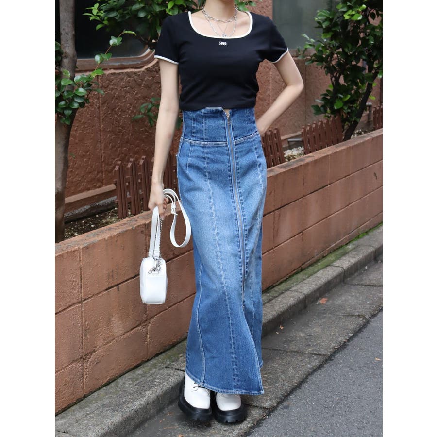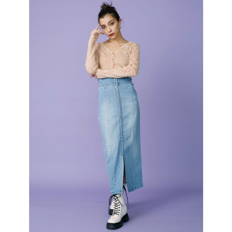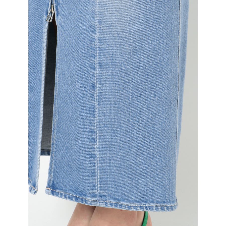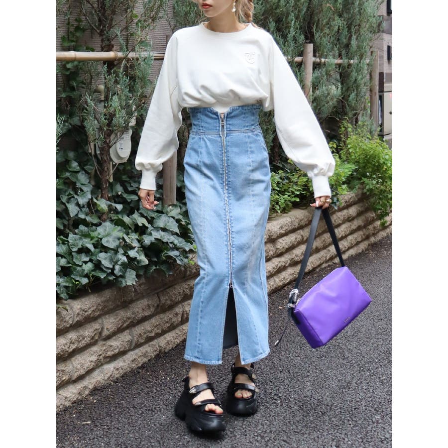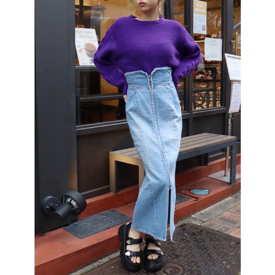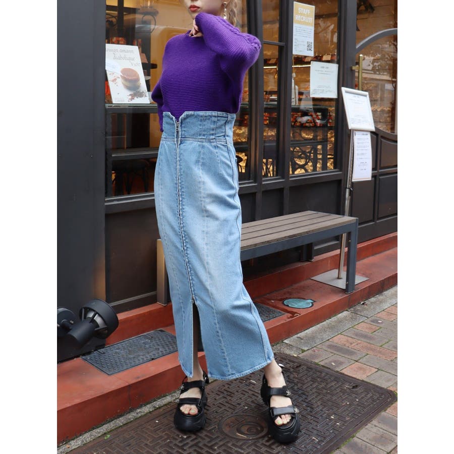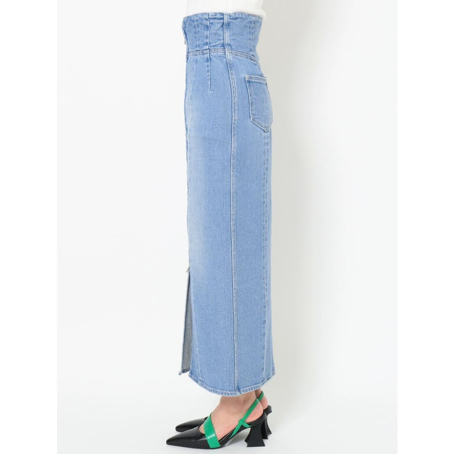■デザイントレンド感あるジップとスリットが印象的なデニムスカート。ダブルジップを使用しているのでスリットの深さはお好みで調節していただけます。タイトなシルエットながら、ストレッチが入った生地を使用しているのでごわつかず、ノンストレスで着用していただけます。■スタイリングハイウエストなのでコンパクトなトップスとの相性抜群。スリットにはボリュームのあるブーツ合わせがテッパン。-------------- 透け感:なし 裏地:あり生地の厚み:普通伸縮性:あり--------------フロントのファスナーとハイウエストなデザインがポイントのデニムスカートです。ストレッチ入りの生地を使用してるため、履き心地が良いです。ダブルジップを仕様しているため、スリットを深く調整できる仕様になっています。