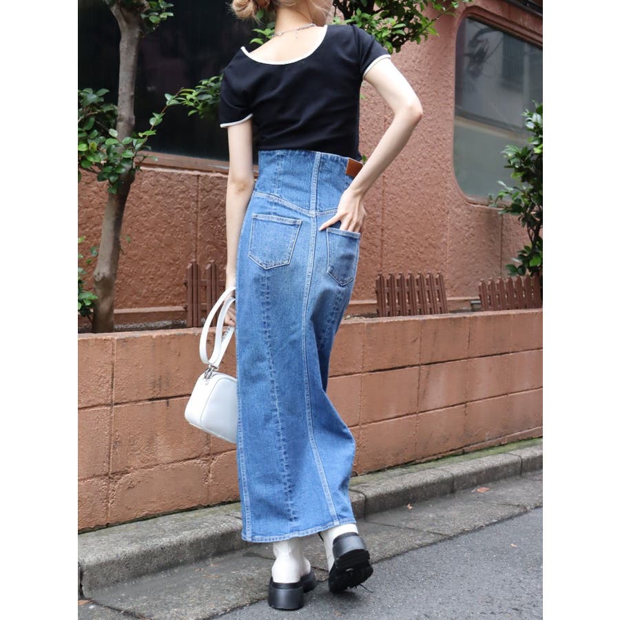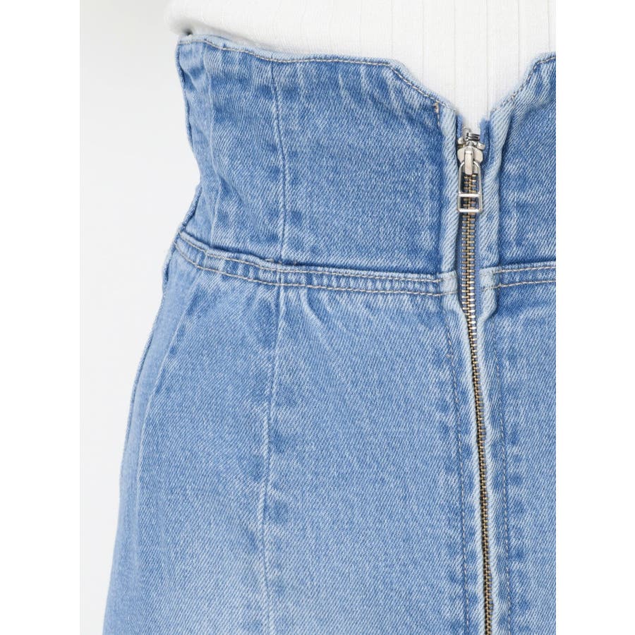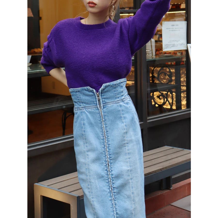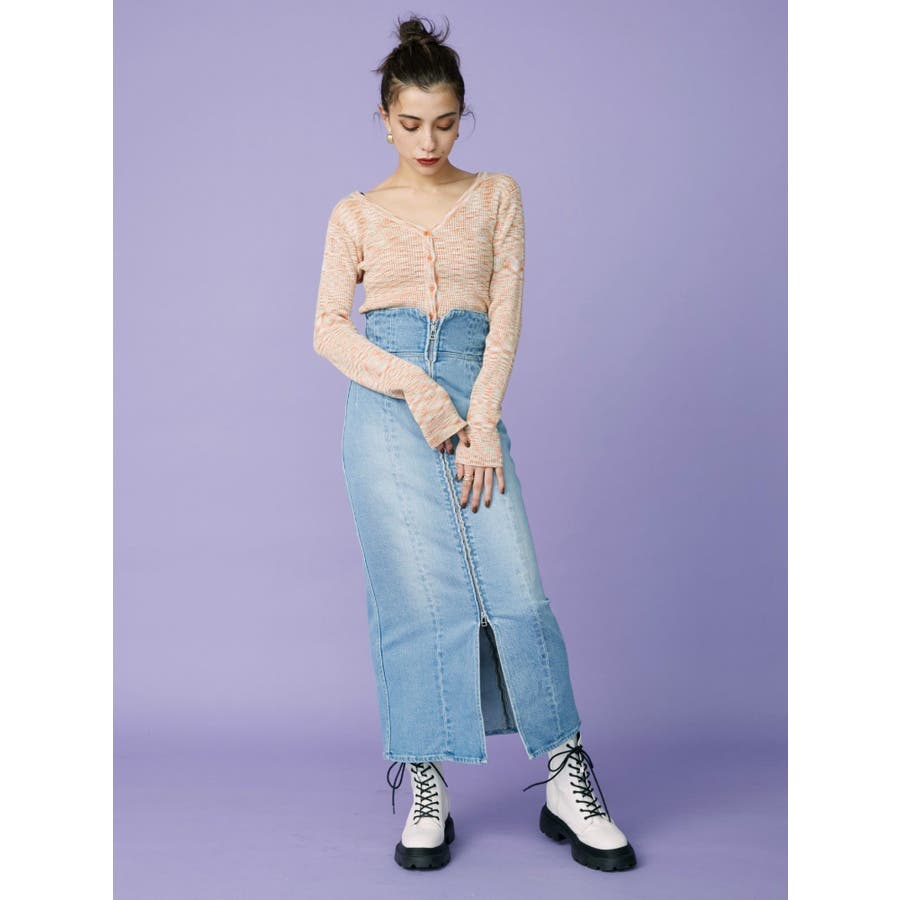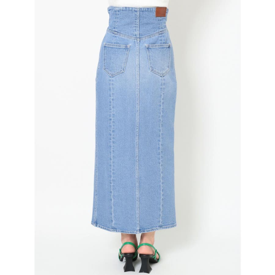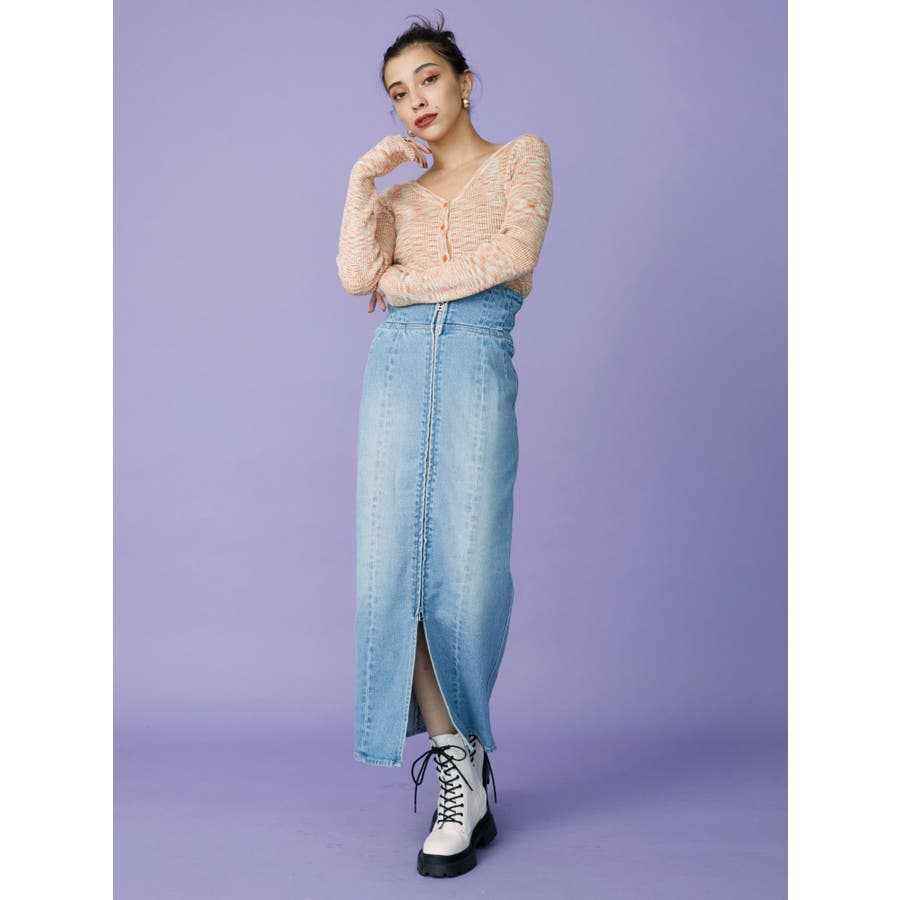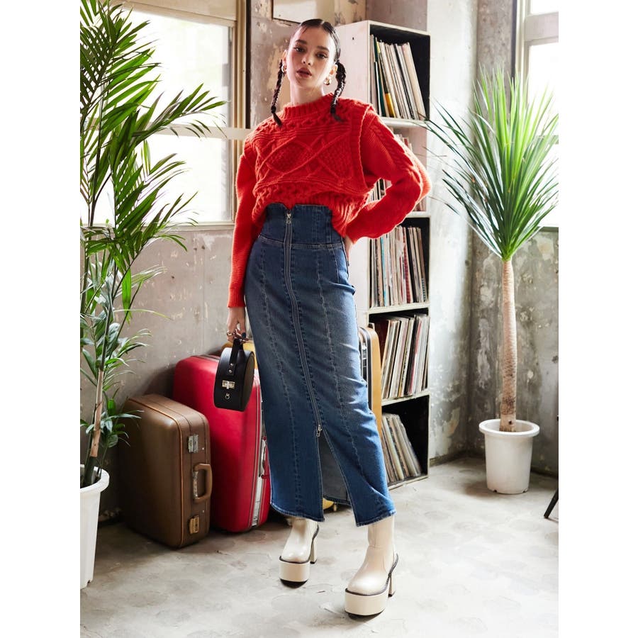 ■デザイントレンド感あるジップとスリットが印象的なデニムスカート。ダブルジップを使用しているのでスリットの深さはお好みで調節していただけます。タイトなシルエットながら、ストレッチが入った生地を使用しているのでごわつかず、ノンストレスで着用していただけます。■スタイリングハイウエストなのでコンパクトなトップスとの相性抜群。スリットにはボリュームのあるブーツ合わせがテッパン。-------------- 透け感:なし 裏地:あり生地の厚み:普通伸縮性:あり--------------フロントのファスナーとハイウエストなデザインがポイントのデニムスカートです。ストレッチ入りの生地を使用してるため、履き心地が良いです。ダブルジップを仕様しているため、スリットを深く調整できる仕様になっています。