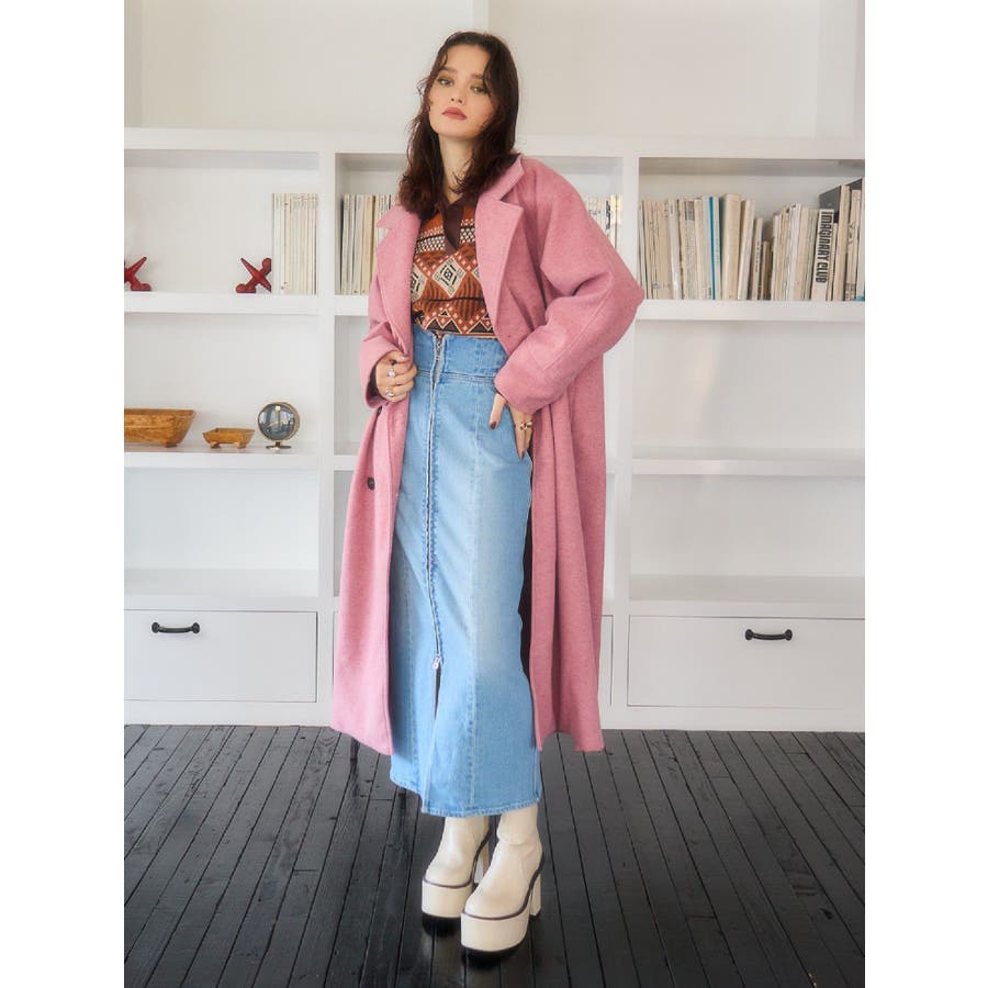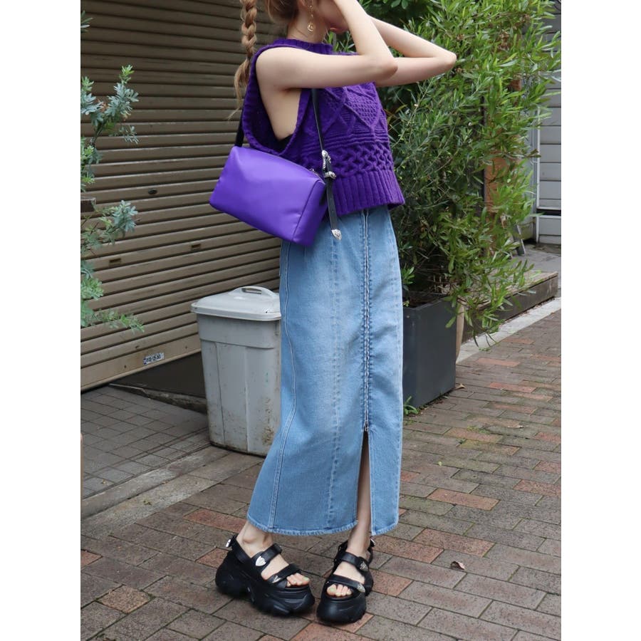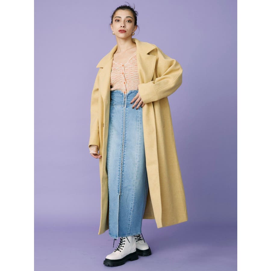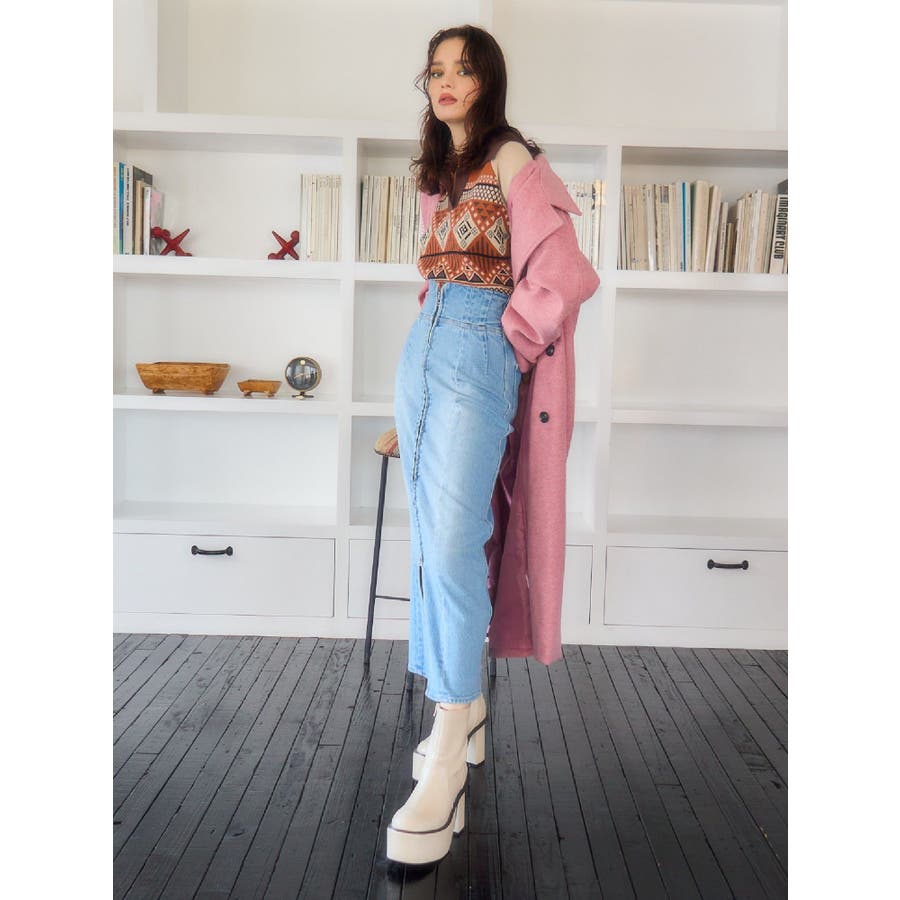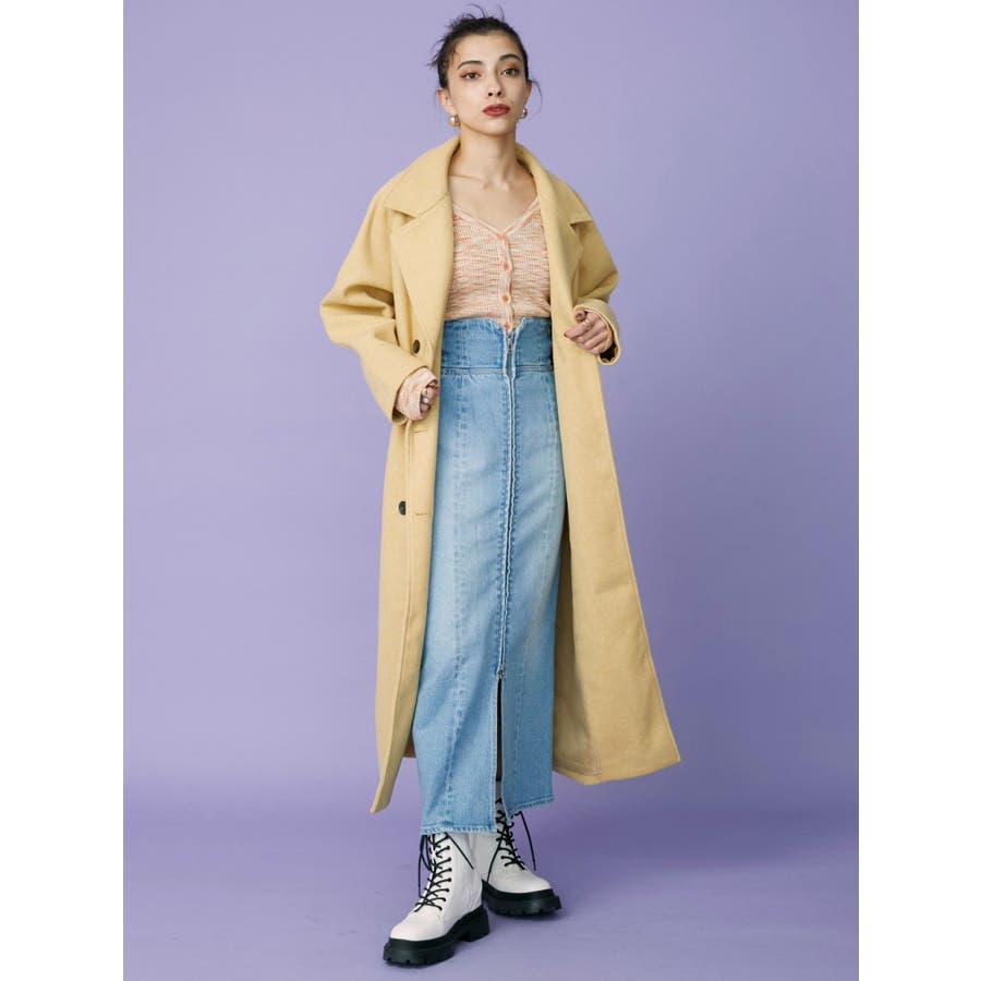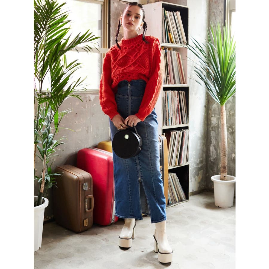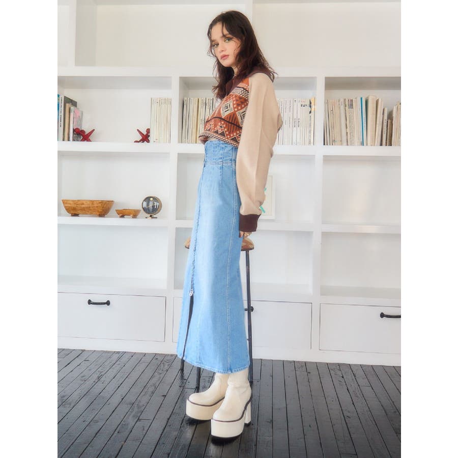 ■デザイントレンド感あるジップとスリットが印象的なデニムスカート。ダブルジップを使用しているのでスリットの深さはお好みで調節していただけます。タイトなシルエットながら、ストレッチが入った生地を使用しているのでごわつかず、ノンストレスで着用していただけます。■スタイリングハイウエストなのでコンパクトなトップスとの相性抜群。スリットにはボリュームのあるブーツ合わせがテッパン。-------------- 透け感:なし 裏地:あり生地の厚み:普通伸縮性:あり--------------フロントのファスナーとハイウエストなデザインがポイントのデニムスカートです。ストレッチ入りの生地を使用してるため、履き心地が良いです。ダブルジップを仕様しているため、スリットを深く調整できる仕様になっています。