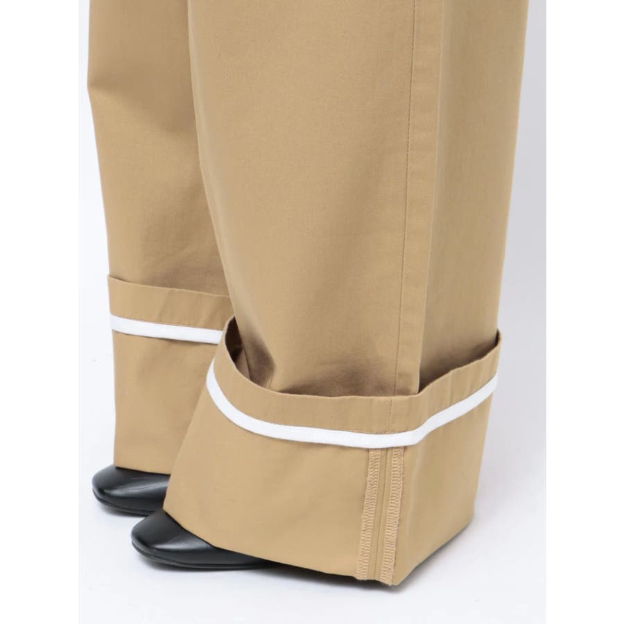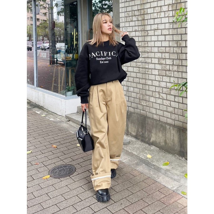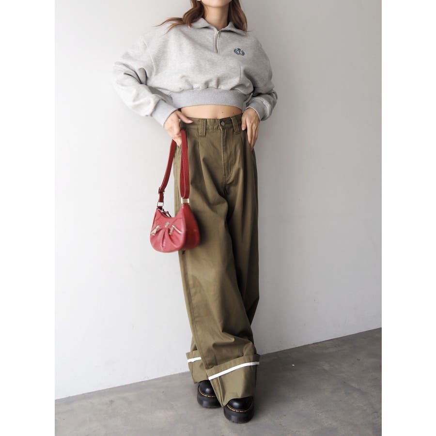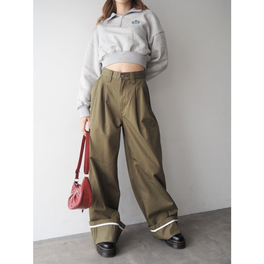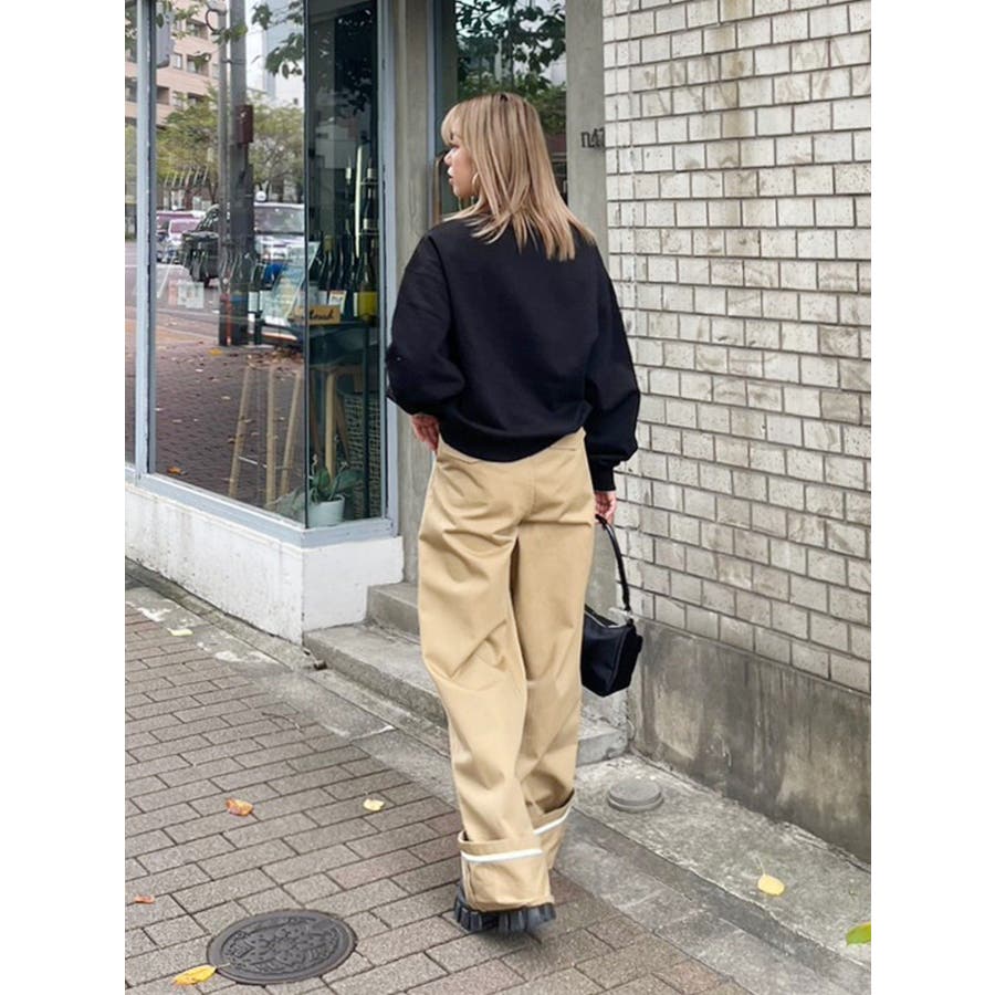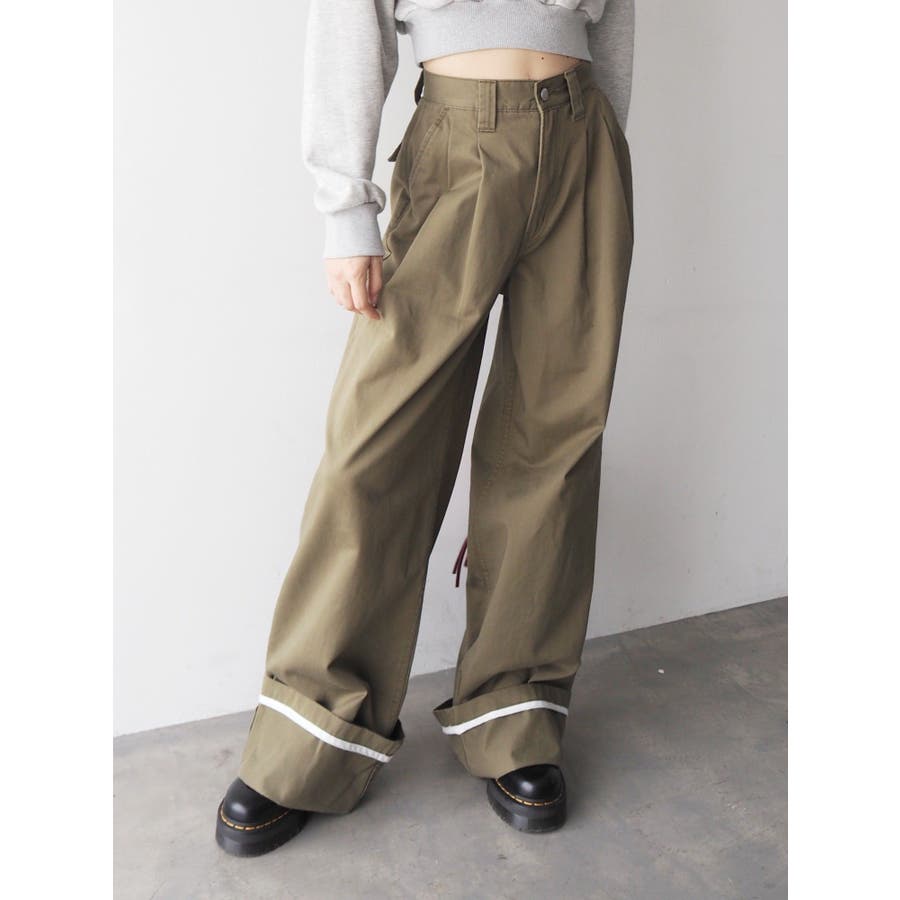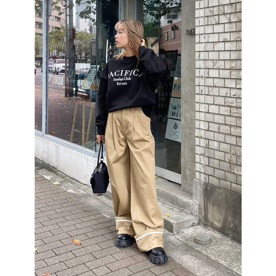 タックを入れて広めのヒップ幅にしており、たっぷりとしたボリュームが特徴的なワイドパンツです。裾の幅広めのロールアップもポイントです。カレッジアイテムなどと合わせてスクール風に合わせて着用するのがおすすめです。
