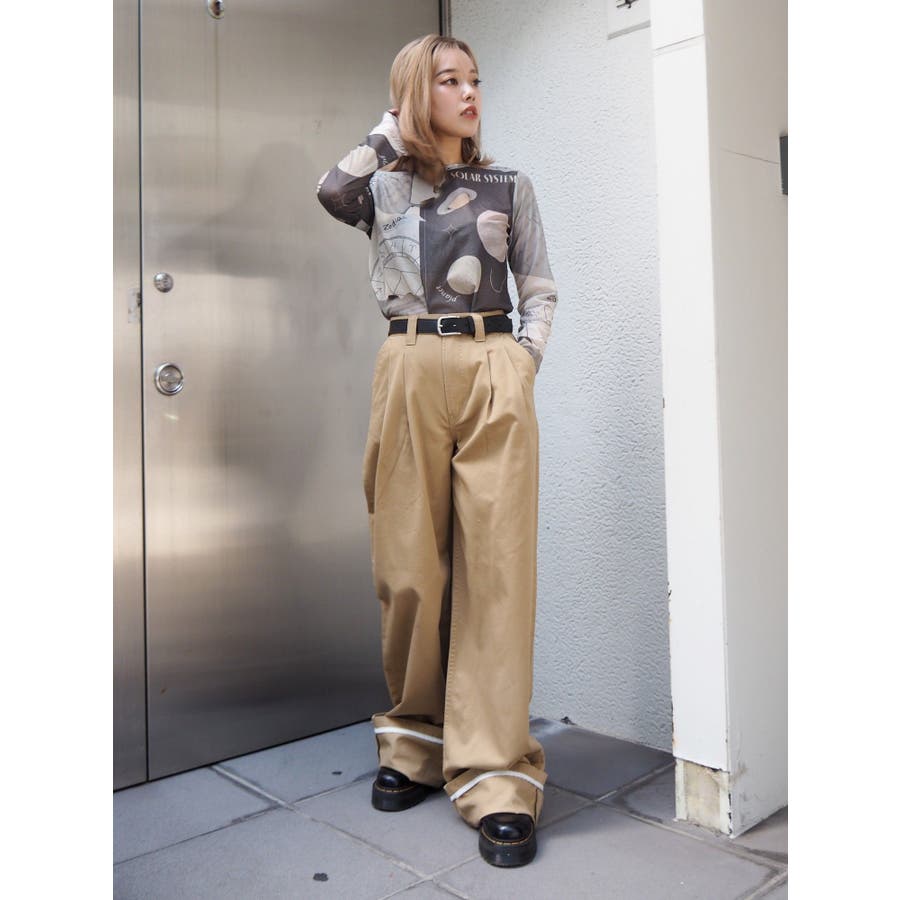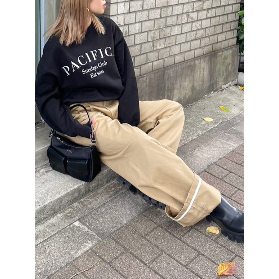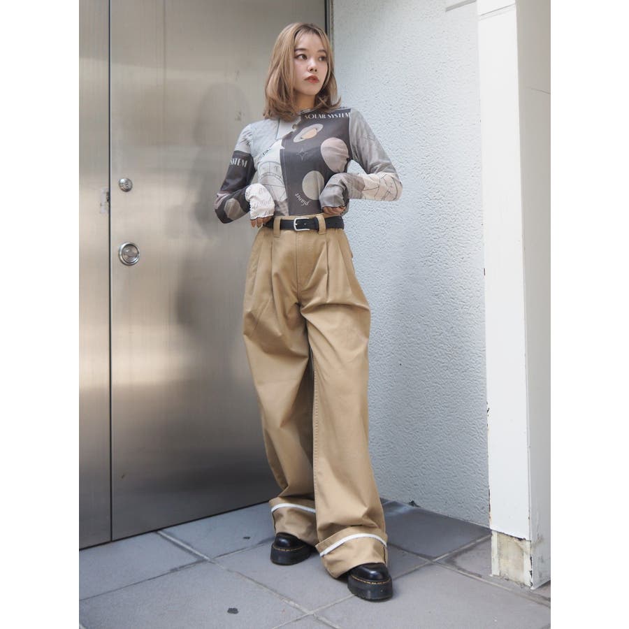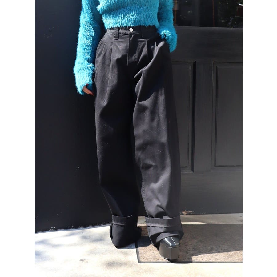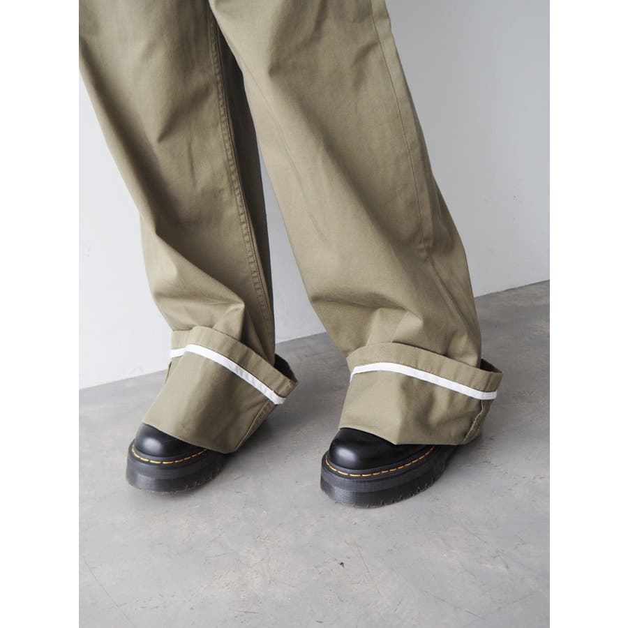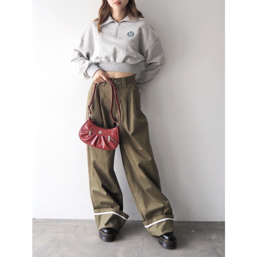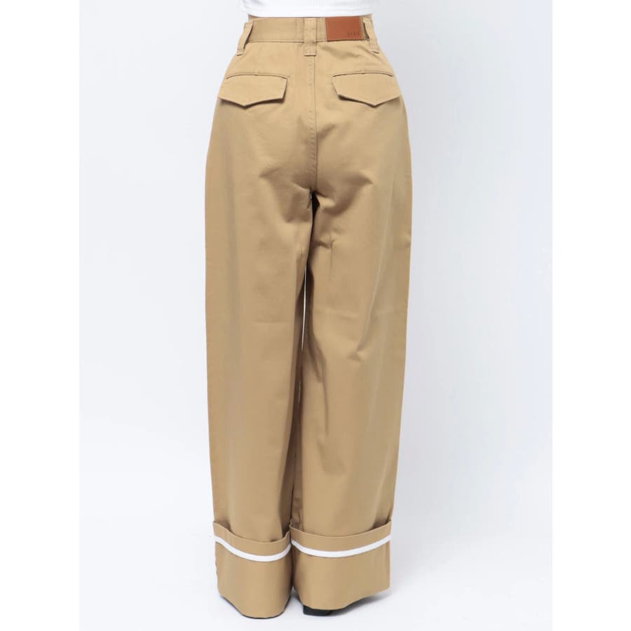 タックを入れて広めのヒップ幅にしており、たっぷりとしたボリュームが特徴的なワイドパンツです。裾の幅広めのロールアップもポイントです。カレッジアイテムなどと合わせてスクール風に合わせて着用するのがおすすめです。