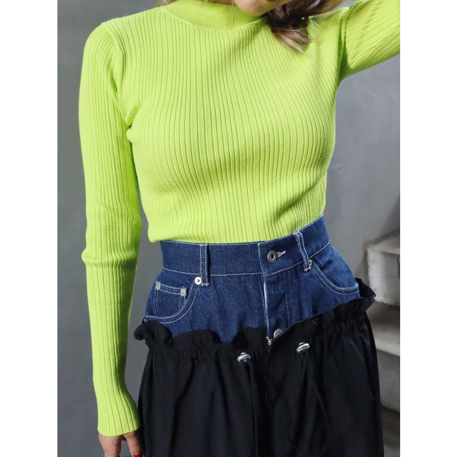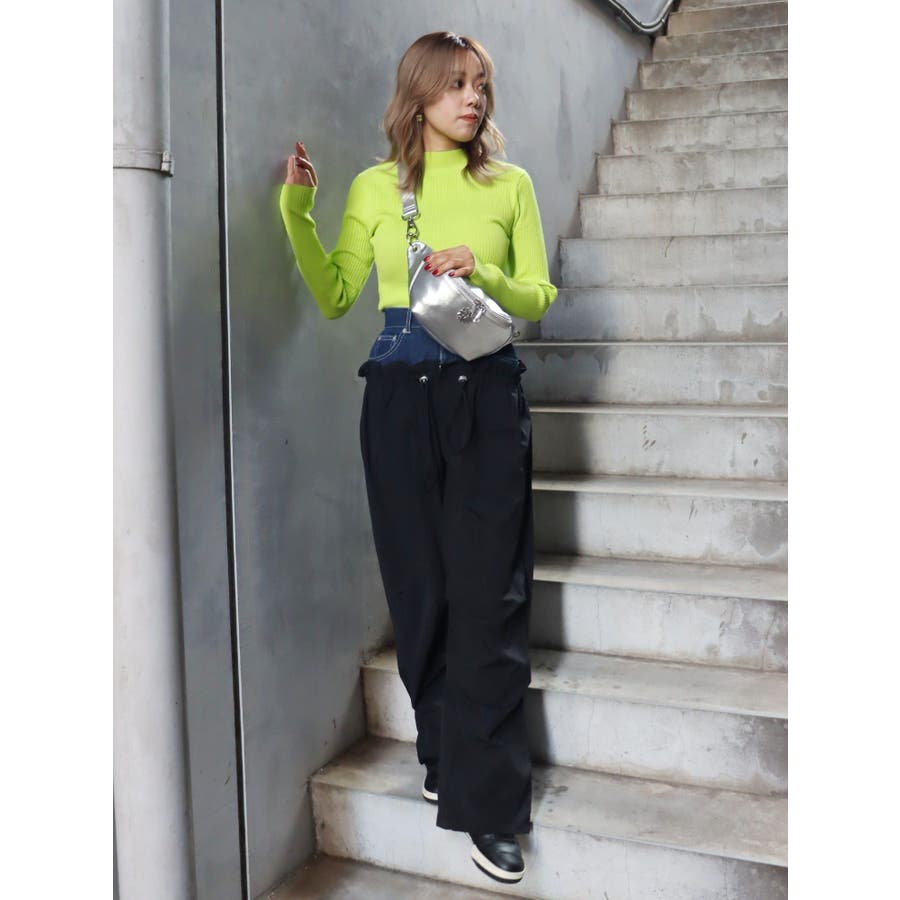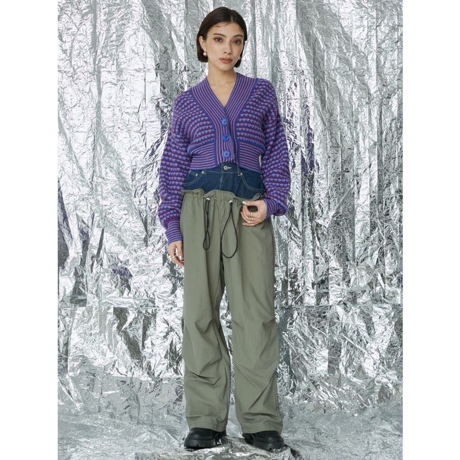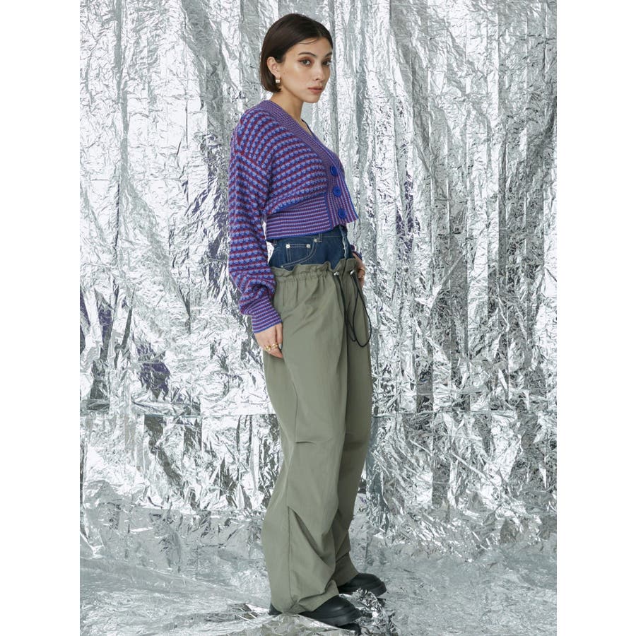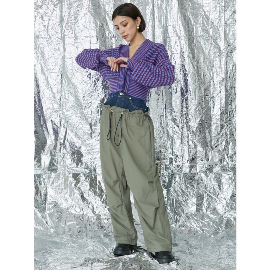 デニムをドッキングさせたデザインの個性的なパンツです。ドロストで絞れるデザインで少し調整することも可能です。ひざ部分にタックを入れており、ルーズなシルエットに仕上がっています。