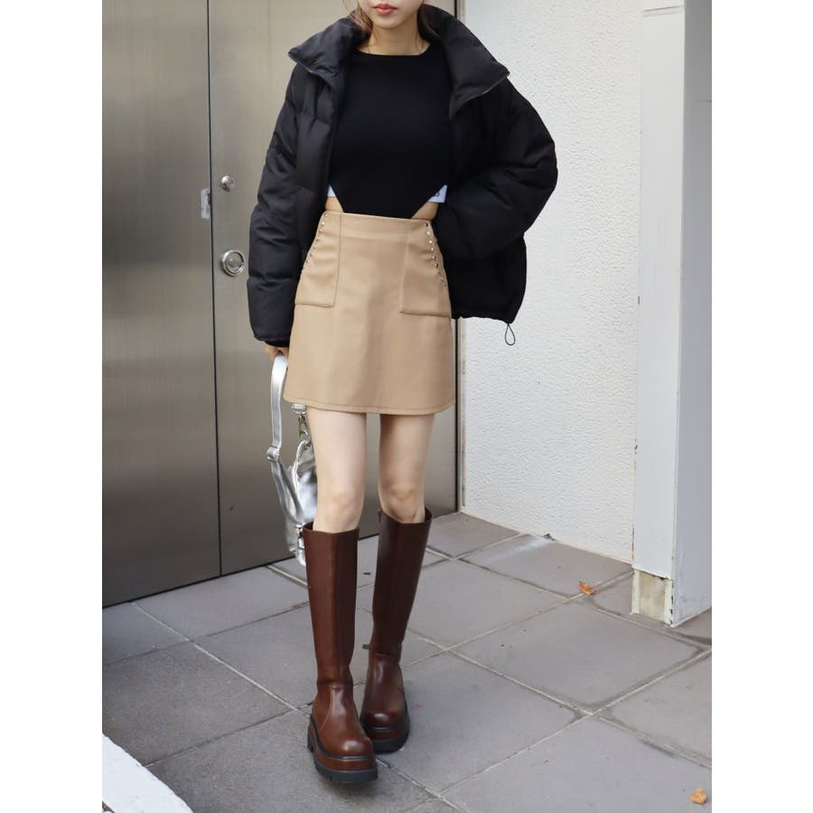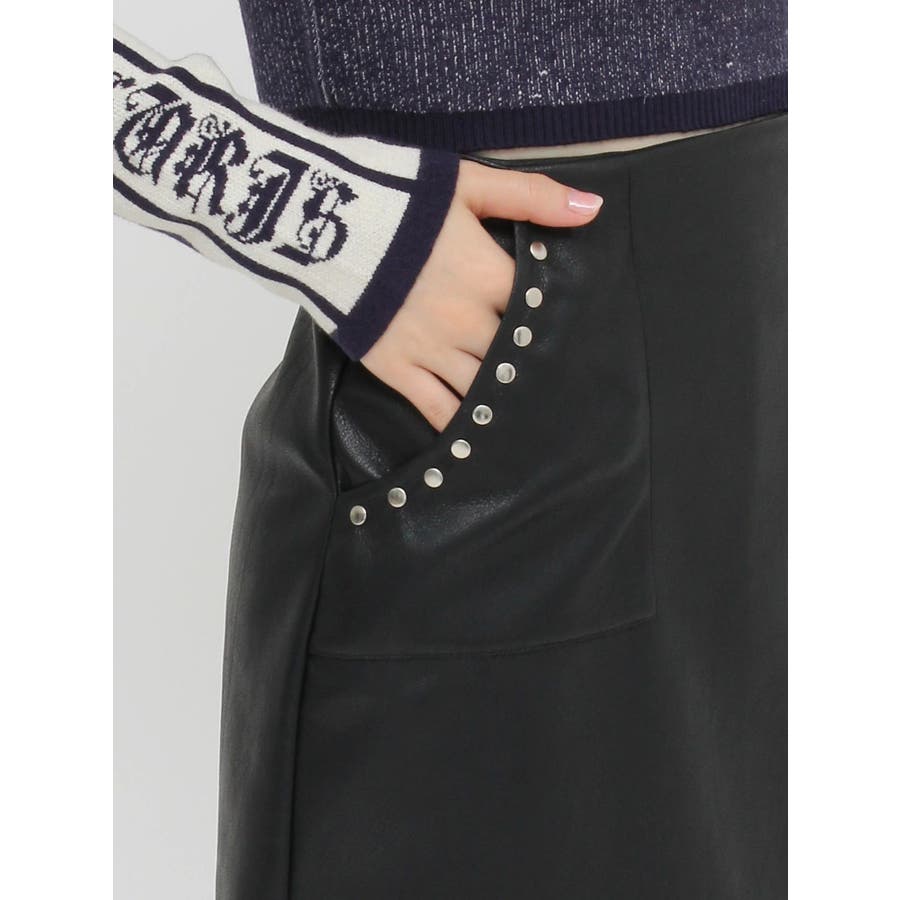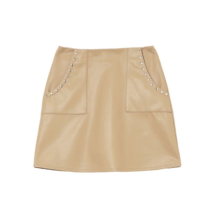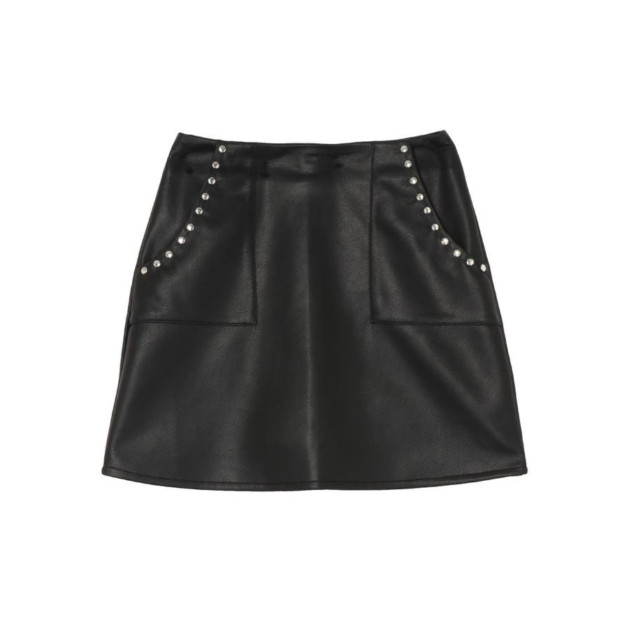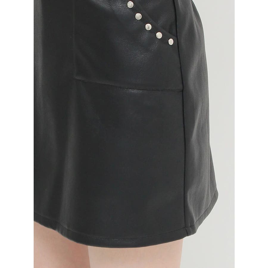ポケット口にスタッズを配置したミニスカートです。フェイクレザー素材を使用しておりクールな印象の一枚です。裏地はインナーショートパンツタイプになっており、ミニ丈でも安心して着用いただけます。