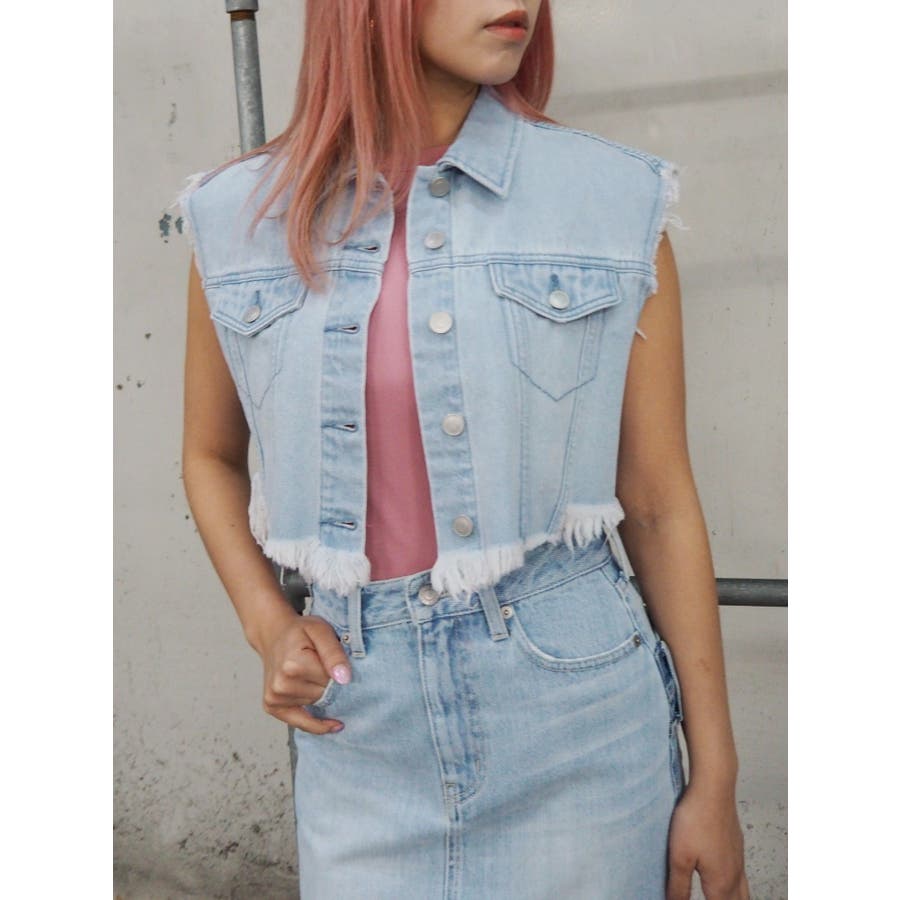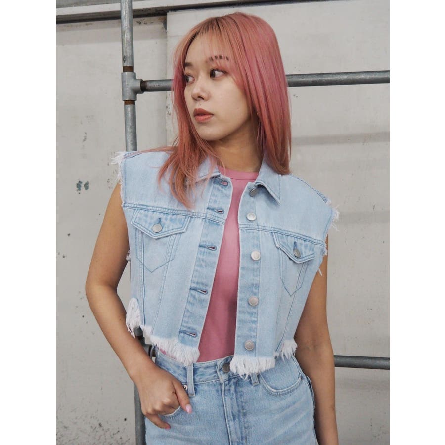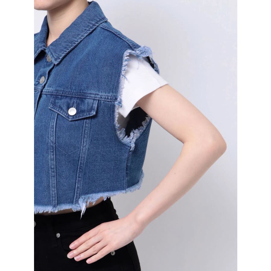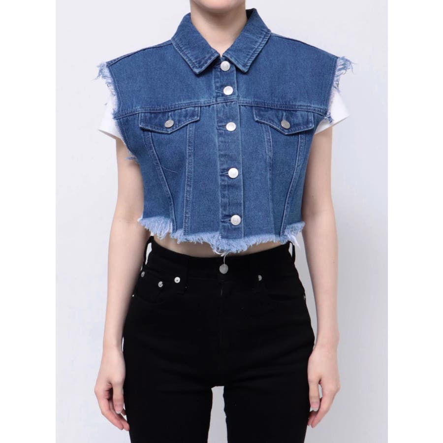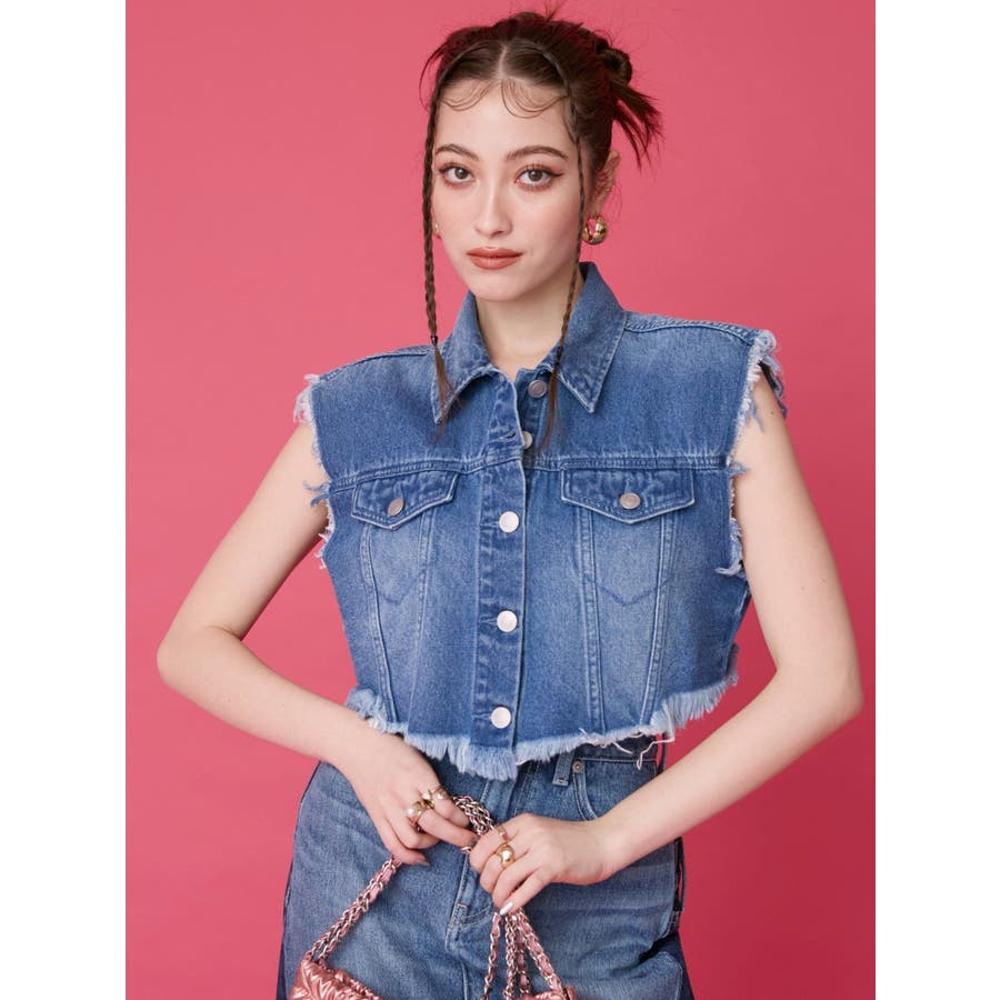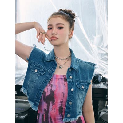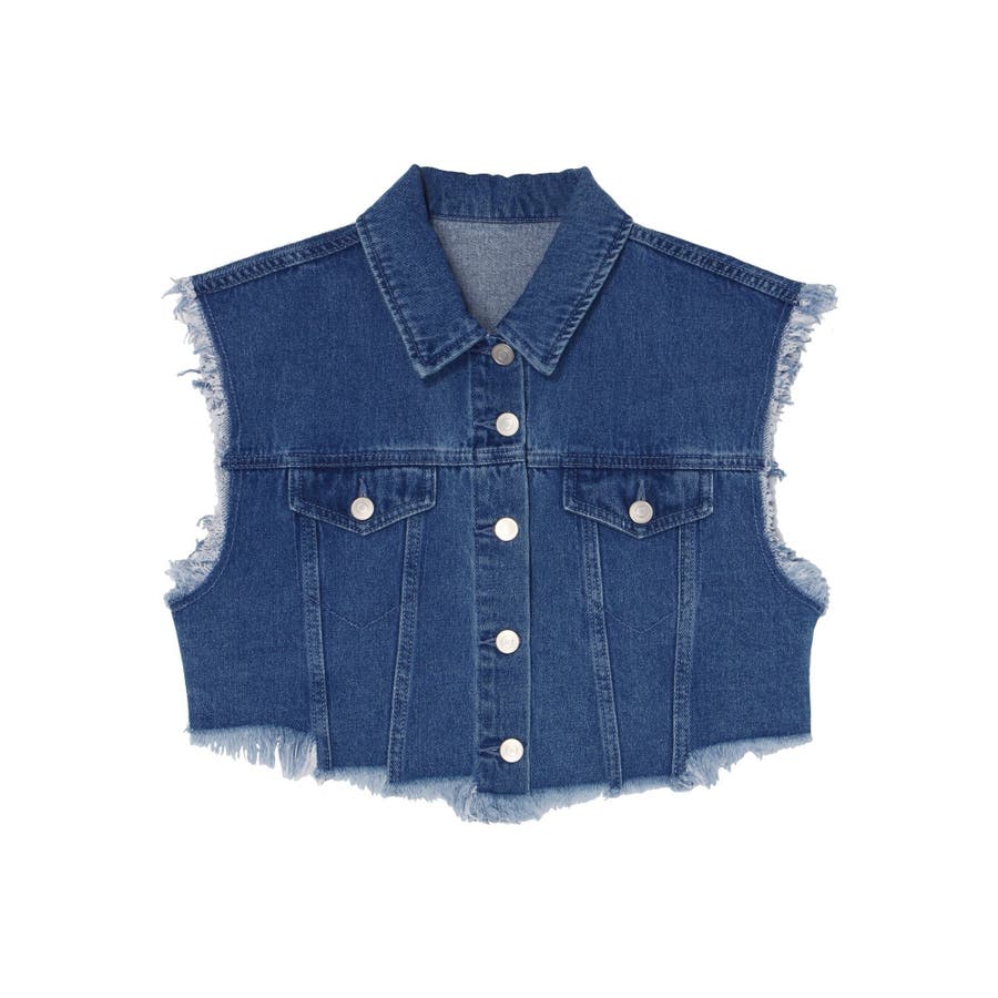 ■商品ポイント・そで&すそにトレンドのフリンジ○・コーディネートのプラスワンに!・デニムオンデニムにも取り入れやすい○・レイヤードでオールシーズン使える万能ITEM■商品について袖、裾のフリンジデザインがインパクトのあるデニムベストです。羽織としてもマルチに着回しできますが、クロップドなので1枚でTOPS風に着用したり、着回しの効く万能なブルゾンです。