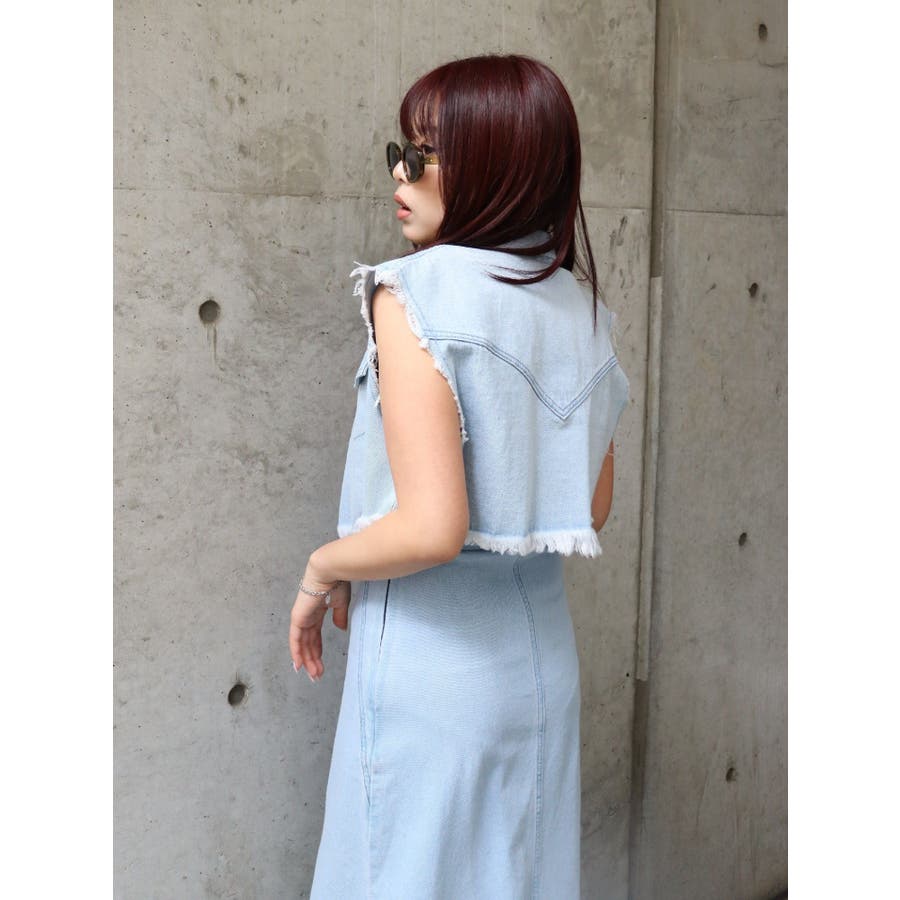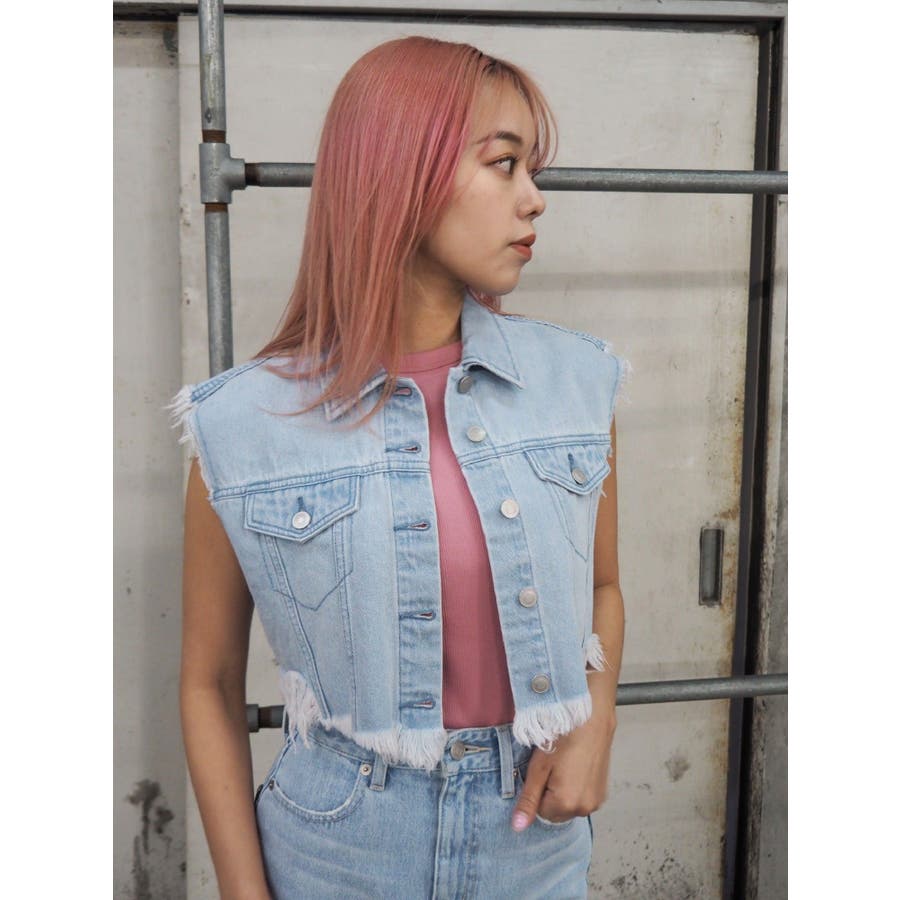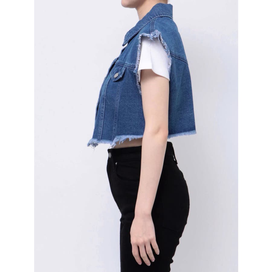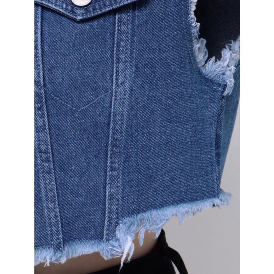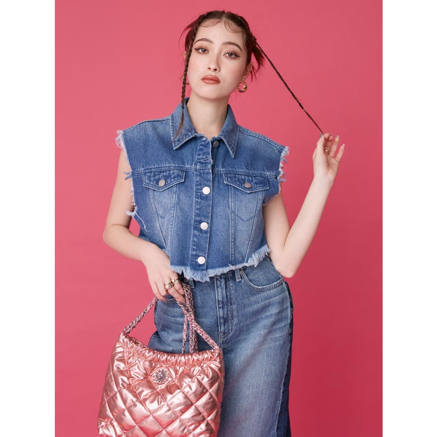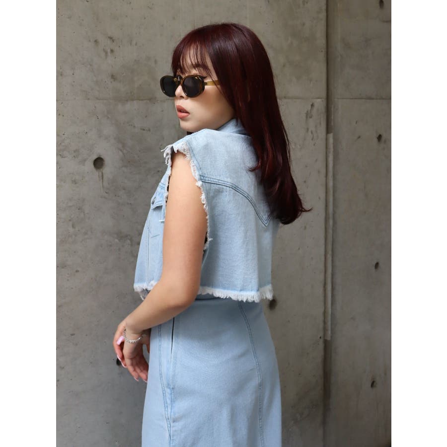 ■商品ポイント・そで&すそにトレンドのフリンジ○・コーディネートのプラスワンに!・デニムオンデニムにも取り入れやすい○・レイヤードでオールシーズン使える万能ITEM■商品について袖、裾のフリンジデザインがインパクトのあるデニムベストです。羽織としてもマルチに着回しできますが、クロップドなので1枚でTOPS風に着用したり、着回しの効く万能なブルゾンです。