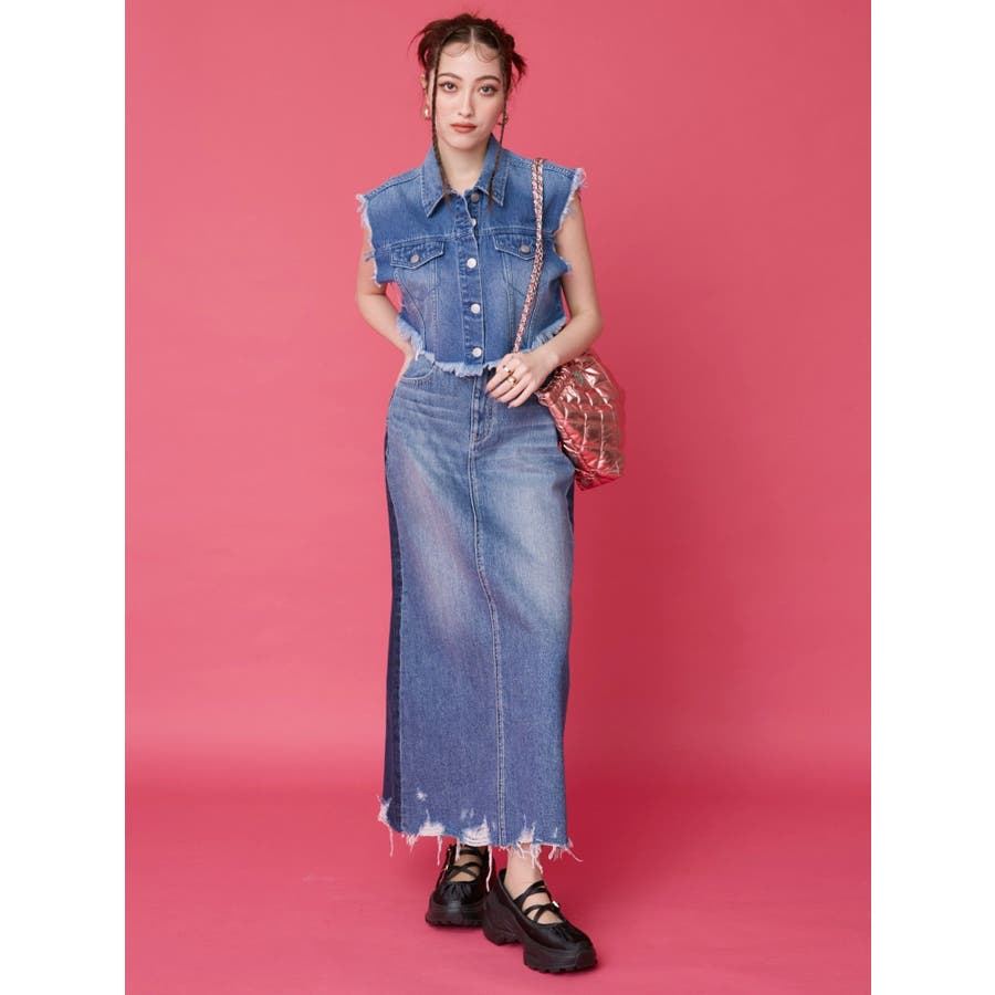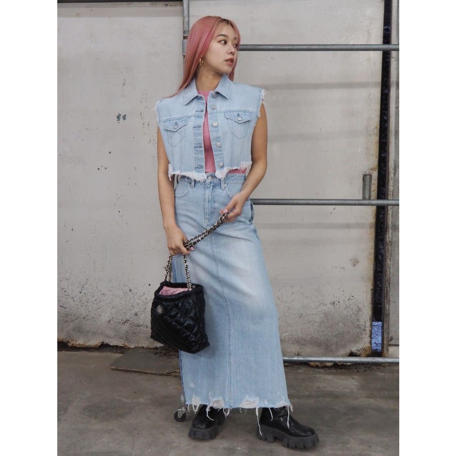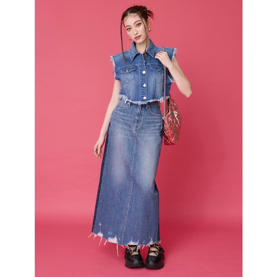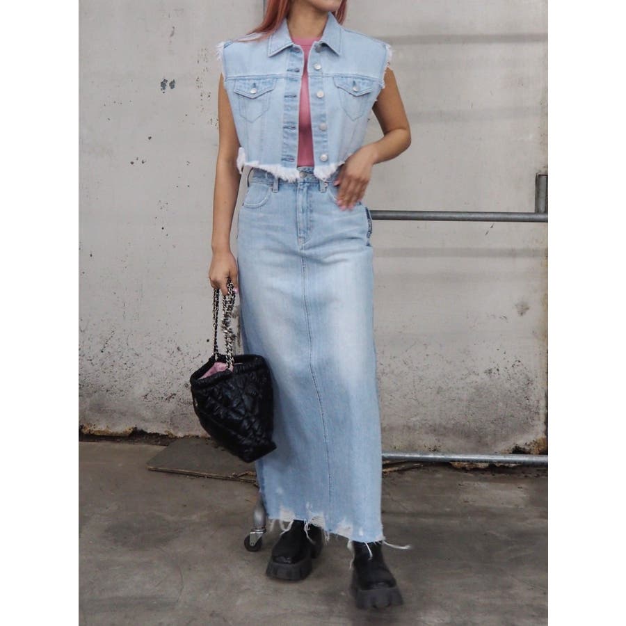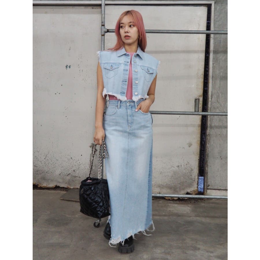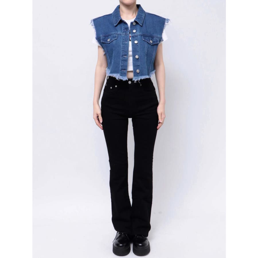 ■商品ポイント・そで&すそにトレンドのフリンジ○・コーディネートのプラスワンに!・デニムオンデニムにも取り入れやすい○・レイヤードでオールシーズン使える万能ITEM■商品について袖、裾のフリンジデザインがインパクトのあるデニムベストです。羽織としてもマルチに着回しできますが、クロップドなので1枚でTOPS風に着用したり、着回しの効く万能なブルゾンです。