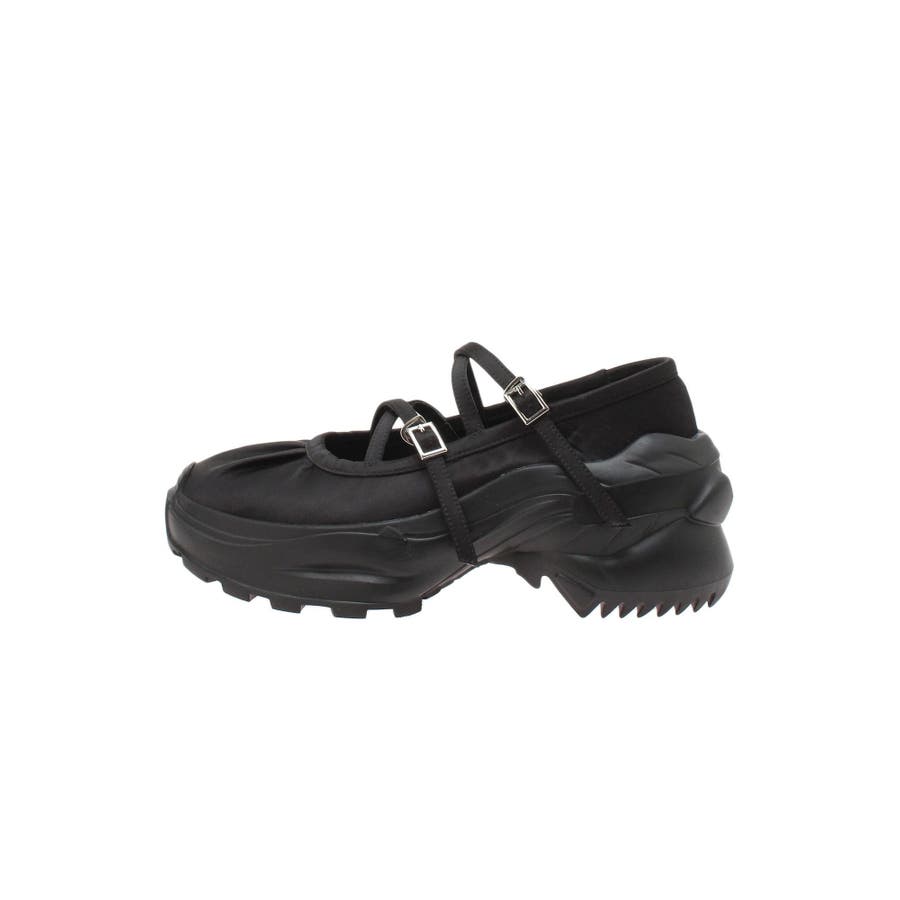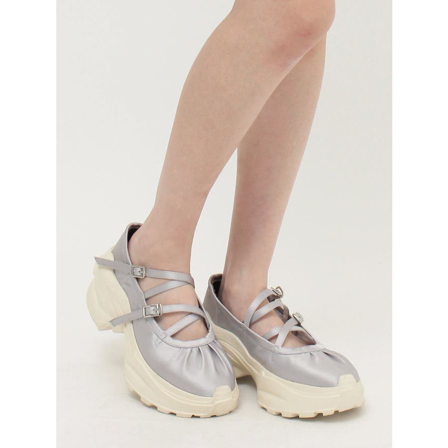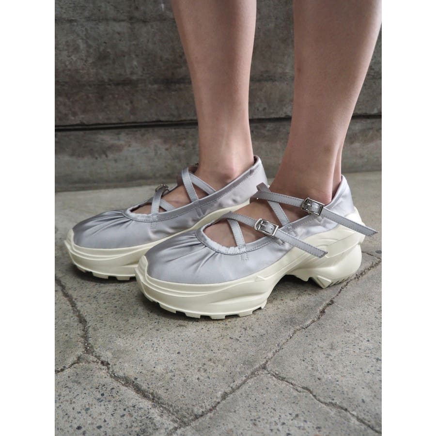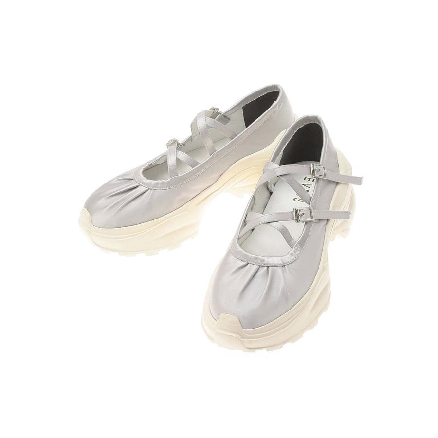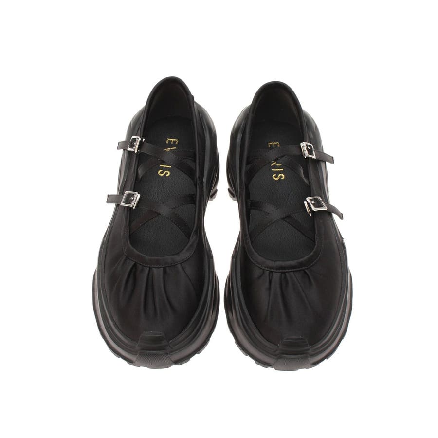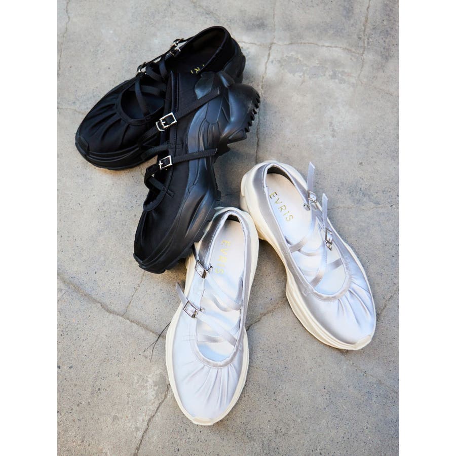 今季トレンドのバレエシューズをモチーフにしたデザインのメリージェーンスニーカーです上から見えるデザインはバレエシューズっぽく女性らしい印象ですが、ソールはEVRISで人気のスポーティー感ある厚底を使用しておりカジュアルに履いて頂けます。レースアップデザインがポイントなので、シアーソックスやルーズソックスなど靴下合わせのスタイリングがオススメです。
