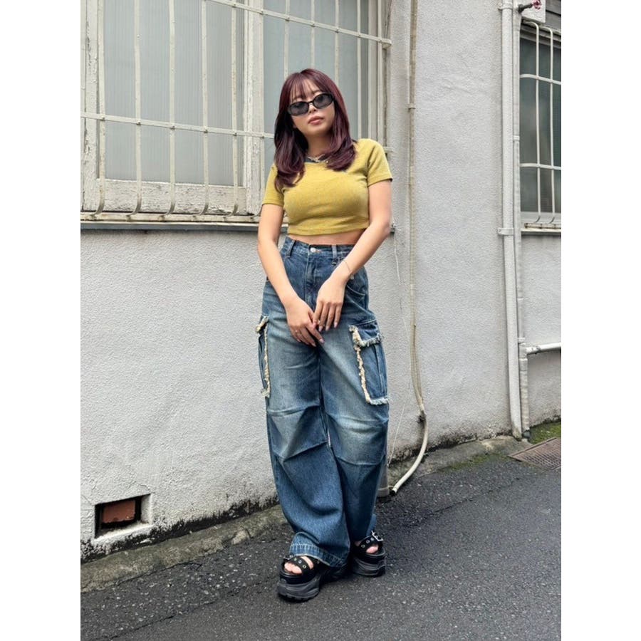 ■デザインサイドのフリンジ付きのカーゴポケットがポイントのデニムパンツです。まだまだトレンドのカーゴポケットに、今季のEVRIS(エヴリス)らしい、グランジっぽい雰囲気を取り入れました。オーバーダイをのせた、黄色味のあるカラーが今年らしくて◎。ひざ部分にはタックがはいっており、よりルーズなシルエットに仕上がっています。■スタイリングルーズなシルエットなボトムは、コンパクトなトップスとの合わせがおすすめです。-------------- 透け感:なし生地の厚み:普通伸縮性:なし --------------