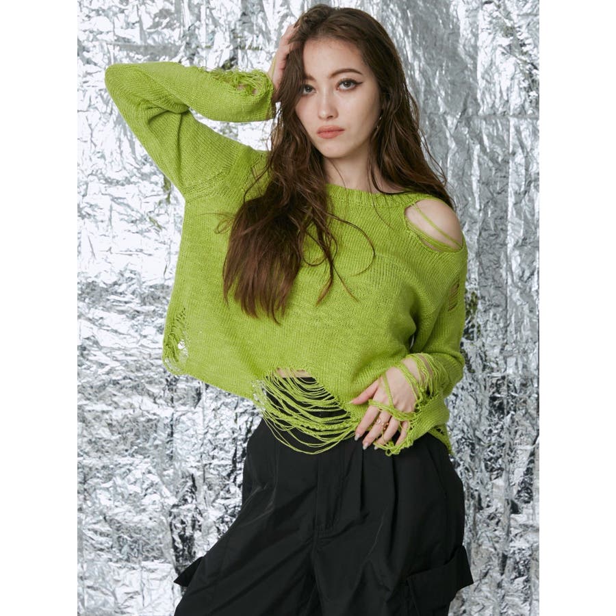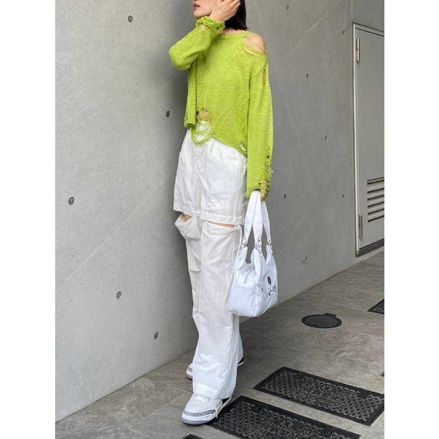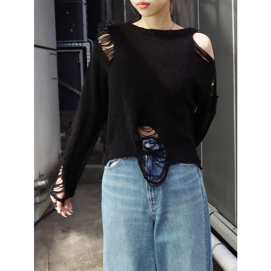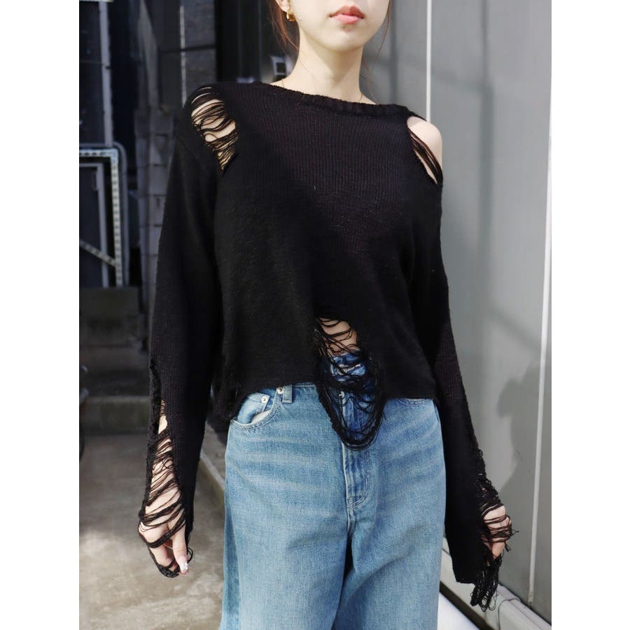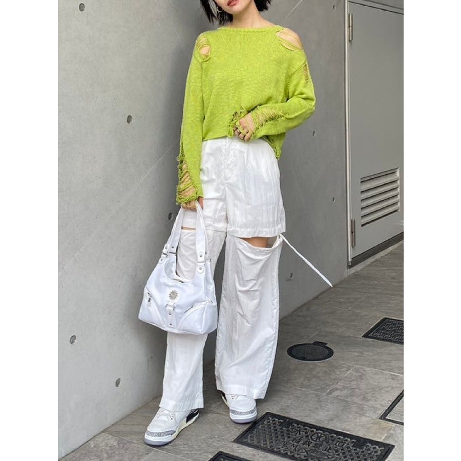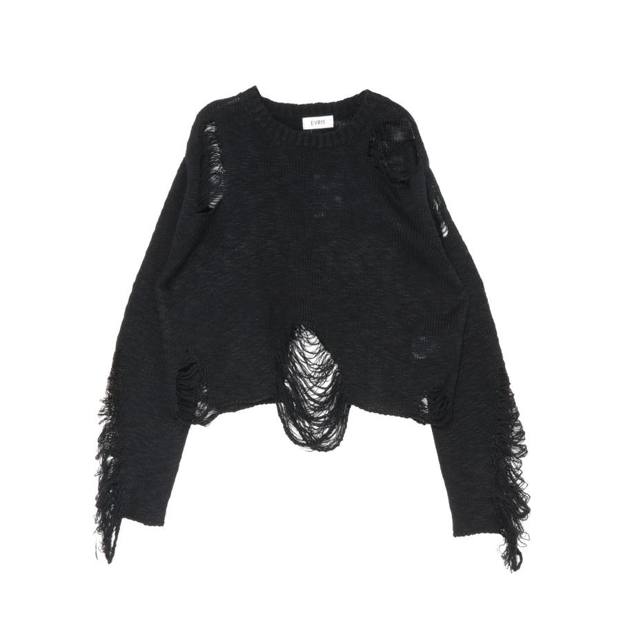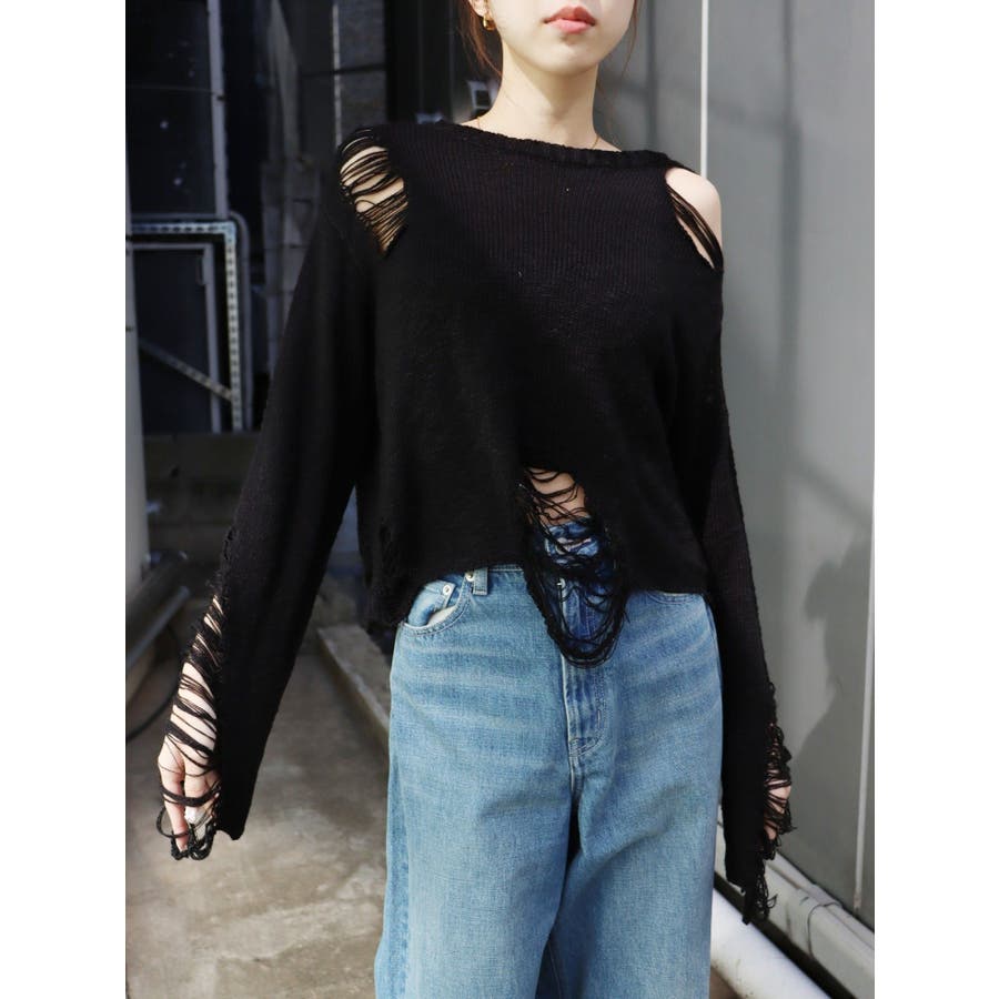 ■デザイン 昨年も大人気だった、全体的にダメージを施したニットトップスです。 エッジの効いた印象にするために、きつめにダメージが入っています。 ■スタイリング エッジのあるトップスにはシンプルなボトムやデニムがおすすめ。 ミニボトムでも雰囲気が出るのでコーデの幅が広がります。 ■おすすめスタイリングアイテム >>パラシュートパンツ-------------- 透け感:あり 裏地:なし 生地の厚み:普通 伸縮性:あり --------------